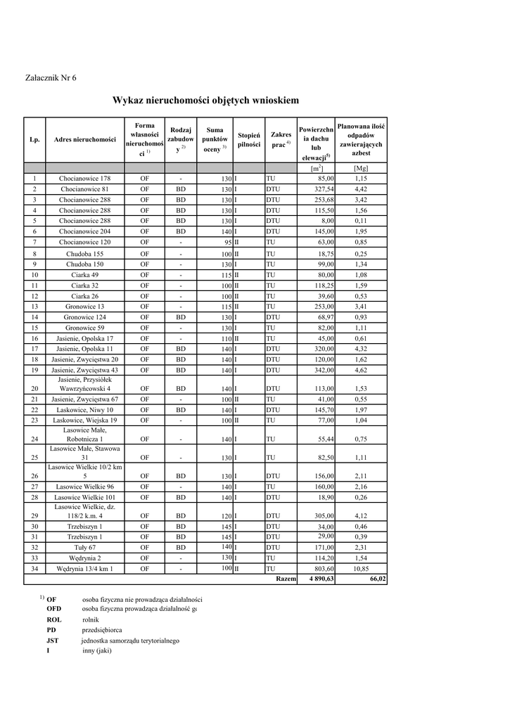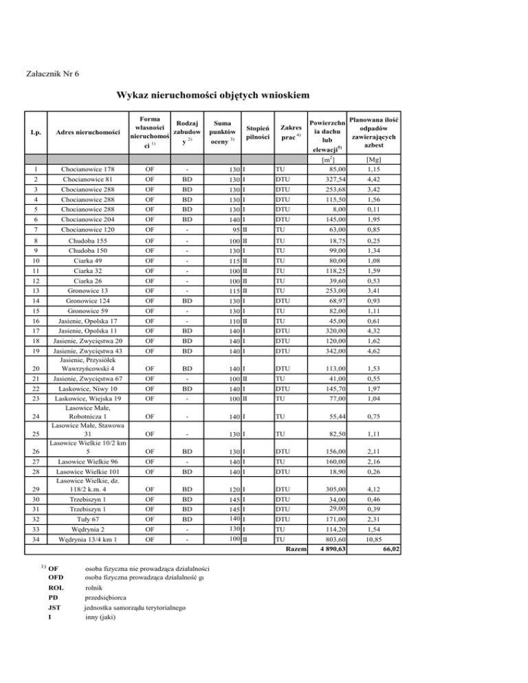 Załacznik Nr 6 Wykaz nieruchomości objętych wnioskiem Forma Rodzaj własności zabudow nieruchomoś y 2) ci 1) Suma punktów oceny 3) Stopień pilności Lp. Adres nieruchomości 1 Chocianowice 178 OF - 2 Chocianowice 81 OF BD 3 Chocianowice 288 OF BD 4 Chocianowice 288 OF BD 5 Chocianowice 288 OF BD 6 Chocianowice 204 OF BD 7 Chocianowice 120 OF - 95 II 8 Chudoba 155 OF - 9 Chudoba 150 OF - 10 Ciarka 49 OF - 11 Ciarka 32 OF - 12 Ciarka 26 OF - 13 Gronowice 13 OF - 14 Gronowice 124 OF BD 15 Gronowice 59 OF - 16 Jasienie, Opolska 17 OF - 17 Jasienie, Opolska 11 OF BD 18 Jasienie, Zwycięstwa 20 OF BD 19 OF BD 20 Jasienie, Zwycięstwa 43 Jasienie, Przysiółek Wawrzyńcowski 4 OF BD 21 Jasienie, Zwycięstwa 67 OF - 22 Laskowice, Niwy 10 OF BD 23 OF 26 Laskowice, Wiejska 19 Lasowice Małe, Robotnicza 1 Lasowice Małe, Stawowa 31 Lasowice Wielkie 10/2 km 5 27 Lasowice Wielkie 96 28 Zakres prac 4) Powierzchn Planowana ilość odpadów ia dachu zawierających lub azbest elewacji5) [Mg] [m2] 130 I 130 I TU 85,00 1,15 DTU 327,54 4,42 130 I 130 I DTU 253,68 3,42 DTU 115,50 1,56 130 I 140 I DTU 8,00 0,11 DTU 145,00 1,95 TU 63,00 0,85 100 II 130 I TU 18,75 0,25 TU 99,00 1,34 115 II 100 II TU 80,00 1,08 TU 118,25 1,59 100 II 115 II TU 39,60 0,53 TU 253,00 3,41 130 I 130 I DTU 68,97 0,93 TU 82,00 1,11 110 II 140 I TU 45,00 0,61 DTU 320,00 4,32 140 I 140 I DTU 120,00 1,62 DTU 342,00 4,62 140 I 100 II DTU 113,00 1,53 41,00 0,55 DTU 145,70 1,97 - 140 I 100 II TU 77,00 1,04 OF - 140 I TU 55,44 0,75 OF - 130 I TU 82,50 1,11 OF BD 156,00 2,11 - 130 I 140 I DTU OF TU 160,00 2,16 OF BD 140 I DTU 18,90 0,26 29 Lasowice Wielkie 101 Lasowice Wielkie, dz. 118/2 k.m. 4 OF BD 305,00 4,12 Trzebiszyn 1 OF BD 120 I 145 I DTU 30 DTU 0,46 31 Trzebiszyn 1 OF BD DTU 32 Tuły 67 OF BD DTU 171,00 2,31 33 Wędrynia 2 OF - 145 I 140 I 130 I 34,00 29,00 TU 114,20 1,54 34 Wędrynia 13/4 km 1 OF - 100 II TU 803,60 4 890,63 10,85 24 25 TU Razem 1) OF OFD osoba fizyczna nie prowadząca działalności osoba fizyczna prowadząca działalność gospodarczą ROL rolnik PD przedsiębiorca JST I jednostka samorządu terytorialnego inny (jaki) 0,39 66,02 2) BD budynek niezwiązany z prowadzoną działalnością gospodarczą lub rolniczą D budynek związany z prowadzoną działalnością gospodarczą lub rolniczą 3) suma punktów uzyskana w drodze oceny stanu i możliwości bezpiecznego użytkowania wyrobów zawierających azbest, dokonanej zgodnie z Rozporządzeniem Ministra Gospodarki z dnia 5 sierpnia 2010 r. zmieniające rozporządzenie w sprawie sposobów i warunków bezpiecznego użytkowania i usuwania wyrobów zawierających azbest (Dz. U. Nr 162, poz. 4) 1089) DTU w przypadku, gdy będzie realizowany demontaż, transport, unieszkodliwienie lub zabezpieczenie wyrobów azbestowych 5) TU w przypadku, gdy będzie realizowane tylko zbieranie, transport i unieszkodliwienie wyrobów azbestowych w przypadku demontazu wyrobów z dachu lub elewacji należy podać powierzchnię dachu lub elewacji (a nie powierzchnię wyrobów płyt). W przypadku zebrania wcześniej zdemontowanych wyrobów należy podac powierzchnię wyrobów (np. płyt) pieczęć firmowa