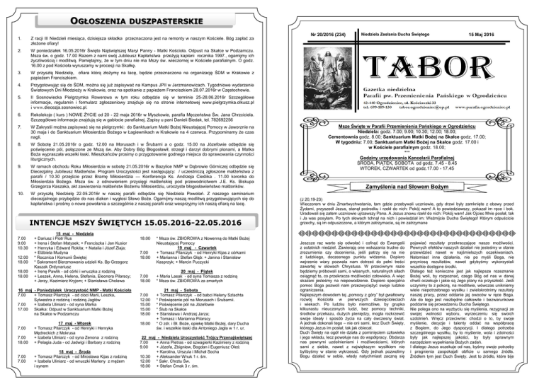OGŁOSZENIA DUSZPASTERSKIE 1. Z racji III Niedzieli miesi ca, dzisiejsza składka przeznaczona jest na remonty w naszym Ko ciele. Bóg zapłać za zło one ofiaryĄ 2. W poniedziałek 16.05.2016r więto Naj więtszej Maryi Panny - Matki Ko cioła. Odpust na Skałce w Podzamczu. Msza w. o godz. 17.00 Razem z nami swój Jubileusz Kapłaństwa prze yj kapłani rocznika 1997., ogarnijmy ich yczliwo ci i modlitw . Pamiętajmy, e w tym dniu nie ma Mszy w. wieczornej w Ko ciele parafialnym. O godz. 16.00 z pod Ko cioła wyruszamy w procesji na Skałkę. 3. W przyszł Niedzielę, ofiara któr papie em Żranciszkiem. 4. Przygotowuj c się do ŹM, mo na się ju zapisywać na Kampus JPII w Jerzmanowicach. Tygodniowe wydarzenie wiatowych Źni Młodzie y w Krakowie, oraz na spotkanie z papie em Żranciszkiem 28.07.2016r w Częstochowie. 5. II Sosnowiecka Pielgrzymka Rowerowa w tym roku odbędzie się w terminie 25-28.06.2016r Szczegółowe informacje, regulamin i formularz zgłoszeniowy znajduje się na stronie internetowej www.pielgrzymka.olkusz.pl i www.diecezja.sosnowiec.pl. 6. Rekolekcje ( kurs ) NOWź YCIź od 20 - 22 maja 2016r w Myszkowie, parafia Męczeństwa w. Jana Chrzciciela. Szczegółowe informacje znajduj się w gablocie parafialnej. Zapisy u pani Źanieli Biedak, tel. 782692256 7. W Zakrystii mo na zapisywać się na pielgrzymkiŚ do Sanktuarium Matki Bo ej Nieustaj cej Pomocy w Jaworznie na 30 maja i do Sanktuarium Miłosierdzia Bo ego w Łagiewnikach w Krakowie na 4 czerwca. Przypominamy e czas nagli. 8. W Sobotę 21.05.2016r o godz. 12.00 na Morusach i w rubarni a o godz. 15.00 na Józefowie odbędzie się po więcenie pól, poł czone ze Msz w. Aby Źobry Bóg Błogosławił, strzegł i darzył dobrymi plonami, a Matka Bo a wypraszała wszelki łaski. Mieszkańców prosimy o przygotowanie godnego miejsca do sprawowania czynno ci liturgicznych. 9. W ramach obchodu Roku Miłosierdzia w sobotę 21.05.2016r w Bazylice NMP w Ź browie żórniczej odbędzie się Źiecezjalny Jubileusz Mał eństw. Program Uroczysto ci jest następuj cyŚ / uczestnicz zgłoszone mał eństwa z parafii / 10.30 przej cie przez Bramę Miłosierdzia — Konferencja Ks. Andrzeja Cie lika . 11.00 koronka do Miłosierdzia Bo ego. Msza w. z odnowieniem przysięgi mał eńskiej pod przewodnictwem J.ź. Ks. Biskupa żrzegorza Kaszaka, akt zawierzenia mał eństw Bo emu Miłosierdziu, uroczyste błogosławieństwo mał onków. 10. zło ymy na tacę, będzie przeznaczona na organizację W przyszł Niedzielę 22.05.2016r w naszej parafii odbędzie się Niedziela Powołań. Z naszego seminarium diecezjalnego przybędzie do nas diakon i wygłosi Słowo Bo e. Ogarnijmy nasz modlitw przygotowuj cych się do kapłaństwa i pro my o nowe powołania a szczególnie z naszej parafii oraz wesprzyjmy ich nasz ofiar na tacę. 12.00 18.00 18.00 18.00 15 maj - Niedziela + Źariusz i Piotr Rus + Irena i Stefan Matysekś + Żranciszka i Jan Kusior + Henryka i źdward Rokitaś + Natalia i Józef Ziajaś + źl bieta Mudyna * Rocznica I Komunii więtej * Sakrament Bierzmowania udzieli Ks. Bp żrzegorz Kaszak Ordynariusz + Irenę Pawlik - od córki i wnuczka z rodzin + Leszek, Anna, Helena, Stefania, źleonora Pilarscyś + Jerzy, Kazimierz Kryjomś + Stanisława Cholewa 16 maj - Poniedziałek Uroczysto ć NMP - Matki Ko cioła 7.00 + Tomasz Pilarczyk - od cioci Marii, Leszka, Sylwestra z rodzin i rodzin Jagłów 7.00 + Izabela Uliniarz - od syna Marka 17.00 SkałkaŚ Odpust w Sanktuarium Matki Bo ej na Skałce w Podzamczu 7.00 7.00 18.00 7.00 7.00 17 maj - Wtorek + Tomasz Pilarczyk - od Henryki i Henryka Mędreckich z Mokrusa + Izabela Uliniarz - od syna Zenona z rodzin + Pelagia Juda - od Jadwigi i Barbary z rodzin 18 maj - roda + Tomasz Pilarczyk - od Mirosława Kijas z rodzin + Izabela Uliniarz - od wnuczki Marleny z mę em i synem 18.00 7.00 18.00 7.00 18.00 7.00 12.00 15.00 15.00 18.00 18.00 Niedziela Zesłania Ducha więtego 15 Maj 2016 ŹM w Krakowie z INTENCJE MSZY ŚWIĘTYCH 15.05.2016-22.05.2016 7.00 9.00 10.30 Nr 20/2016 (234) * Msza w. ZBIOROWA z Nowenn do Matki Bo ej Nieustaj cej Pomocy 19 maj - Czwartek + Tomasz Pilarczyk - od Henryki Kijas z córkami + Marianna i Stefan żł bŚ + Janina i Stanisław Kasprzykś + Marcin Puczycki 20 maj - Piątek + Maria Lasak - od syna Tomasza z rodzin * Msza w. ZBIOROWA za zmarłych 21 maj - Sobota + Tomasz Pilarczyk - od babci Heleny Szlachta * Po więcenie pól na Morusach i rubarnii. * Po więcenie pól na Józefowie * lub na Skałce + Stanisława i Andrzej Jarzaś + Tomasz i Marianna Pilarscy * O zdr. i Bł. Bo e, opiekę Matki Bo ej, dary Źucha w. i wszelkie łaski dla Antoniego Jagła w 1 r. ur. 22 maj - Niedziela Uroczysto ć Trójcy Przenaj więtszej 7.00 + Anna Pietras - od szwagierki Kazimiery z rodzin 9.00 + Józefa, Zbigniew, Bogdan i źugeniusz Ole Ś + Karolina, Urszula i Michał Socha 10.30 + Aleksander Wnuk 1 r. m. 12.00 * Sakr. Chrztu w. 18.00 + Stefan Ćmak 3 r. m. Msze więte w Parafii Przemienienia Pańskiego w Ogrodzieńcu NiedzielaŚ godz. 7.00ś 9.00ś 10.30ś 12.00ś 18.00ś Cementownia godz. 8.00ś Sanktuarium Matki Bożej na Skałce godz. 17.00ś W tygodniuŚ 7.00ś Sanktuarium Matki Bożej na Skałce godz. 17.00 i w Ko ciele parafialnym godz. 18.00ś *** Godziny urzędowania Kancelarii Parafialnej ROŹA, PI TźK, SOBOTA od godz. 7.45 - 8.45 WTORźK, CZWARTźK od godz.17.00 - 17.45 Zamy lenia nad Słowem Bożym (J 20,19-23) Wieczorem w dniu Zmartwychwstania, tam gdzie przebywali uczniowie, gdy drzwi były zamknięte z obawy przed ydami, przyszedł Jezus, stan ł po rodku i rzekł do nichŚ Pokój wamĄ A to powiedziawszy, pokazał im ręce i bok. Uradowali się zatem uczniowie ujrzawszy Pana. A Jezus znowu rzekł do nichŚ Pokój wamĄ Jak Ojciec Mnie posłał, tak i Ja was posyłam. Po tych słowach tchn ł na nich i powiedział imŚ We mijcie Źucha więtegoĄ Którym odpu cicie grzechy, s im odpuszczone, a którym zatrzymacie, s im zatrzymane Jeszcze raz war