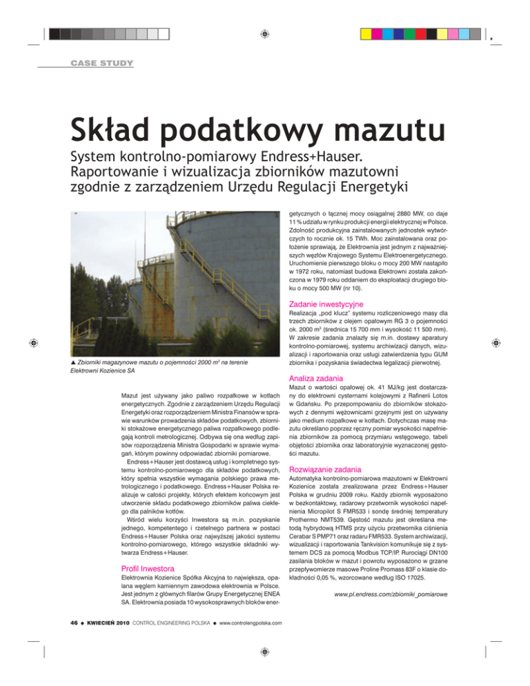 CASE STUDY Skãad podatkowy mazutu System kontrolno-pomiarowy Endress+Hauser. Raportowanie i wizualizacja zbiorników mazutowni zgodnie z zarzĎdzeniem Urzēdu Regulacji Energetyki getycznych o łącznej mocy osiągalnej 2880 MW, co daje 11 % udziału w rynku produkcji energii elektrycznej w Polsce. Zdolność produkcyjna zainstalowanych jednostek wytwórczych to rocznie ok. 15 TWh. Moc zainstalowana oraz położenie sprawiają, że Elektrownia jest jednym z najważniejszych węzłów Krajowego Systemu Elektroenergetycznego. Uruchomienie pierwszego bloku o mocy 200 MW nastąpiło w 1972 roku, natomiast budowa Elektrowni została zakończona w 1979 roku oddaniem do eksploatacji drugiego bloku o mocy 500 MW (nr 10). Zadanie inwestycyjne S Zbiorniki magazynowe mazutu o pojemności 2000 m3 na terenie Elektrowni Kozienice SA Realizacja „pod klucz” systemu rozliczeniowego masy dla trzech zbiorników z olejem opałowym RG 3 o pojemności ok. 2000 m3 (średnica 15 700 mm i wysokość 11 500 mm). W zakresie zadania znalazły się m.in. dostawy aparatury kontrolno-pomiarowej, systemu archiwizacji danych, wizualizacji i raportowania oraz usługi zatwierdzenia typu GUM zbiornika i pozyskania świadectwa legalizacji pierwotnej. Analiza zadania Mazut jest używany jako paliwo rozpałkowe w kotłach energetycznych. Zgodnie z zarządzeniem Urzędu Regulacji Energetyki oraz rozporządzeniem Ministra Finansów w sprawie warunków prowadzenia składów podatkowych, zbiorniki stokażowe energetycznego paliwa rozpałkowego podlegają kontroli metrologicznej. Odbywa się ona według zapisów rozporządzenia Ministra Gospodarki w sprawie wymagań, którym powinny odpowiadać zbiorniki pomiarowe. Endress+Hauser jest dostawcą usług i kompletnego systemu kontrolno-pomiarowego dla składów podatkowych, który spełnia wszystkie wymagania polskiego prawa metrologicznego i podatkowego. Endress+Hauser Polska realizuje w całości projekty, których efektem końcowym jest utworzenie składu podatkowego zbiorników paliwa ciekłego dla palników kotłów. Wśród wielu korzyści Inwestora są m.in. pozyskanie jednego, kompetentego i rzetelnego partnera w postaci Endress+Hauser Polska oraz najwyższej jakości systemu kontrolno-pomiarowego, którego wszystkie składniki wytwarza Endress+Hauser. Profil Inwestora Elektrownia Kozienice Spółka Akcyjna to największa, opalana węglem kamiennym zawodowa elektrownia w Polsce. Jest jednym z głównych filarów Grupy Energetycznej ENEA SA. Elektrownia posiada 10 wysokosprawnych bloków ener46 l KWIECIEŃ 2010 CONTROL ENGINEERING POLSKA l www.controlengpolska.com Mazut o wartości opałowej ok. 41 MJ/kg jest dostarczany do elektrowni cysternami kolejowymi z Rafinerii Lotos w Gdańsku. Po przepompowaniu do zbiorników stokażowych z dennymi wężownicami grzejnymi jest on używany jako medium rozpałkowe w kotłach. Dotychczas masę mazutu określano poprzez ręczny pomiar wysokości napełnienia zbiorników za pomocą przymiaru wstęgowego, tabeli objętości zbiornika oraz laboratoryjnie wyznaczonej gęstości mazutu. Rozwiązanie zadania Automatyka kontrolno-pomiarowa mazutowni w Elektrowni Kozienice została zrealizowana przez Endress+Hauser Polska w grudniu 2009 roku. Każdy zbiornik wyposażono w bezkontaktowy, radarowy przetwornik wysokości napełnienia Micropilot S FMR533 i sondę średniej temperatury Prothermo NMT539. Gęstość mazutu jest określana metodą hybrydową HTMS przy użyciu przetwornika ciśnienia Cerabar S PMP71 oraz radaru FMR533. System archiwizacji, wizualizacji i raportowania Tankvision komunikuje się z systemem DCS za pomocą Modbus TCP/IP. Rurociągi DN100 zasilania bloków w mazut i powrotu wyposażono w grzane przepływomierze masowe Proline Promass 83F o klasie dokładności 0,05 %, wzorcowane według ISO 17025. www.pl.endress.com/zbiorniki_pomiarowe CASE STUDY S System Endress+Hauser w mazutowni Elektrowni Kozienice SA Endress+Hauser Polska sp. z o.o. • ul. Wołowska 11 • 51-116 Wrocław • http://www.pl.endress.com • e-mail: [email protected] www.controlengpolska.com l CONTROL ENGINEERING POLSKA KWIECIEŃ 2010 l 47