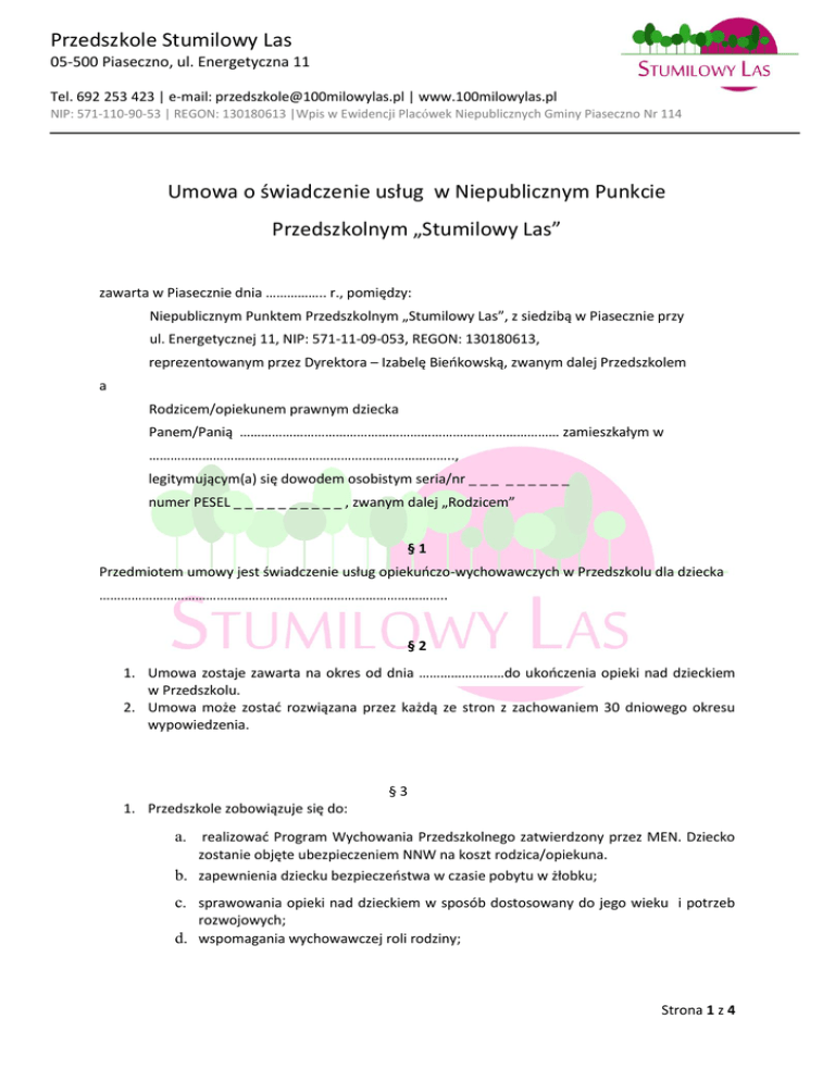 Przedszkole Stumilowy Las 05-500 Piaseczno, ul. Energetyczna 11 Tel. 692 253 423 | e-mail: [email protected] | www.100milowylas.pl NIP: 571-110-90-53 | REGON: 130180613 |Wpis w Ewidencji Placówek Niepublicznych Gminy Piaseczno Nr 114 Umowa o świadczenie usług w Niepublicznym Punkcie Przedszkolnym „Stumilowy Las” zawarta w Piasecznie dnia …………….. r., pomiędzy: Niepublicznym Punktem Przedszkolnym „Stumilowy Las”, z siedzibą w Piasecznie przy ul. Energetycznej 11, NIP: 571-11-09-053, REGON: 130180613, reprezentowanym przez Dyrektora – Izabelę Bieńkowską, zwanym dalej Przedszkolem a Rodzicem/opiekunem prawnym dziecka Panem/Panią ……………………………………………………………………………… zamieszkałym w ………………………………………………………………………….., legitymującym(a) się dowodem osobistym seria/nr _ _ _ _ _ _ _ _ _ numer PESEL _ _ _ _ _ _ _ _ _ _ , zwanym dalej „Rodzicem” §1 Przedmiotem umowy jest świadczenie usług opiekuńczo-wychowawczych w Przedszkolu dla dziecka …………………………………………………………………………………….. §2 1. Umowa zostaje zawarta na okres od dnia ……………………do ukończenia opieki nad dzieckiem w Przedszkolu. 2. Umowa może zostać rozwiązana przez każdą ze stron z zachowaniem 30 dniowego okresu wypowiedzenia. §3 1. Przedszkole zobowiązuje się do: a. realizować Program Wychowania Przedszkolnego zatwierdzony przez MEN. Dziecko zostanie objęte ubezpieczeniem NNW na koszt rodzica/opiekuna. b. zapewnienia dziecku bezpieczeństwa w czasie pobytu w żłobku; c. sprawowania opieki nad dzieckiem w sposób dostosowany do jego wieku i potrzeb rozwojowych; d. wspomagania wychowawczej roli rodziny; Strona 1 z 4 Przedszkole Stumilowy Las 05-500 Piaseczno, ul. Energetyczna 11 Tel. 692 253 423 | e-mail: [email protected] | www.100milowylas.pl NIP: 571-110-90-53 | REGON: 130180613 |Wpis w Ewidencji Placówek Niepublicznych Gminy Piaseczno Nr 114 2. W ramach czesnego Przedszkole umożliwia dziecku uczestnictwo w następujących zajęciach, w zależności od wieku dziecka: a. j. angielski; b. zaj. teatralne c. rytmika; d. opieka logopedyczna; e. gimnastyka; f. terapia ręki; g. imprezy okolicznościowe, uroczystości odbywające się na terenie placówki i poza nią. 3. W okresie wakacyjnym, tzn. od lipca do sierpnia, Przedszkole „Stumilowy Las” sprawuje wyłącznie funkcję opiekuńczo – wychowawczą. W tym okresie nie są realizowane usługi i zajęcia wynikające z §3, pkt. 2 niniejszej umowy. 4. Przedszkole „Stumilowy Las” jest czynny od poniedziałku do piątku w godzinach od 700 do 1800, z wyłączeniem świąt oraz wigilii Bożego Narodzenia. 5. Przedszkole zapewnia 5 posiłków dziennie, z wyłączeniem pobytu na niepełny etat: a. I śniadanie; b. II śniadanie; c. Obiad – I i II danie; d. Podwieczorek §4 Rodzice zobowiązują się do: 1. Osobistego przyprowadzania dziecka do Przedszkola i odebrania go po zakończeniu zajęć lub pisemnego upoważnienia do tego osoby trzeciej (ww. osoba musi być pełnoletnia). 2. Przyprowadzenia do Przedszkola dziecka zdrowego i zdolnego do zajęć. 3. Informowania Dyrektora lub nauczyciela grupy o przyczynach nieobecności dziecka w Przedszkolu trwającego powyżej pięciu dni. 4. Terminowego uiszczania do 5 dnia każdego miesiąca, z góry, miesięcznej opłaty za Przedszkole. 5. Wpłacenia przy podpisaniu umowy, jednorazowej, bezzwrotnej opłaty wpisowej w wysokości 500 zł (słownie: pięćset złotych). §5 Usługi świadczone w Przedszkolu „Stumilowy Las” są odpłatne. 1. Rodzic zobowiązany jest do wnoszenia na rzecz Przedszkola następujących opłat: a. Comiesięczna opłata czesnego, płatna przez 12 miesięcy kalendarzowych. Czesne płatne jest z góry do piątego dnia każdego miesiąca za dany miesiąc na wskazane konto bankowe lub gotówką w biurze Przedszkola Strona 2 z 4 Przedszkole Stumilowy Las 05-500 Piaseczno, ul. Energetyczna 11 Tel. 692 253 423 | e-mail: [email protected] | www.100milowylas.pl NIP: 571-110-90-53 | REGON: 130180613 |Wpis w Ewidencji Placówek Niepublicznych Gminy Piaseczno Nr 114 Nr konta: 88 1240 3217 1111 0010 5620 5773 b. Opłaty wpisowej, która jest bezzwrotna. 2. Wysokość opłat obowiązujących na dany rok oświatowy ustala Dyrektor Przedszkola i podawany jest do wiadomości rodziców na piśmie lub na stronie internetowej Przedszkola (www.100milowylas.pl). 3. Opłaty na rok oświatowy 2016/2017 wynoszą: a. wpisowe : 500,00 zł (słownie: pięćset złotych); b. czesne miesięczne 750,00 zł (słownie: siedemset pięćdziesiąt złotych) za pełny etat + stawka żywieniowa 7 zł dziennie lub 650,00 zł (słownie: sześćset pięćdziesiąt złotych) za pół etatu (za pobyt dziecka do 5 godzin dziennie) + stawka żywieniowa 5 zł dziennie, 500,00 zł (słownie pięćset złotych) + stawka żywieniowa 3,50 zł dziennie. c. …………………………………………………………………………….. 4. Przedszkole zastrzega sobie prawo do zmiany opłat za kolejne lata opieki nad dzieckiem. Opłaty ustalane są na rok oświatowy, a ich wysokość podawana jest do końca miesiąca czerwca poprzedzającego kolejny rok oświatowy. 5. W przypadku nieterminowego wnoszenia opłat naliczane będą ustawowe odsetki za każdy dzień zwłoki. 6. W przypadku nieobecności dziecka Rodzice zobowiązani są powiadomić Przedszkole o długości nieobecności dziecka. W takim przypadku Przedszkole odlicza stawkę żywieniową za ten okres. 7. W przypadku późniejszego odbioru dziecka przez opiekuna naliczana jest opłata dodatkowa w kwocie 10 zł (słownie: dziesięć złotych) za każde 15 minut spóźnienia, płatna razem z czesnym w następnym miesiącu. 8. W przypadku zapisania drugiego i kolejnego dziecka do Przedszkola ” Stumilowy Las” przysługuje zniżka na czesne w wysokości 10% na każde dziecko. 9. W
