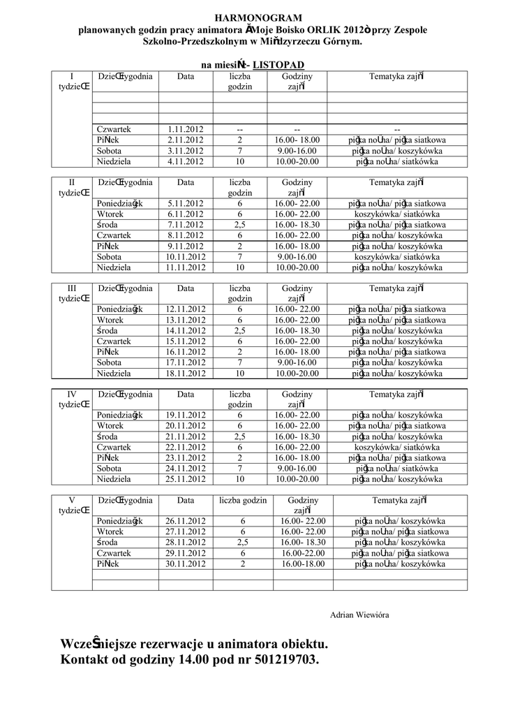 HARMONOGRAM planowanych godzin pracy animatora „Moje Boisko ORLIK 2012” przy Zespole Szkolno-Przedszkolnym w Międzyrzeczu Górnym. na miesiąc- LISTOPAD I tydzień Dzień tygodnia Czwartek Piątek Sobota Niedziela II tydzień Dzień tygodnia Poniedziałek Wtorek Środa Czwartek Piątek Sobota Niedziela III tydzień Dzień tygodnia Poniedziałek Wtorek Środa Czwartek Piątek Sobota Niedziela IV tydzień Dzień tygodnia Poniedziałek Wtorek Środa Czwartek Piątek Sobota Niedziela V tydzień Dzień tygodnia Poniedziałek Wtorek Środa Czwartek Piątek Data liczba godzin Godziny zajęć Tematyka zajęć 1.11.2012 2.11.2012 3.11.2012 4.11.2012 -2 7 10 -16.00- 18.00 9.00-16.00 10.00-20.00 -piłka nożna/ piłka siatkowa piłka nożna/ koszykówka piłka nożna/ siatkówka Data liczba godzin 6 6 2,5 6 2 7 10 Godziny zajęć 16.00- 22.00 16.00- 22.00 16.00- 18.30 16.00- 22.00 16.00- 18.00 9.00-16.00 10.00-20.00 Tematyka zajęć liczba godzin 6 6 2,5 6 2 7 10 Godziny zajęć 16.00- 22.00 16.00- 22.00 16.00- 18.30 16.00- 22.00 16.00- 18.00 9.00-16.00 10.00-20.00 liczba godzin 6 6 2,5 6 2 7 10 Godziny zajęć 16.00- 22.00 16.00- 22.00 16.00- 18.30 16.00- 22.00 16.00- 18.00 9.00-16.00 10.00-20.00 5.11.2012 6.11.2012 7.11.2012 8.11.2012 9.11.2012 10.11.2012 11.11.2012 Data 12.11.2012 13.11.2012 14.11.2012 15.11.2012 16.11.2012 17.11.2012 18.11.2012 Data 19.11.2012 20.11.2012 21.11.2012 22.11.2012 23.11.2012 24.11.2012 25.11.2012 Data liczba godzin 26.11.2012 27.11.2012 28.11.2012 29.11.2012 30.11.2012 6 6 2,5 6 2 Godziny zajęć 16.00- 22.00 16.00- 22.00 16.00- 18.30 16.00-22.00 16.00-18.00 piłka nożna/ piłka siatkowa koszykówka/ siatkówka piłka nożna/ piłka siatkowa piłka nożna/ koszykówka piłka nożna/ koszykówka koszykówka/ siatkówka piłka nożna/ koszykówka Tematyka zajęć piłka nożna/ piłka siatkowa piłka nożna/ piłka siatkowa piłka nożna/ koszykówka piłka nożna/ koszykówka piłka nożna/ piłka siatkowa piłka nożna/ koszykówka piłka nożna/ koszykówka Tematyka zajęć piłka nożna/ koszykówka piłka nożna/ piłka siatkowa piłka nożna/ koszykówka koszykówka/ siatkówka piłka nożna/ piłka siatkowa piłka nożna/ siatkówka piłka nożna/ koszykówka Tematyka zajęć piłka nożna/ koszykówka piłka nożna/ piłka siatkowa piłka nożna/ koszykówka piłka nożna/ piłka siatkowa piłka nożna/ koszykówka Adrian Wiewióra Wcześniejsze rezerwacje u animatora obiektu. Kontakt od godziny 14.00 pod nr 501219703.