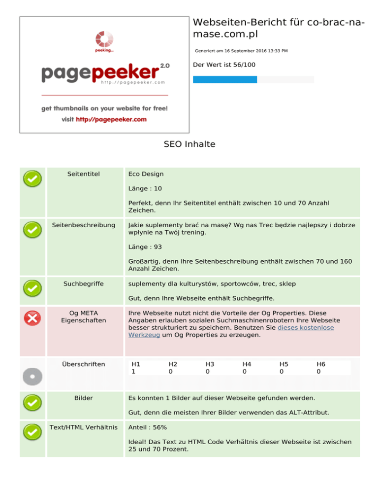 Webseiten-Bericht für co-brac-namase.com.pl Generiert am 16 September 2016 13:33 PM Der Wert ist 56/100 SEO Inhalte Seitentitel Eco Design Länge : 10 Perfekt, denn Ihr Seitentitel enthält zwischen 10 und 70 Anzahl Zeichen. Seitenbeschreibung Jakie suplementy brać na masę? Wg nas Trec będzie najlepszy i dobrze wpłynie na Twój trening. Länge : 93 Großartig, denn Ihre Seitenbeschreibung enthält zwischen 70 und 160 Anzahl Zeichen. Suchbegriffe suplementy dla kulturystów, sportowców, trec, sklep Gut, denn Ihre Webseite enthält Suchbegriffe. Og META Eigenschaften Überschriften Bilder Ihre Webseite nutzt nicht die Vorteile der Og Properties. Diese Angaben erlauben sozialen Suchmaschinenrobotern Ihre Webseite besser strukturiert zu speichern. Benutzen Sie dieses kostenlose Werkzeug um Og Properties zu erzeugen. H1 1 H2 0 H3 0 H4 0 H5 0 H6 0 Es konnten 1 Bilder auf dieser Webseite gefunden werden. Gut, denn die meisten Ihrer Bilder verwenden das ALT-Attribut. Text/HTML Verhältnis Anteil : 56% Ideal! Das Text zu HTML Code Verhältnis dieser Webseite ist zwischen 25 und 70 Prozent. SEO Inhalte Flash IFrame Perfekt, denn es wurde kein Flash auf Ihrer Webseite gefunden. Großartig, denn Sie verwenden keine IFrames auf Ihrer Webseite. SEO Links URL Rewrite Gut. Ihre Links sind für Suchmaschinen gut lesbar (sprechende Links)! Underscores in the URLs Perfekt! Wir haben keine Unterstriche in Ihren Links entdeckt. In-page links We found a total of 21 links including 0 link(s) to files Statistics Externe Links : noFollow 0% Externe Links : natürliche Links 19.05% Interne Links 80.95% In-page links Anker Typ Natürlich - intern natürliche Links strony www extern natürliche Links Home intern natürliche Links Jak można zwiększyć masę mięśni intern natürliche Links Samozaparcie i dyscyplina kluczem do osiągnięć w sporcie intern natürliche Links Co omijać podczas odchudzania intern natürliche Links Jakie błędy w diecie najczęściej popełniają kulturyści? intern natürliche Links Co jeść na kolację, gdy jesteśmy na diecie? intern natürliche Links Jak powinna wyglądać dieta sportowca? intern natürliche Links Kulturystyka to sport także dla kobiet intern natürliche Links In-page links Najliczniejsza grupa zawodowa Polaków w Niemczech intern natürliche Links Preparat Inca inchi - tajemnica zdrowego wyglądu bezpośrednio z amazońskiej krainy intern natürliche Links Zbudowanie zarobkowej witryny internetowej w pigułce intern natürliche Links Sprzedaż produktów na portalu aukcyjnym intern natürliche Links Czy powinno się samemu obecnie rozliczać PIT intern natürliche Links Całkowite wykorzystanie mocy z linka pozycjonującego intern natürliche Links Kupno wozu rodzinnego intern natürliche Links http://danuta-majewska.pl/stomatolog-dentysta-radom extern natürliche Links http://www.nbp.pl extern natürliche Links http://metfach.pl/ogrodzenia-radom extern natürliche Links sitemap.xml intern natürliche Links SEO Suchbegriffe Suchbegriffswolke dla nie zwiększenie czy nich się jak kulturystów celu będzie Keywords Consistency Suchbegriff Inhalt się 8 dla 6 nich 3 zwiększenie 3 nie 3 Seitentitel Suchbegrif fe Seitenbesc hreibung Überschrift en Benutzerfreundlichkeit URL Domain : co-brac-na-mase.com.pl Länge : 22 Favoriten Icon Nicht so gut. Wir haben kein Favicon gefunden. Diese kleinen Symbole sind ein einfaches Mittel, um Besucher auf Ihre Webseite zu ziehen und die Webseitengeschwindigkeit zu steigern, denn jeder Browser fragt beim Aufruf Ihrer Webseite das Favicon ab. Druckeigenschaften Es konnten keine druckfreundlichen CSS-Angaben gefunden werden. Sprache Gut, denn Sie haben in den META-Elementen eine Sprache deklariert: pl. Dublin Core Diese Webseite nutzt nicht die Vorteile der Dublin Core Elemente. Dokument Doctype HTML 5 Verschlüsselung Perfekt, denn Ihre Webseite deklariert einen Zeichensatz: UTF-8. W3C Validität Fehler : 5 Warnungen : 5 E-Mail Datenschutz Sehr gut, denn es wurde keine E-Mail Adresse im Klartext auf Ihrer Webseite gefunden. Veraltetes HTML Sehr gut! Sie verwenden aktuelle HTML Tags in Ihrem Webseitenquelltext. Tipps zur Webseiteng eschwindigkeit Sehr gut, denn Ihre Webseite benutzt keine verschachtelten Tabellen. Schlecht, denn es wurden CSS-Angaben in HTML-Elementen entdeckt. Diese Angaben sollten in ein entsprechendes CSSStylesheet verlagert werden. Gut, denn Ihre Webseite enthält nur wenig CSS-Dateien. Perfekt, denn Ihre Webseite enthät nur wenig JavascriptDateien. Gut! Sie nutzen die Vorteile von gzip. Dokument Mobile Mobile Optimierung Apple Icon META Viewport Tag Flash Inhalt Optimierung XML-Sitemap Fehlt Ihre Webseite hat keine XML-Sitemap. Dies könnte Probleme machen. Eine Sitemap listet alle URLs, die für einen Suchmaschinenzugriff verfügbar sind. Sie kann ebenfalls Angaben zu aktuellen Updates, Häufigkeit von Änderungen und zur Priorität der URLs enthalten. Dies erlaubt Suchmaschinen, Seiten effizienter auszuloten. Robots.txt Fehlt Ihre Webseite enthält keine robots.txt-Datei. Dies könnte Probleme machen. Eine robots.txt-Datei erlaubt Ihnen, Suchmaschinen-Bots den Zugriff auf Ihre Seite zu verweigern und spezifische Seiten und Inhaltsverzeichnisse zu durchsuchen. Die Datei bestimmt ebenfalls die Lokalisierung der XML-Sitemap. Analytics Fehlt Wir haben nicht ein Analyse-Tool auf dieser Website installiert zu erkennen. Webanalyse erlaubt die Quantifizierung der Besucherinteraktionen mit Ihrer Seite. Insofern sollte zumindest ein Analysetool installiert werden. Um die Befunde abzusichern, empfiehlt sich das parallele Verwenden eines zweiten Tools. Powered by TCPDF (www.tcpdf.org)