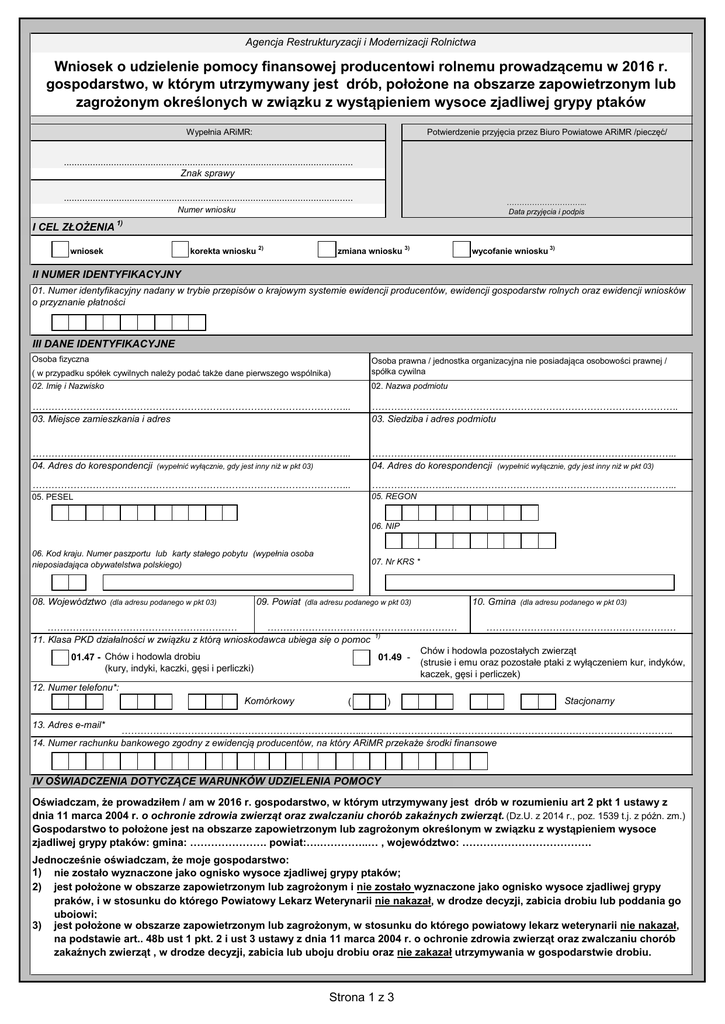 Agencja Restrukturyzacji i Modernizacji Rolnictwa Wniosek o udzielenie pomocy finansowej producentowi rolnemu prowadzącemu w 2016 r. gospodarstwo, w którym utrzymywany jest drób, położone na obszarze zapowietrzonym lub zagrożonym określonych w związku z wystąpieniem wysoce zjadliwej grypy ptaków Wypełnia ARiMR: Potwierdzenie przyjęcia przez Biuro Powiatowe ARiMR /pieczęć/ .............................................................................................................. Znak sprawy .............................................................................................................. ………………………….. Data przyjęcia i podpis Numer wniosku I CEL ZŁOŻENIA 1) wniosek korekta wniosku 2) zmiana wniosku 3) wycofanie wniosku 3) II NUMER IDENTYFIKACYJNY 01. Numer identyfikacyjny nadany w trybie przepisów o krajowym systemie ewidencji producentów, ewidencji gospodarstw rolnych oraz ewidencji wniosków o przyznanie płatności III DANE IDENTYFIKACYJNE Osoba fizyczna ( w przypadku spółek cywilnych należy podać także dane pierwszego wspólnika) Osoba prawna / jednostka organizacyjna nie posiadająca osobowości prawnej / spółka cywilna 02. Imię i Nazwisko 02. Nazwa podmiotu ……………………………………………………………………………………….. 03. Miejsce zamieszkania i adres ……………………………………………………………………………………. 03. Siedziba i adres podmiotu ……………………………………………………………………………………….. 04. Adres do korespondencji (wypełnić wyłącznie, gdy jest inny niż w pkt 03) ……………………..…………………………………………………………….. 04. Adres do korespondencji (wypełnić wyłącznie, gdy jest inny niż w pkt 03) ……………………………………………………………………………………….. ……………………..…………………………………………………………….. 05. PESEL 05. REGON 06. NIP 06. Kod kraju. Numer paszportu lub karty stałego pobytu (wypełnia osoba nieposiadająca obywatelstwa polskiego) 08. Województwo (dla adresu podanego w pkt 03) 07. Nr KRS * 09. Powiat (dla adresu podanego w pkt 03) 10. Gmina (dla adresu podanego w pkt 03) …………………………………………………… …………………………………………………… …………………………………………………… 11. Klasa PKD działalności w związku z którą wnioskodawca ubiega się o pomoc 1) Chów i hodowla pozostałych zwierząt 01.47 - Chów i hodowla drobiu 01.49 (strusie i emu oraz pozostałe ptaki z wyłączeniem kur, indyków, (kury, indyki, kaczki, gęsi i perliczki) kaczek, gęsi i perliczek) 12. Numer telefonu*: Komórkowy Stacjonarny ( ) 13. Adres e-mail* …………………………………………………………………...……………………………………………………………………………………. 14. Numer rachunku bankowego zgodny z ewidencją producentów, na który ARiMR przekaże środki finansowe IV OŚWIADCZENIA DOTYCZĄCE WARUNKÓW UDZIELENIA POMOCY Oświadczam, że prowadziłem / am w 2016 r. gospodarstwo, w którym utrzymywany jest drób w rozumieniu art 2 pkt 1 ustawy z dnia 11 marca 2004 r. o ochronie zdrowia zwierząt oraz zwalczaniu chorób zakaźnych zwierząt. (Dz.U. z 2014 r., poz. 1539 t.j. z późn. zm.) Gospodarstwo to położone jest na obszarze zapowietrzonym lub zagrożonym określonym w związku z wystąpieniem wysoce zjadliwej grypy ptaków: gmina: …………………. powiat:….…………..… , województwo: ………………………………. Jednocześnie oświadczam, że moje gospodarstwo: 1) nie zostało wyznaczone jako ognisko wysoce zjadliwej grypy ptaków; 2) jest położone w obszarze zapowietrzonym lub zagrożonym i nie zostało wyznaczone jako ognisko wysoce zjadliwej grypy praków, i w stosunku do którego Powiatowy Lekarz Weterynarii nie nakazał, w drodze decyzji, zabicia drobiu lub poddania go ubojowi; 3) jest położone w obszarze zapowietrzonym lub zagrożonym, w stosunku do którego powiatowy lekarz weterynarii nie nakazał, na podstawie art.. 48b ust 1 pkt. 2 i ust 3 ustawy z dnia 11 marca 2004 r. o ochronie zdrowia zwierząt oraz zwalczaniu chorób zakaźnych zwierząt , w drodze decyzji, zabicia lub uboju drobiu oraz nie zakazał utrzymywania w gospodarstwie drobiu. Strona 1 z 3 V OŚWIADCZENIE DOTYCZĄCE LICZBY PTAKÓW UTRZYMYWANYCH W GOSPODARSTWIE 1) : Wnioskuję o udzielenie pomocy finansowej, ponieważ na dzień przed otrzymaniem przez Powiatowego Lekarza Weterynarii zawiadomienia o podejrzeniu wystapienia wysoce zjadliwej grypy ptaków utrzymywałem w gospodarstwie położonym na obszarze zapowietrzonym lub zagrożonym, nastepującą liczbę ptactwa: indyki - sztuk: …………… x 25,00 zł** perlice - sztuk: …………… x 5,00 zł** strusie - sztuk: …………… x 25,00 zł** przepiórki - sztuk: …………… x 5,00 zł** kaczki - sztuk: …………… x 15,00 zł** gołębie - sztuk: …………… x 4,00 zł** gęsi - sztuk: …………… x 15,00 zł** bażanty - sztuk: …………… x 4,00 zł** kury - sztuk: …………… x 5,00 zł** kuropatwy - sztuk: …………… x 4,00 zł** bezgrzebieniowce inne niż strusie (jakie) : …………………………..………....……… - sztuk …………… x 4,00 zł** VI INFORMACJE PRZEDSTAWIANE PRZY UBIEGANIU SIĘ O POMOC W ROLNICTWIE LUB RYBOŁÓWSTWIE INNĄ NIŻ POMOC DE MINIMIS W ROLNICTWIE LUB RYBOŁÓWSTWIE 1) Oświadczam, że prowadzę gospodarstwo, które w rozumieniu przepisów załącznika nr 1 do rozporządzenia Komisji (WE) nr 702/2014 z dnia 25 czerwca 2014 r. spełnia kryterium: mikroprzedsiębiorstwa - przedsiębiorstwo zatrudniające mniej niż 10 pracowników, którego roczny obrót lub całkowity bilans roczny nie