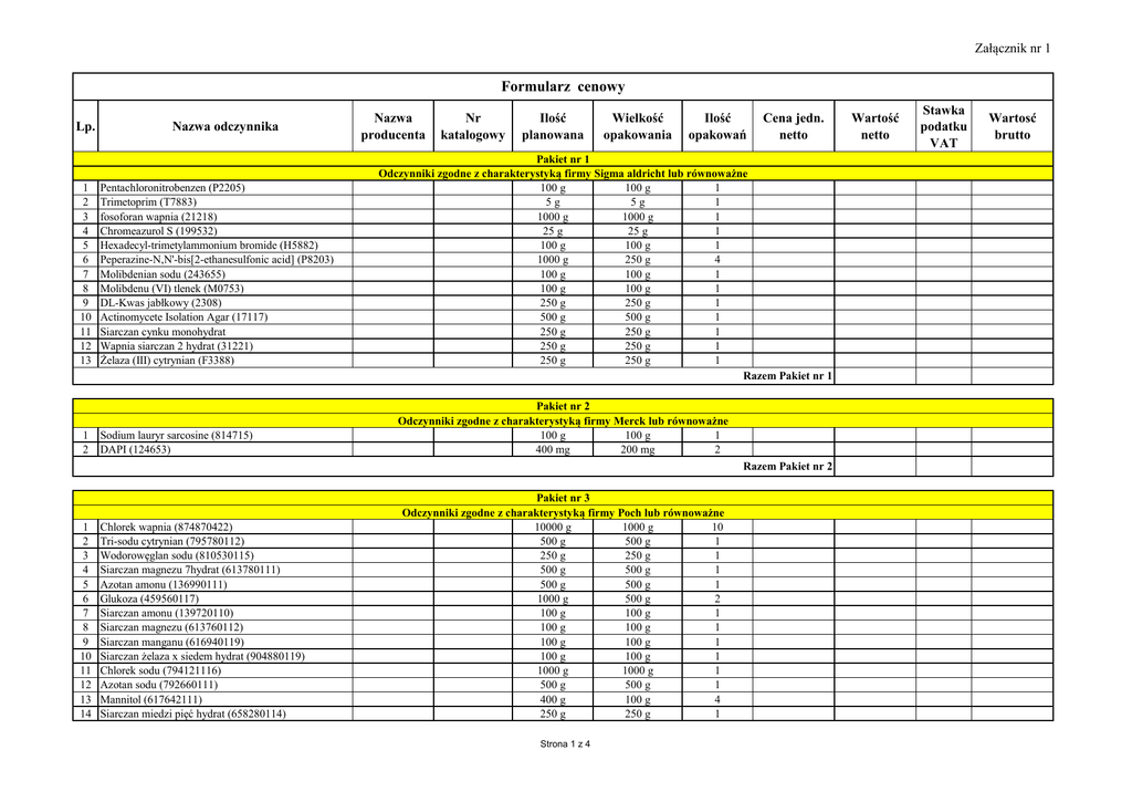 Załącznik nr 1 Formularz cenowy Lp. 1 2 3 4 5 6 7 8 9 10 11 12 13 1 2 Nazwa odczynnika Pentachloronitrobenzen (P2205) Trimetoprim (T7883) fosoforan wapnia (21218) Chromeazurol S (199532) Hexadecyl-trimetylammonium bromide (H5882) Peperazine-N,N'-bis[2-ethanesulfonic acid] (P8203) Molibdenian sodu (243655) Molibdenu (VI) tlenek (M0753) DL-Kwas jabłkowy (2308) Actinomycete Isolation Agar (17117) Siarczan cynku monohydrat Wapnia siarczan 2 hydrat (31221) Żelaza (III) cytrynian (F3388) Sodium lauryr sarcosine (814715) DAPI (124653) Nazwa producenta Nr katalogowy Ilość planowana Wielkość opakowania Ilość opakowań Cena jedn. netto Pakiet nr 1 Odczynniki zgodne z charakterystyką firmy Sigma aldricht lub równoważne 100 g 100 g 1 5g 5g 1 1000 g 1000 g 1 25 g 25 g 1 100 g 100 g 1 1000 g 250 g 4 100 g 100 g 1 100 g 100 g 1 250 g 250 g 1 500 g 500 g 1 250 g 250 g 1 250 g 250 g 1 250 g 250 g 1 Razem Pakiet nr 1 Pakiet nr 2 Odczynniki zgodne z charakterystyką firmy Merck lub równoważne 100 g 100 g 1 400 mg 200 mg 2 Razem Pakiet nr 2 1 2 3 4 5 6 7 8 9 10 11 12 13 14 Chlorek wapnia (874870422) Tri-sodu cytrynian (795780112) Wodorowęglan sodu (810530115) Siarczan magnezu 7hydrat (613780111) Azotan amonu (136990111) Glukoza (459560117) Siarczan amonu (139720110) Siarczan magnezu (613760112) Siarczan manganu (616940119) Siarczan żelaza x siedem hydrat (904880119) Chlorek sodu (794121116) Azotan sodu (792660111) Mannitol (617642111) Siarczan miedzi pięć hydrat (658280114) Pakiet nr 3 Odczynniki zgodne z charakterystyką firmy Poch lub równoważne 10000 g 1000 g 10 500 g 500 g 1 250 g 250 g 1 500 g 500 g 1 500 g 500 g 1 1000 g 500 g 2 100 g 100 g 1 100 g 100 g 1 100 g 100 g 1 100 g 100 g 1 1000 g 1000 g 1 500 g 500 g 1 400 g 100 g 4 250 g 250 g 1 Strona 1 z 4 Wartość netto Stawka podatku VAT Wartosć brutto Lp. 15 16 17 18 19 20 21 22 23 24 25 26 27 28 29 30 31 Nazwa odczynnika di-potasu wodorofosforan (742100117) Potasu diwodorofosforan (742020112) Di-sodu wodorofosforan (799230429) Sodu diwodorofosforan hydrat (799180428) Maltoza (615300447) Chlorek żelaza 6 hydrat (904180420) Magnezu chlorek 6. Hydrat (612050110) 500g Glinu potasu siarczan 12. Hydrat (452660111) Wapnia węglan strącony (878330111) Octan etylu do HPLC (nr. kat. 405031150) Metanol do HPLC (nr. kat. 621991154) Acetonitryl do HPLC (nr. kat. 102640150) Kwas solny 0,1 mol/l (0,1 N) r-r mianowany (nr. kat. 575315164) Sodu wodorotlenek 0,1 mol/l (0,1 N) r-r mianowany (nr. kat. 810943167) Chloroform cz (nr. kat. 234430427) Kwas mlekowy 80% CZ (nr kat. 564233424) Gliceryna bezwodna CZ (nr. kat. 443320420) Nazwa producenta Nr katalogowy Ilość planowana Wielkość opakowania Ilość opakowań 1000 g 1000 g 1000 g 1000 g 100 g 250 g 500 g 100 g 500 g 5l 20 l 15 l 1000 g 1000 g 1000 g 1000 g 100 g 250 g 500 g 100 g 500 g 2.5 l 2.5 l 2.5 l 1 1 1 1 1 1 1 1 1 2 8 6 1l 1l 1 1l 1l 1 5l 4l 2l 1l 1l 1l 5 4 2 Cena jedn. netto Razem Pakiet nr 3 1 2 3 4 5 Pepton (PB01) BACTERIOLOGICAL LAB-AGAR (AB03) Actinomycete Isolation LAB-AGARTM (PS585) Rose Bengal LAB-AGAR (PS66) Trypticasein Soy LAB-AGAR Pakiet nr 4 Odczynniki zgodne z charakterystyką firmy BioCorp lub równoważne 500 g 500 g 1 4000 g 500 g 8 1000 g 500 g 2 1500 g 500g 3 1500 g 500 g 3 Razem Pakiet nr 4 1 Casamino acid (223050) Pakiet nr 5 Odczynniki zgodne z charakterystyką firmy Difco lub równoważne 500g 500g 1 Razem Pakiet nr 5 1 2 3 4 5 6 Alkohol etylowy 96% cz.d.a. Wodorotlenek sodu cz.d.a. Kwas solny 38%, cz.d.a. Standardy do pH: bufor pH=4 Standardy do pH: bufor pH=7 Sodu cytrynian cz.d.a. Pakiet nr 6 Odczynniki zgodne z charakterystyką firmy POCH lub równoważne 5l 0,5 l 10 30 kg 1 kg 30 10 l 1l 10 300 ml 100 ml 3 300 ml 100 ml 3 2 kg 2 kg 1 Strona 2 z 4 Wartość netto Stawka podatku VAT Wartosć brutto Lp. 7 8 9 10 11 12 13 14 15 16 17 18 19 20 21 22 Nazwa odczynnika Potasowo-sodowy winian cz.d.a. Kwas cytrynowy cz.d.a. Kwas solny fix 0,2 N kwas octowy 80% cz.d.a. Kwas borowy cz.d.a. Kwas nadchlorowy 60% cz.d.a. Sodu salicylan cz.d.a. Octan wapniowy cz.d.a. Kwas cytrynowy cz.d.a. Amoniak 25% r-r cz.d.a. Azotan potasowy cz.d.a. Molibdenian amonowy cz.d.a. Metawanadan amonowy cz.d.a. Kwas azotowy 65% cz.d.a. Kwas azotowy techniczny 38% Kwas siarkowy 95% cz.d.a. Nazwa producenta Nr katalogowy Ilość planowana Wielkość opakowania Ilość opakowań 2 kg 2 kg 20 szt 20 l 1 kg 3l 2 kg 1 kg 1 kg 1l 1 kg 100 g 100 g 10 l 30 l 15 l 2 kg 1 kg 4 szt. 1 litr 1 kg 1 litr 2 kg 1 kg 1 kg 1 litr 1 kg 100 g 100 g 1 litr 30 litrów 1 litr 1 2 5 20 1 3 1 1 1 1 1 1 1 10 1 15 Cena jedn. netto Razem Pakiet nr 6 1 Kwas solny 0,1 N; odważka analityczna 2 3 4 5 6 7 8 9 tiosiarczan sodu fix 0,001 mol/dm3 H2SO4 32% kwas L-askorbinowy czda Jodek potasu czda Kwas szczawiowy czda 2,6 dichlorofenoloindofenol czda NaHCO3 czda CUSO4*5H2O czda Pakiet nr 7 Odczynniki zgodne z charakterystyką firmy CHEMPUR lub równoważne op.: stężenie po 10 op. rozcieńczeniu do 10 1000 ml 0,1 mol/l 1 op. 1 op.: 10 szt. 1 1l 1l 1 50 g 50 g 1 250 g 250 g 1 500 g 500 g 1 5g 5g 1 1 kg 1 kg 1 2 kg 1 kg 2 10 Winian sodowo-potasowy NaKH4C4O6*4H2O cz.d.a. 4 kg 1 kg 4 11 KMnO4 czda 4 op. odw.analityczna do roztw. 0,02 mol/dm3 4 12 Żelazocyjanek potasu 3wodny K4Fe(CN)6*3H2O czda 250 g 250 g 1 13 ZnSO4 *7H2O czda 14 Fe2(SO4)3 czda 300 g 250 g 100 g 250 g 3 1 Razem Pakiet nr 7 Strona 3 z 4 Wartość netto Stawka podatku VAT Wartosć brutto Lp. Nazwa odczynnika Nazwa producenta Nr katalogowy Ilość planowana Wielkość opakowania Ilość opakowań Cena jedn. netto Pakiet nr 8 1 Wzorzec wielopierwastkowy Merck (23 elem.) (nr kat. 1.11355.0100) 100 ml 100 ml 1 2 Amonu chlorek cz.d.a. lub p.a. MERCK lub FLUKA 1 kg 1 kg 1 3 4 BRIJ 35 firmy Roth Sulfanilamid cz.d.a. Lub p.a Nr kat. 86060 FLUKA N-(1-naftylo) etylenodiaminy dichlorowodorek cz.d.a lub p.a. 1 kg 100 g 1 kg 100 g 1 1 10 g 10 g 1 5 Razem Pakiet nr 8 ………………………………….. Pieczęć imienna i podpis albo podpis/y czytelne osoby/osób upoważ