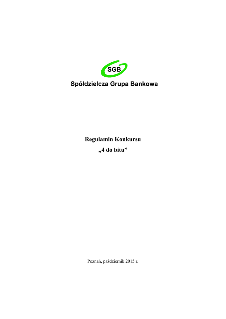 Regulamin Konkursu „4 do bitu” Poznań, październik 2015 r. §1 Organizator i Nazwa Konkursu Organizatorem konkursu pod nazwą „4 do bitu”, jest SGB-Bank Spółka Akcyjna z siedzibą w Poznaniu, ul. Szarych Szeregów 23a, 60-462 Poznań, zarejestrowana w Krajowym Rejestrze Sądowym pod nr KRS: 0000058205, prowadzonym przez Sąd Rejonowy Poznań - Nowe Miasto i Wilda w Poznaniu, VIII Wydział Gospodarczy Krajowego Rejestru Sądowego, posiadająca kapitał zakładowy w wysokości 231 903 900,00 zł (z czego wpłacono: 231 903 900,00 zł), NIP 777 00 05 362, REGON 004848247. §2 Definicje 1. Pojęcia użyte w niniejszym regulaminie mają znaczenie nadane im w przepisach prawa bądź w niniejszym paragrafie: 1) Banki Spółdzielcze – banki spółdzielcze zrzeszone w ramach Spółdzielczej Grupy Bankowej; 2) Komisja konkursowa – powołana przez Organizatora komisja sprawująca nadzór nad prawidłowym przebiegiem Konkursu; 3) Konkurs – konkurs pod nazwą „4 do bitu”; 4) Organizator – SGB-Bank Spółka Akcyjna z siedzibą w Poznaniu; 5) Regulamin – regulamin Konkursu; 6) SKO - Szkolne Kasy Oszczędności; 7) Strona konkursowa – utworzona na potrzeby Konkursu strona internetowa: www.skowsgb.pl; 8) Szkoły - szkoły podstawowe i gimnazjalne, przy których działają SKO pod patronatem Banków Spółdzielczych; 9) Uczestnik – Szkoła, która zgłosi udział w Konkursie i otrzyma status Uczestnika zgodnie z § 5 Regulaminu; 2. Pojęcia użyte w Regulaminie w liczbie pojedynczej odnoszą się także do liczby mnogiej i odwrotnie, chyba że co innego wyraźnie wynika z treści przepisu. 1 §3 Cel przeprowadzenia Konkursu 1. Celem Konkursu jest wybór najlepszego tekstu rymowanego zawierającego następujące słowa kluczowe: „SKO”, „oszczędzanie” oraz wszelkie wyrazy pokrewne do słowa „oszczędzanie”, tj. wyrazy mające wspólny rdzeń ze słowem „oszczędzanie". 2. Komisja konkursowa wybierze trzy teksty, które zostaną nagrodzone. 3. Komisja konkursowa przyzna jedną nagrodę specjalną za tekst, który otrzyma największą liczbę głosów oddanych przez internautów za pośrednictwem Strony konkursowej. 4. Konkurs skierowany jest do Szkół i ma na celu propagowanie oszczędzania wśród uczniów. 5. Konkurs nie jest grą hazardową w rozumieniu ustawy z dnia 19 listopada 2009 r. o grach hazardowych (j.t. Dz. U. 2015 r. poz. 612, ze zm.) i nie podlega rygorom określonym w ww. ustawie. Organizator jest przyrzekającym nagrodę w rozumieniu art. 919 Kodeksu cywilnego (j.t. Dz. U. z 2014 r. poz. 121, ze zm.). 6. Regulamin stanowi wyłączną podstawę przeprowadzenia Konkursu oraz określa prawa i obowiązki jego Uczestników. §4 Miejsce i czas trwania Konkursu 1. Konkurs prowadzony jest na całym terytorium Rzeczypospolitej Polskiej za pośrednictwem Strony konkursowej. 2. Konkurs trwa w okresie od dnia 26 października 2015 r. do dnia 15 stycznia 2016 r., przy czym zgłoszeń w Konkursie dokonywać można wyłącznie do dnia 6 listopada 2015 r. Zakończenie Konkursu następuje po wydaniu nagród. 3. Po zakończeniu Konkursu i ogłoszeniu wyników zwycięskie teksty konkursowe zostaną zamieszczone na Stronie konkursowej. §5 Zasady oraz warunki prowadzenia Konkursu 1. Uczestnikiem Konkursu może zostać Szkoła, która w okresie od dnia 26 października 2015 r. do dnia 6 listopada 2015 r. dokona zgłoszenia konkursowego na Stronie konkursowej. 2. W imieniu Szkoły czynności w Konkursie dokonywać może odpowiednio umocowany opiekun SKO, tj. pełnomocnik wskazany przez Szkołę. 2 3. Pełnomocnik wskazywany jest przez Szkołę w formie pisemnej a treść stosownego pełnomocnictwa dostarczana jest do siedziby Organizatora listownie lub elektronicznie poprzez wysłanie skanu pełnomocnictwa na adres mailowy [email protected], chyba że Organizator dysponuje już stosownym pełnomocnictwem opiekuna. 4. Zgłoszenie konkursowe, o którym mowa w ust. 1, polega na: 1) wypełnieniu formularza rejestracyjnego na Stronie konkursowej, poprzez utworzenie konta konkursowego, tj. wpisanie danych Szkoły (nazwa i adres), danych osobowych osoby kontaktowej (imię i nazwisko, adres e-mail, numer telefonu), nazwy banku, z którym współpracuje Szkoła oraz złożenie oświadczeń, o których mowa w ust. 11; 2) zgłoszeniu tekstu konkursowego, w formie elektronicznej, poprzez wybór animowanej postaci wraz z przypisaną do niej melodią, wpisanie tekstu konkursowego w wyznaczony obszar i przesłanie go Organizatorowi za pośrednictwem konta konkursowego. 5. Każda Szkoła może dokonać nieograniczonej liczby zgłoszeń z jednego konta konkursowego, przy czym może ona wygrać tylko jedną nagrodę w Konkursie. 6. Szkoła zgłaszająca tekst konkursowy może do dnia 27 listopada 2015 r. go usunąć. W takim przypadku głosy oddane na usunięty tekst konkursowy przepadają. 7. W terminie od dnia 9 listopada 2015 r. do dnia 13 listopada 2015 r. Organizator dokona weryfikacji zgłoszonych tekstów konkursowych w zakresie zgodności z Regulaminem, a następnie zamieści zgodne z Regulaminem teksty konkursowe na Stronie konkursowej z oznaczeniem zgłaszającej Szkoły. Od tego momentu Szkoła zgłaszająca tekst konkursowy staje się Uczestnikiem Konkursu. 8. W terminie od dnia 16 listopada 2015 r. do dnia 27 listopada 2015 r. przyjęte teksty konkursowe będą udostępnione na Stronie konkursowej, a każda osoba, która zaloguje się na tej stronie, będzie mogła oddać głos na wybrany tekst konkursowy. 9. Każda z osób może oddać tylko jeden głos dziennie. 10. Za rejestrację zgłoszeń i prowadzenie rankingu odpowiedzialny jest Organizator. 11. Osoba fizyczna reprezentująca przystępującą do Konkursu Szkołę (działająca w imieniu i na rzecz Szkoły) zobowiązana jest: 1) wyrazić zgodę na przetwarzanie jej danych osobowych dla celów przeprowadzenia Konkursu; 3 2) wyrazić zgodę na udział Szkoły w Konkursie na warunkach określonych w Regulaminie; 3) wyr