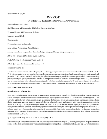 Sygn. akt III K 134/12 WYROK W IMIENIU RZECZYPOSPOLITEJ POLSKIEJ Dnia 18 lutego 2013 roku Sąd Okręgowy w Białymstoku III Wydział Karny w składzie: Przewodnicząca SSO Marzenna Roleder Ławnicy Irena Rybak Ewa Sawicka Protokolant Justyna Szmurło przy udziale Prokuratora Anny Giedrys po rozpoznaniu na rozprawie w dniach: 1 lutego 2013 r., 18 lutego 2013 roku sprawy: M. C. (1) - syna H. i D. z domu S., ur. (...) w B. P. J. (1)- syna K. i K. z domu U., ur. (...) w B. M. K. (1)- syna D. i Z. z domu K., ur. (...) w B. oskarżonych o to, że: I. w dniu 21 września 2010 roku w B. przy ul. (...) działając wspólnie i w porozumieniu dokonali rozboju na K. Ł., A. B. i P. S. w ten sposób, że po uprzednim doprowadzeniu pokrzywdzonych do stanu bezbronności poprzez zastraszenie ich przez M. C. (1) nożem, zażądali wydania pieniędzy i wartościowych przedmiotów oraz przeszukali kieszenie odzieży pokrzywdzonych, po czym dokonali zaboru w celu przywłaszczenia telefonu komórkowego marki S. (...) o wartości 150 zł oraz pieniędzy w kwocie 10 zł na szkodę A. B., telefonu komórkowego marki N. (...) wartości 2000 zł na szkodę P. S. oraz telefonu komórkowego marki S. (...) wartości 400 zł i pieniędzy w kwocie 20 zł od K. Ł. na szkodę B. Ł., tj. o czyn z art. 280 § 2 k.k. a nadto M. C. (1) o to, że: II. w nocy z 7/8 listopada 2010 roku w B. na parkingu niestrzeżonym przy ul. (...) działając wspólnie i w porozumieniu z inną osobą dokonał zaboru w celu krótkotrwałego użycia pojazdu marki M. (...) o numerze rejestracyjnym (...) o wartości 3500 złotych w ten sposób, że po uprzednim dostaniu się przez nie zamknięte na zamek drzwi samochodu dostał się do jego wnętrza, po czym przemieścił go na odległość 2 metrów i uderzył w tył zaparkowanego tam pojazdu marki M. o nr rej. (...), w wyniku czego w pojeździe marki M. (...) została uszkodzona szyba przednia i pokrywa silnika oraz przedni zderzak, po czym pozostawił pojazd w stanie uszkodzonym, a następnie dokonał z pojazdu marki M. (...) zaboru w celu przywłaszczenia radia samochodowego marki S. (...)-plode, papierośnicy koloru srebrnego, okularów z napisem Pilot, aerozolu do czyszczenia tapicerki oraz obucha młotka o łącznej wartości 255 zł na szkodę właściciela samochodu M. (...)- G. R., tj. o czyn z art. 289 § 2 k.k. w zb. z art. 278 § 1 k.k. III. w nocy z 7/8 listopada 2010 roku w B. na parkingu niestrzeżonym przy ul. (...) działając wspólnie i w porozumieniu z inną osoba dokonał kradzieży z włamaniem do zaparkowanego tam pojazdu marki F. (...) nr rej. (...) w ten sposób, że po uprzednim wybiciu obuchem młotka szyby w prawych tylnych drzwiach pojazdu dostał się do jego wnętrza skąd po jego penetracji dokonał zaboru w celu przywłaszczenia trzech zawieszek zapachowych o wartości 2 złotych na szkodę J. R., tj. o czyn z art. 279 § 1 k.k. IV. w nocy z 7/8 listopada 2010 roku w B. na parkingu niestrzeżonym przy ul. (...) działając wspólnie i w porozumieniu z nieustalonymi sprawcami usiłował dokonać kradzieży z włamaniem do pojazdu marki D. (...) o numerze rej. (...) w ten sposób, że po uprzednim wybiciu obuchem młotka szyby w prawych tylnych drzwiach pojazdu dostał się do jego wnętrza, skąd po jego penetracji nie zabrał niczego z uwagi na fakt zatrzymania przez funkcjonariuszy Policji, czym działał na szkodę właściciela pojazdu K. P. (1), tj. o czyn z art. 13 § 1 k.k. w zw. z art. 279 § 1 k.k. 1. Oskarżonych M. C. (1), P. J. (1) i M. K. (1) uznaje za winnych popełnienia zarzuconego im czynu z punktu I i za to na mocy art. 280 § 2 kk skazuje ich, zaś na mocy art. 280 § 2 kk przy zastosowaniu art. 60 § 1 i § 6 pkt.2 kk wobec P. J. (1) i M. K. (1), zaś wobec M. C. (1)- na mocy art.280 § 2 kk przy zastosowaniu art. 60 § 1 i §2 pkt.1 i § 6 pkt.2 kk wymierza im kary po 1(jednym) roku pozbawienia wolności ; 2. Oskarżonego M. C. (1) uznaje za winnego popełnienia czynów z punktu III i IV, uznając je za ciąg przestępstw i za to na mocy art. 279§1 kk , art. 13§1 kk w zw. z art. 279§1 kk skazuje go, zaś na mocy art. 279§1 kk w zw. z art. 91§1 kk wymierza mu karę 8(osiem) miesięcy pozbawienia wolności; 3. Oskarżonego M. C. (1) uznaje za winnego popełnienia czynu z punktu II i za to na mocy art. 289§2 kk w zb. z art. 278§1 kk w zw. z art. 11§2 kk skazuje go, zaś na mocy art. 289§2 kk w zw. z art. 11§3 kk wymierza mu karę 6(sześciu) miesięcy pozbawienia wolności; 4. Na mocy art. 85kk, 86§1 kk wymierza oskarżonemu M. C. (1) karę łączną 2(dwóch) lat pozbawienia wolności; 5. Na mocy art. 69 § 1 i 2 kk, art. 70 § 2 kk, art. 73 § 2 kk wykonanie orzeczonych kar pozbawienia wolności warunkowo zawiesza oskarżonym M. C. (1), P. J. (1) i M. K. (1) na okres 3 (trzech) lat tytułem próby i oddaje ich w tym okresie pod dozór kuratora; 6. Na mocy art.44§2 kk orzeka przepadek na rzecz Skarbu Państwa dowodu rzeczowego w postaci torby materiałowej koloru szarego, szczegółowo opisanej w wykazie dowodów rzeczowych Nr. I/17/11 na k.317, pod pozycją 7; 7. Zasądza od Skarbu Państwa na rzecz adw. Ł. T. kwotę 885,60(osiemset osiemdziesiąt pięć złotych sześćdziesiąt groszy) złotych za nieopłaconą pomoc prawną udzieloną z urzędu, w tym 165,60 złotych (sto sześćdziesiąt pięć złotych sześćdziesiąt groszy) tytułem podatku VAT; 8. Zwalnia oskarżonych M. C. (1), P. J. (1) i M. K. (1) od kosztów sądowych, obciążając nimi Skarb Państwa. III K 134/12 UZASADNIENIE Na podstawie całokształtu materiału dowodowego zgromadzonego w sprawie Sąd ustalił następujący stan faktyczny. W dniu 21 września 2010 r. M. K. (1) spotkał się w B. ze swoją dziewczyną A. S., następnie dołączyli do nich M. C. (1) i P. J. (1). Po odprowadzeniu A. S. do jej mieszkania na ulicy (...) poszli w kierunku ul. (...). Około godziny 20.30 idąc w kierunku Galerii (...) zauważyli trzech młodych mężczyzn, którymi oka