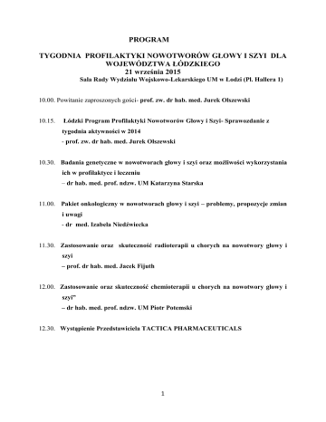 PROGRAM TYGODNIA PROFILAKTYKI NOWOTWORÓW GŁOWY I SZYI DLA WOJEWÓDZTWA ŁÓDZKIEGO 21 września 2015 Sala Rady Wydziału Wojskowo-Lekarskiego UM w Łodzi (Pl. Hallera 1) 10.00. Powitanie zaproszonych gości- prof. zw. dr hab. med. Jurek Olszewski 10.15. Łódzki Program Profilaktyki Nowotworów Głowy i Szyi- Sprawozdanie z tygodnia aktywności w 2014 - prof. zw. dr hab. med. Jurek Olszewski 10.30. Badania genetyczne w nowotworach głowy i szyi oraz możliwości wykorzystania ich w profilaktyce i leczeniu – dr hab. med. prof. ndzw. UM Katarzyna Starska 11.00. Pakiet onkologiczny w nowotworach głowy i szyi – problemy, propozycje zmian i uwagi - dr med. Izabela Niedźwiecka 11.30. Zastosowanie oraz skuteczność radioterapii u chorych na nowotwory głowy i szyi – prof. dr hab. med. Jacek Fijuth 12.00. Zastosowanie oraz skuteczność chemioterapii u chorych na nowotwory głowy i szyi” – dr hab. med. prof. ndzw. UM Piotr Potemski 12.30. Wystąpienie Przedstawiciela TACTICA PHARMACEUTICALS 1 PROGRAM TYGODNIA PROFILAKTYKI NOWOTWORÓW GŁOWY I SZYI DLA WOJEWÓDZTWA ŁÓDZKIEGO 22 września 2015 Sala Dydaktyczna nr 3 Uniwersyteckiego Szpitala Klinicznego im. WAM- Centralnego Szpitala Weteranów w Łodzi (ul. Żeromskiego 113) 10.00. Powitanie pacjentów Klubu Laryngektomowanych przy Klinice Chirurgii Nowotworów Głowy i Szyi -prof. zw. dr hab. med. Jurek Olszewski 10.15. Łódzki Program Profilaktyki Nowotworów Głowy i Szyi- Sprawozdanie z tygodnia aktywności w 2014 - prof. zw. dr hab. med. Jurek Olszewski 10.45. Kompleksowy program rehabilitacji chorych po leczeniu nowotworów głowy i szyi – dr n. med. Joanna Zimmer-Nowicka 2 PROGRAM TYGODNIA PROFILAKTYKI NOWOTWORÓW GŁOWY I SZYI DLA WOJEWÓDZTWA ŁÓDZKIEGO 23 września 2015 Sala Dydaktyczna Kliniki Chirurgii Nowotworów Głowy i Szyi Wojewódzkiego Szpitala Specjalistycznego im. M. Kopernika w Łodzi (ul. Paderewskiego 4) Dzień edukacji (organizacje studenckie, lekarze, fizjoterapeuci, pielęgniarki) 9.00. Powitanie uczestników -prof. zw. dr hab. med. Jurek Olszewski 9.10. Łódzki Program Profilaktyki Nowotworów Głowy i Szyi -prof. zw. dr hab. med. Jurek Olszewski- Sprawozdanie z tygodnia aktywności w 2014 10.40. Uwarunkowania genetyczne nowotworów głowy i szyi -prof. dr hab. Ireneusz Majsterek 11.10. Wybrane metody postępowania diagnostyczno-terapeutyczno-rehabilitacyjnego w nowoczesnej onkologii laryngologicznej – dr med. Dariusz Kaczmarczyk 3 PROGRAM TYGODNIA PROFILAKTYKI NOWOTWORÓW GŁOWY I SZYI DLA WOJEWÓDZTWA ŁÓDZKIEGO 24 września 2015 10.00-13.00 Spotkania z uczniami szkół licealnych: I Liceum Ogólnokształcące im. M. Kopernika ul. Więckowskiego 41, 90-734 Łódź --dr hab. med. prof. ndzw, UM Wioletta Pietruszewska (informacja o programie i przeprowadzenie ankiety) XXXIII LICEUM OGÓLNOKSZTAŁCĄCE im. Armii Krajowej w Łodzi (Dzielnica Łodzi: Retkinia-Północ) ul. Kusocińskiego 116 94-004 Łódź - dr n. med. Joanna Urbaniak (informacja o programie i przeprowadzenie ankiety) Liceum Ogólnokształcące nr XIII im. M. Piotrowiczowej ul. Zuli Pacanowskiej 4 91-430 Łódź - lek. Kalina Owczarek ((informacja o programie i przeprowadzenie ankiety) Publiczne Liceum Ogólnokształcące Uniwersytetu Łódzkiego im. Sprawiedliwych wśród Narodów Świata Ul. Pomorska 161 90-236 Łódź -dr hab. med. prof. ndzw, UM Wioletta Pietruszewska (informacja o programie i przeprowadzenie ankiety) Liceum Ogólnokształcące im Ks. Kardynała Stefana Wyszyńskiego Prymasa 1000-lecia 95-050 Konstantynów Łódzki ul. Kilińskiego 75 - dr n. med. Marzenia Bielińska ( informacja o programie i przeprowadzenie ankiety) III LO im. Tadeusza Kościuszki w Łodzi ul. Sienkiewicza 46 90-009 Łódź - lek med. Piotr Niewiadomski (informacja o programie i przeprowadzenie ankiety) 4 PROGRAM TYGODNIA PROFILAKTYKI NOWOTWORÓW GŁOWY I SZYI DLA WOJEWÓDZTWA ŁÓDZKIEGO 25 września 2015 Dzień badań profilaktycznych Organizacja akcji badań profilaktycznych osób z grup ryzyka (badanie lekarskie bez skierowania): 12.00-15.00 Pracownia fiberoskopowa Kliniki Otolaryngologii, Onkologii Laryngologicznej, Audiologii i Foniatrii Uniwersyteckiego Szpitala Klinicznego im. WAM- Centralnego Szpitala Weteranów w Łodzi. 12.00-15.00 Poradnia Laryngologiczna Uniwersyteckiego Szpitala Klinicznego im. N. Barlickiego w Łodzi 12.00-15.00 Poradnia Onkologii Laryngologicznej Wojewódzkiego Szpitala Specjalistycznego im. M. Kopernika w Łodzi. Wywiady i spotkania Koordynatorów Programu w lokalnych mediach, promujące tydzień profilaktyki. Stoiska informacyjne przez cały tydzień w każdym Oddziale laryngologicznym realizującym Łódzki Program Profilaktyki Nowotworów Głowy i Szyi: 1. Klinika Otolaryngologii, Onkologii Laryngologicznej, Audiologii i Foniatrii Uniwersyteckiego Szpitala Klinicznego im. WAM- Centralnego Szpitala Weteranów w Łodzi (Kierownik Kliniki- prof. dr hab. med. Jurek Olszewski)- koordynator 90-549 Łódź, ul. Żeromskiego 113 Telefon: 42 6393581 2. Klinika Otolaryngologii i Laryngologii Onkologicznej Uniwersyteckiego Szpitala Klinicznego im. N. Barlickiego w Łodzi (Kierownik Kliniki- dr hab. n. med. prof. nadzw. Wioletta Pietruszewska)- II koordynator 90-153 Łódź, ul. Kopcińskiego 22 Telefon: 042 678 57 85 5 3. Klinika Chirurgii Nowotworów Głowy i Szyi Wojewódzkiego Szpitala Specjalistycznego im. M. Kopernika w Łodzi (Kierownik Kliniki- prof. dr hab. med. Alina MorawiecSztandera) 93-509 Łódź, ul. Paderewskiego 4 Telefon: 42 6895479 4. Oddział Otolaryngologiczny Wojewódzkiego Specjalistycznego Szpitala im. Pirogowa w Łodzi (Ordynator Oddziału - dr n. med. Alicja Lipka-Kociszewska) 90-531 Łódź-Polesie , Wólczańska 191/195 Telefon: 42 636 76 11 wew. 292 5. Oddział Otolaryngologiczny Szpitala Wojewódzkiego im. Jana Pawła II w Bełchatowie (Ordynator Oddziału - dr med. Grzegorz Mazur) 97-400 Bełchatów, ul. Czapliniecka 123 Telefon: 44 63 58 426 6. Oddział Otorynolaryngologiczny Szpitala Wo