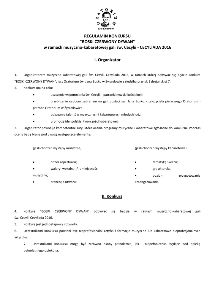 REGULAMIN KONKURSU "BOSKI CZERWONY DYWAN" w ramach muzyczno-kabaretowej gali św. Cecylii - CECYLIADA 2016 I. Organizator 1. Organizatorem muzyczno-kabaretowej gali św. Cecylii Cecyliada 2016, w ramach której odbywać się będzie konkurs "BOSKI CZERWONY DYWAN", jest Oratorium św. Jana Bosko w Żyrardowie z siedzibą przy ul. Salezjańskiej 7. 2. Konkurs ma na celu: uczczenie wspomnienia św. Cecylii - patronki muzyki kościelnej; przybliżenie osobom zebranym na gali postaci św. Jana Bosko - założyciela pierwszego Oratorium i patrona Oratorium w Żyrardowie; 3. pokazanie talentów muzycznych i kabaretowych młodych ludzi; promocję idei polskiej twórczości kabaretowej; Organizator powołuje kompetentne Jury, które ocenia programy muzyczne i kabaretowe zgłoszone do konkursu. Podczas oceny będą brane pod uwagę następujące elementy: (jeśli chodzi o występy muzyczne) (jeśli chodzi o występy kabaretowe) dobór repertuaru; tematykę skeczu; walory wokalne / umiejętności grę aktorską; poziom muzyczne; aranżacja utworu; przygotowania i zaangażowania. II. Konkurs 4. Konkurs "BOSKI CZERWONY DYWAN" odbywać się będzie w ramach muzyczno-kabaretowej gali św. Cecylii Cecyliada 2016. 5. Konkurs jest jednoetapowy i otwarty. 6. Uczestnikami konkursu powinni być nieprofesjonalni artyści i formacje muzyczne lub kabaretowe nieprofesjonalnych artystów. 7. Uczestnikami konkursu mogą być zarówno osoby pełnoletnie, jak i niepełnoletnie, będące pod opieką pełnoletniego opiekuna. 8. Przedmiotem konkursu dla solistów i grup muzycznych jest: dla kabareciarzy i grup kabaretowych jest: wykonanie maksymalnie dwóch wykonanie jednego skeczu utworów muzycznych (to, czy oba utwory (występu kabaretowego); będą mogły być wykonane podczas gali zadecyduje liczba wszystkich zgłoszonych religijny, związany z tematem gali lub wykonawców z patronami (św. Cecylią lub św. Janem - wiąże się to z ograniczonym czasem gali); Bosko); jeden z utworów powinien mieć charakter religijny; muzyka skecz powinien zawierać akcent występ nie może zawierać treści obraźliwych, wulgarnych, itp. powinna być grana "na żywo"; oba utwory nie mogą zawierać treści obraźliwych, wulgarnych, itp. 9. Program całej gali będzie dostępny na plakatach. 10. Kolejność występów poszczególnych wykonawców będzie ustalona przez Organizatora gali i dostępna w piątek 18 listopada 2016 roku w biurze Oratorium św. Jana Bosko w Żyrardowie (ul. Salezjańska 7). III. Zgłoszenia 11. Zgłoszenie udziału w konkursie następuje poprzez dostarczenie do Organizatora przez osobę reprezentującą wykonawcę/wykonawców wypełnionej karty zgłoszeniowej najpóźniej do czwartku 17 listopada 2016. Zgłoszenia mogą być dostarczane osobiście do Organizatora i wtedy będą przyjmowane w biurze Oratorium św. Jana Bosko z siedzibą w Żyrardowie przy ul. Salezjańskiej 7, lub przesyłane w wersji elektronicznej na adres mailowy: [email protected] . 12. Karta zgłoszeniowa obejmuje: podstawowe informacje dotyczące wykonawcy/wykonawców; informacje dotyczące repertuaru; informacje dotyczące kwestii technicznych występu; rider techniczny lub informację dla akustyka (dotyczącej nagłośnienia, propozycji ustawienia, liczby mikrofonów i rozstawienia instrumentów, itp.); notatkę o wykonawcy/wykonawcach (przeznaczoną przede wszystkim dla konferansjerów, którzy będą przedstawiać wykonawcę/wykonawców); 13. tekst piosenki / skróconą wersję scenariusza występu; Zgłoszenia nadesłane po terminie (17-11-16) nie będą uwzględniane i wykonawca nie będzie mógł wziąć udziału w konkursie. Termin ten jest ostateczny i, jeśli Organizator nie zdecyduje inaczej, nieodwołalny. 14. Zgłoszenie musi zawierać pełne informacje oraz podpisany przez opiekuna regulamin udziału w konkursie. 15. Liczba uczestników konkursu jest ograniczona. O dopuszczeniu do udziału w konkursie decyduje Organizator. IV. Nagroda 16. Wszyscy uczestnicy konkursu zostaną nagrodzeni dyplomem uczestnictwa, pamiątkową statuetką oraz słodkim akcentem. 17. Zwycięzcy zostaną wyłonieni w dwóch kategoriach: (I) muzycznej i (II) kabaretowej. Nie ma podziału na kategorie wiekowe. 18. Przewidzianą w konkursie nagrodą jest: dla zwycięzcy MUZYKA: bilet wstępu w na kategorii wydarzenie dla zwycięzcy w kategorii KABARET: bilet wstępu na wydarzenie muzyczne (koncert, opera itp.); kulturalne (spektakl teatralny, występ kabaretu, itp.). Organizator zastrzega sobie możliwość wyboru konkretnej nagrody (w porozumieniu ze zwycięzcą w każdej z kategorii). 19. Wręczenie nagród nastąpi podczas uroczystego zakończenia gali po zakończeniu ostatniego występu. 20. Realizacja nagrody (czyt.: udział w wydarzeniu, na które nagrodzeni otrzymają bilet wstępu) powinna się odbyć do 31 grudnia 2016 roku, chyba że Organizator w porozumieniu z nagrodzonym zdecyduje o przesunięciu tego terminu. V. INNE 21. Dla wszystkich uczestników przewidziany jest słodki poczęstunek i ciepły napój. Organizator i partnerzy konkursu fundują nagrodę rzeczową dla wykonawców piosenki. 22. W zakresie nieuregulowanym w Regulaminie stosuje się przepisy prawa polskiego. Osobami kontaktowymi działającymi z ramienia Organizatora są: ks. Łukasz Owsianko SDB (Kierownik Oratorium) tel. 532 089 306 Monika Rutecka tel. 600 233 576 Marta Kozieł tel. 500 770 839 ........................................................................... PODPIS (opiekuna lub osoby odpowiedzialnej za wykonawcę / wykonawców)