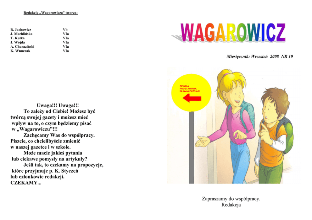 Redakcję „Wagarowicza” tworzą: B. Jachowicz J. Mechlińska T. Kulka J. Wojda A. Charaziński K. Wnuczak Vb VIa VIa VIa VIa VIa Miesięcznik: Wrzesień 2008 NR 10 SZKOŁA PODSTAWOWA IM.JANA PAWŁA II Uwaga!!! Uwaga!!! To zaleŜy od Ciebie! MoŜesz być twórcą swojej gazety i moŜesz mieć wpływ na to, o czym będziemy pisać w „Wagarowiczu”!!! Zachęcamy Was do współpracy. Piszcie, co chcielibyście zmienić w naszej gazetce i w szkole. MoŜe macie jakieś pytania lub ciekawe pomysły na artykuły? Jeśli tak, to czekamy na propozycje, które przyjmuje p. K. Styczeń lub członkowie redakcji. CZEKAMY... Zapraszamy do współpracy. Redakcja CZEŚĆ!!! KONIEC WAKACJI śegnajcie, lasy zielone, śegnajcie, rzeki błękitne. JuŜ jesień idzie przez łąki I wrzosem liliowo kwitnie. Witamy Was po wakacjach na łamach naszej gazetki! Wierzymy, Ŝe jesteście wypoczęci i z zapałem rozpoczęliście rok szkolny 2008/2009. Tadeusz Kubiak śyczymy Wam samych sukcesów w nauce!!! I jednocześnie mamy nadzieję, Ŝe spodobają się Wam przygotowane przez nas artykuły. Redakcja „Wagarowicza”. A NAM JEST SZKODA LATA… chwila wspomnień z kolonii z śelistrzewa niezapomniane przeŜycia z wioski indiańskiej… czas relaksu... pod bacznym okiem opiekunów z naszej szkoły… finał randki w ciemno W szkole wcale nie jest nudno. Pozory mylą, czyli uczniowski humor. SENNIK Nauczycielka do Małgosi: - Przyznaj się ściągałaś od Jasia! - A skąd pani o tym wie? - Bo obok ostatniego pytania on napisał: „nie wiem”, a ty „ja teŜ”. BagaŜ – kłopoty. Dół – smutek. Jajko – zapowiada szczęście i zdrowie. Oczy – ktoś próbuje cię oszukać. Bal - radosne wydarzenia. Nauczycielka pyta dzieci: - Jakie macie zwierzęta w domach? - Ja mam psa. - A ja mam kota. - A ja mam kurczaka w zamraŜarce... - mówi Jaś. BEATA – jest powaŜna, troskliwa. Lubi czasem rozkazywać, ale i słuchać. Niezwykle ceni sobie spokój, albowiem w Ŝyciu kieruje się głównie uczuciem. Uwielbia przyrodę i dalekie podróŜe, dosyć Poznajcie sekrety swojego imienia. MoŜecie odkryć, jaką często przebywa poza domem. tajemnicę kryją Wasze imiona. MATEUSZ - jest niezwykle odpowiedzialny, prawdomówny, sprawiedliwy. Raz podjęte postanowienia i raz dane słowo, realizuje z Ŝelazną konsekwencją, choćby miał ponieść straty. Chętnie innym GABRIELA - ma niezwykły umysł, szerokie horyzonty, wrodzony dar do badań naukowych. Zachwyca ją wszystko, co piękne i jest w harmonii z otoczeniem. Wskazane są dla niej wszelkie zawody związane z tworzeniem nowych przestrzeni, czy pomaga. to dosłownie jako architekt, czy teŜ bardziej metaforycznie – jako MICHAŁ - jest dobry, pogodny, inteligentny, słuŜy chętnie pomocą. Często podejmuje się działań, których nie moŜe wykonać. Sprawia wraŜenie człowieka zarozumiałego. muzyk i pisarz. MARIA - cechuje ją doskonałość. Ma rozwiniętą intuicję. Jest przy tym wnikliwa i stara się zawsze dotrzeć do istoty PIOTR - bywa surowy, twardy, ale jednocześnie grzeczny i układny. Jest wielkim myślicielem, czasem zŜera go ambicja. Zainteresowany jest rzeczami wielkimi, nie odkrytymi tajemnicami, nauką. Lubiany w środowisku zawodowym i domowym. Czasem roztargniony, czym denerwuje najbliŜszych. problemu. Do Ŝyciowych zadań podchodzi w sposób perfekcyjny i często innym ludziom stawia wysokie wymagania. Oddana Ŝyciu rodzinnemu, ale i wiele Ŝądająca od tych, których kocha. Inauguracja roku szkolnego 2008/09 Z śYCIA NASZEJ SZKOŁY Wszystko co dobre, kończy się. Nadszedł wrzesień i przyszła pora powrócić do nauki i pracy. Nadchodzące miesiące to czas nowych znajomości, przyjaźni, róŜnorodnych uroczystości, sukcesów, a czasami niepowodzeń. Ale pamiętajmy: za rok znów będą wakacje... 01.09.2008 roku w hali sportowej Zespołu Szkół w Michałowicach odbyło się uroczyste rozpoczęcie roku szkolnego 2008/09. Dyrektor Zespołu Szkół pan Andrzej Olęcki powitał zgromadzonych uczniów, szczególnie klas pierwszych, licznie przybyłych rodziców i grono pedagogiczne. Przedstawił nowych nauczycieli. Gościem honorowym był Wójt Gminy Michałowice pan Roman Lawrence. śyczymy wszystkim uczniom, aby nauka była dla nich przyjemnym obowiązkiem i pasmem sukcesów. Sprzątanie świata Tradycją naszej szkoły jest wrześniowa akcja „Sprzątanie świata”. Organizują ją nauczyciele biologii p. B. CzyŜewska i p. A. Wąsowicz – Ciechomska we współpracy z Gminą Michałowice. 13.09.2008 roku uczniowie naszej szkoły wraz z wychowawcami sprzątali wyznaczone obszary Michałowic. Mimo brzydkiej pogody, wszyscy z zapałem wzięli się za sprzątanie, świadomi, Ŝe czystość naszego najbliŜszego otoczenia zaleŜy od nas samych i świadczy o naszej kulturze. NaleŜy zauwaŜyć, Ŝe śmieci w tym roku było wyjątkowo mało. Akcja „Sprzątanie Świata" wywodzi się z Australii. Po raz pierwszy odbyła się tam w 1989 roku. Wówczas 40 tysięcy mieszkańców Sydney wzięło udział w sprzątaniu terenów portu. W kolejnych latach akcja zataczała coraz szersze kręgi, aŜ w 1993 roku trafiła równieŜ do Polski, gdzie jej koordynacją od lat zajmuje się Fundacja „Nasza Ziemia". Tegoroczne hasło kampanii brzmi „Posprzątajmy polskie lasy!” Pamiętajmy, Ŝe lasy są nie tylko ostoją tysięcy gatunków roślin i zwierząt, ale szczególnie w obecnych czasach mogą skutecznie przeciwdziałać zmianom klimatycznym. Las pochłania dwutlenek węgla oraz inne szkodliwe substancje na przykład pyły, produkuje tlen, stabilizuje wilgotność powietrza, chroni przed szkodliwym wpływem przemysłu, osłania gleby i wody, magazynuje wodę opadową i zmniejsza siłę wiatrów (w tym tornad, huraganów). Las wymaga troski ze strony nas wszystkich, gdyŜ z jego dobrodziejstw korzystać będą równieŜ przyszłe pokolenia. Ciekawostki czyli co ciekawego dzieje się na świecie? 600 tysięcy laptopów rocznie gubią