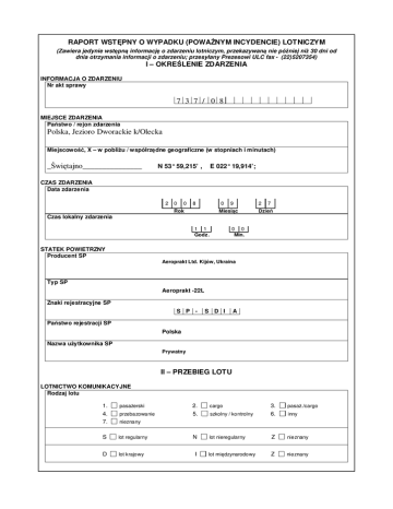 RAPORT WSTĘPNY O WYPADKU (POWAŻNYM INCYDENCIE) LOTNICZYM (Zawiera jedynie wstępną informację o zdarzeniu lotniczym, przekazywaną nie później niż 30 dni od dnia otrzymania informacji o zdarzeniu; przesyłany Prezesowi ULC fax - (22)5207354) I – OKREŚLENIE ZDARZENIA INFORMACJA O ZDARZENIU Nr akt sprawy 7 3 7 / 0 8 MIEJSCE ZDARZENIA Państwo / rejon zdarzenia Polska, Jezioro Dworackie k/Olecka Miejscowość, X – w pobliżu / współrzędne geograficzne (w stopniach i minutach) _Świętajno_______________ N 53° 59,215’ , E 022° 19,914’; CZAS ZDARZENIA Data zdarzenia 2 0 0 8 0 Rok Czas lokalny zdarzenia 9 Miesiąc 1 1 Godz. 2 7 Dzień 0 0 Min. STATEK POWIETRZNY Producent SP Aeroprakt Ltd. Kijów, Ukraina Typ SP Aeroprakt -22L Znaki rejestracyjne SP S P - S D I A Państwo rejestracji SP Polska Nazwa użytkownika SP Prywatny II – PRZEBIEG LOTU LOTNICTWO KOMUNIKACYJNE Rodzaj lotu 1. 4. 7. pasażerski S lot regularny D lot krajowy przebazowanie 2. 5. cargo pasaż./cargo szkolny / kontrolny 3. 6. N lot nieregularny Z nieznany lot międzynarodowy Z nieznany inny nieznany I LOTNICTWO OGÓLNEGO PRZEZNACZENIA Rodzaj lotu Szkolny lub treningowy 10. z instruktorem 1Y. inny 11. samodzielny Niehandlowy 20. w celach własnych 23. specjalny 2Z. nieznany 21. 24. służbowy 22. nad otwartym morzem 2Y. rządowy inny Handlowy 30. lot agro 33. lot reklamowy 36. transport drewna 31. 34. 37. lot gaśniczy 32. z ładunkiem podwiesz. I 35. nad otwartym morzem 3Y lot obserwacyjny lot sanitarny inny Loty różne 40. lot badawczy 43. lot poszukiwawczy 4Y. inny 41. 44. 4Z. nielegalny pokazowy / sportowy nieznany 42. 45. przebazowanie akwizyc./ pokaz. spółka sprzedaż / wynajem 3. Y. przeds. Państw. inny 12. kontrolny Rodzaj użytkownika 1. 4. Z. aeroklub / szkoła lotn. użytk. Prywatny nieznany 2. 5. TRASA LOTU Ostatni punkt odlotu T U R O Ś L K O Ś C I E L N A Nazwa miejscowości w pisowni lokalnej – litery łacińskie Czy: S taki sam jak nazwa miejscowości, w której zaistniało zdarzenie Planowany punkt docelowy R O S T K I p o w. P I S K I Nazwa miejscowości w pisowni lokalnej – litery łacińskie Czy: S 1 0 0 taki sam jak nazwa miejscowości, w której zaistniało zdarzenie Długotrwałość lotu DO DNIA RAPORTU WSTĘPNEGO NIE USTALONO zdarzenie zaistniało na ziemi III – OBRAŻENIA CIAŁA Załoga Śmiertelne Poważne Nieznaczne 1 Nie było 2 Pasażerowie 1 Osoby postronne Uwaga: Dane wiadome w dniu pisania raportu 2 Nieznane IV – USZKODZENIA Uszkodzenia statku powietrznego D zniszczony S poważnie uszkodzony M nieznacznie uszkodzony N nie było Z nie ustalono V – INFORMACJA METEOROLOGICZNA Ogólna sytuacja meteorologiczna 1 VMC 2 IMC Z nie ustalono Warunki oświetlenia 1 świt 2 oświetlenie dzienne 3 zmierzch 4 noc księżycowa 5 noc ciemna Z nie ustalono KOLEJNOŚĆ WYSTĘPOWANIA WYDARZEŃ KOLEJNOŚĆ ZDARZEŃ: ETAP LOTU: 1) Przylot z Bielska Podlaskiego na lądowisko w Przebazowanie Turośli Kościelnej 2) Zabranie pasażera z Turośli Kościelnej 3) Start z Turośli Kościelnej z planem wykonania lotu na lądowisko w Rostkach (pow. Pisz) z Start do zaplanowanego przelotu punktem zwrotnym nad Jeziorem Dworackim 4) Wykonanie około 20-30 min. lotu w rejonie Manewry nad punktem zwrotnym trasy Jeziora Dworackiego na małej wysokości 5) Wykonanie lotu ze zniżaniem w kierunku jeziora a następnie przejście na strome wznoszenie połączone z wykonaniem zakrętu o około 120° w lewo 6) Gwałtowne pochylenie samolotu i zderzenie z wodą pod kątem około 45° z wysokości Zderzenie z wodą szacowanej na około 30 m 3 CZĘŚĆ OPISOWA: Opis nie powinien zawierać więcej niż 200 słów i przedsta wiać informacje w następującej kolejności: 1) 2) 3) Krótki opis zdarzenia, z uwzględnieniem sytuacji nagłych i znaczących informacji; Dodatkowe u wagi, z uwzględnieniem szczegółowiej informacji dot. przedmiotów, które zostały zamieszczone pod nagłówkiem „inne”. Zalecenia dotyczące bezpieczeństwa lub podjęte działania naprawcze lub takie, które są brane pod uwagę. Uwaga: Zalecane jest wypełnianie literami drukowanymi lub na komputerze Opis zdarzenia: W dniu 27 września 2008 r. pilot posiadający (według oświadczeń świadków) świadectwo kwalifikacji pilota samolotu ultralekkiego uzyskane podczas szkolenia na Litwie, zaplanował wykonanie przelotu turystycznego z pasażerem na samolocie ultralekkim Aeroprakt-22L o znakach rozpoznawczych SP-SDIA. Celem przelotu było lądowanie na lądowisku w Rostkach (pow. Pisz) i powrót następnego dnia. W czasie przelotu do Rostek pilot miał wykonać przelot nad jeziorem Dworackim, nad którego brzegiem znajdowała się działka rekreacyjna pasażera samolotu. Według zeznań świadków, samolot przyleciał nad jezioro około godziny 10.40 i wykonywał przez około 20 minut loty na małej wysokości w rejonie działki pasażera. Około godziny 11.00 jeden ze świadków (znajdujący się na jeziorze w łódce), zauważył samolot nadlatujący z nad lasu porastającego brzeg jeziora. Samolot zniżał się w kierunku tafli wody (był widoczny na tle drzew) a następnie wykonał gwałtowny zakręt w lewo o około 120° przechodząc na strome wznoszenie (w kierunku działki pasażera). Po osiągnięciu wysokości około 30-50 metrów samolot nagle pochylił się i w locie nurkowym zderzył się z wodą pod kątem około 45°. Żaden ze świadków nie zauważył aby w czasie lotu silnik samolotu pracował nieregularnie lub przerwał pracę. Oględziny miejsca zatonięcia samolotu wykazały, że samolot znajdował się na głębokości 6 metrów wbity w muliste dno pod kątem 45°. Uszkodzenia struktury samolotu potwierdzały przebieg ostatniej fazy lotu zaobserwowany przez świadka. Załoga samolotu znajdowała się w kabinie i miała zapięte pasy bezpieczeństwa. Samolot był wyposażony w pirotechniczny spadochronowy system ratowniczy, który był odbezpieczony ale nie było próby jego użycia. Oględziny silnika prz