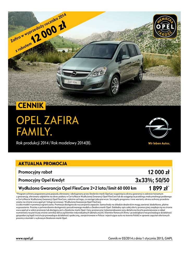 4 201 a k ni ł z 0 cz ro aży 0 0 12 zed r p y ww a r Zafi m ate b a zr Cennik OPEL ZAFIRA FAMILY. Rok produkcji 2014 / Rok modelowy 2014(B). AKTUALNA PROMOCJA 12 000 zł Promocyjny Opel Kredyt 3x33%; 50/50 Wydłużona Gwarancja Opel FlexCare 2+2 lata / limit 60 000 km 1 899 zł * Promocyjny rabat *Program ochrony pogwarancyjnej pojazdu oferowany i obsługiwany przez Dealerów marki Opel po wygaśnięciu okresu gwarancji o zakresie tożsamym z gwarancją, oferowany odpłatnie na okres podany w Certyfikacie Wydłużonej Gwarancji Opel FlexCare lub do osiągnięcia przebiegu maksymalnego podanego w Certyfikacie Wydłużonej Gwarancji Opel FlexCare, zależnie od tego, co nastąpi jako pierwsze. Szczegóły programu i inne warianty okresu ochrony przedstawiamy na stronie www.opel.pl / Usługi serwisowe / Wydłużona Gwarancja Opel FlexCare. Liczba modeli w promocji ograniczona. Promocja dostępna do wyczerpania zapasów. Samochody na składzie dealerskim mogą zawierać dodatkowe, płatne wyposażenie. Prosimy o potwierdzenie dostępności poszukiwanego modelu u Dealera marki Opel. Dokładny opis całej oferty promocyjnej znajduje się na stronie www.opel.pl w sekcji promocje lub dostępny jest u Dealerów marki Opel. Ceny promocyjne (rekomendowane ceny detaliczne brutto pomniejszone o rabat wymieniony na pierwszej stronie cennika) dotyczą klientów indywidualnych (detalicznych). Klientów flotowych (firmy i przedsiębiorstwa prowadzące działalność gospodarczą bądź instytucje prowadzące działalność społeczną, zarejestrowane w Polsce i rejestrujące auto na terenie Polski) w sprawie zapytań ofertowych prosimy o kontakt z wybranym Dealerem marki Opel. www.opel.pl Cennik nr 03/2014 z dnia 1 stycznia 2015, GMPL Cennik – Opel Zafira Family Rok produkcji 2014, rok modelowy 2014(B)* Ceny promocyjne** Family Active 1.8 Ecotec (120 KM) M5 61 900 1.8 Ecotec (140 KM) M5 63 900 1.7 CDTI Ecotec (110 KM) M6 69 900 1.7 CDTI Ecotec (125 KM) M6 71 900 * Dotyczy samochodów produkowanych od 30 czerwca 2014 . ** Liczba modeli w promocji ograniczona. Promocja dostępna do wyczerpania zapasów. Samochody na składzie dealerskim mogą zawierać dodatkowe, płatne wyposażenie. Prosimy o potwierdzenie dostępności poszukiwanego modelu u Dealera marki Opel. Dokładny opis całej oferty promocyjnej znajduje się na stronie www.opel.pl w sekcji promocje lub dostępny jest u Dealerów marki Opel. Ceny promocyjne (rekomendowane ceny detaliczne brutto pomniejszone o rabat wymieniony na pierwszej stronie cennika) dotyczą zarówno klientów indywidualnych (detalicznych) jak i klientów flotowych (firmy i przedsiębiorstwa prowadzące działalność gospodarczą bądź instytucje prowadzące działalność społeczną, zarejestrowane w Polsce i rejestrujące auto na terenie Polski). Rabat od producenta jest jednakowy dla klientów indywidualnych i flotowych, Dealerzy marki Opel swobodnie kształtują własną cenę sprzedaży modelu kampanijnego Active. Ceny katalogowe Family Active 1.8 Ecotec (120 KM) M5 73 900 1.8 Ecotec (140 KM) M5 75 900 1.7 CDTI Ecotec (110 KM) M6 81 900 1.7 CDTI Ecotec (125 KM) M6 83 900 Cennik Opla Zafiry Family Active, rok produkcji 2014, rok modelowy 2014B, nr 03/2014 z dnia 1 stycznia 2015 1/3 Wyposażenie standardowe Family Active Tapicerka Twist/Elba lub Alpha/Elba, czarna Podłokietnik fotela kierowcy Klimatyzacja sterowana elektronicznie Zawiera: wyświetlacz graficzny Radioodtwarzacz CD 30 MP3. Zawiera: 6-głośnikowy system audio, złącze AUX-in Elektrycznie sterowane, składane i podgrzewane lusterka zewnętrzne w kolorze nadwozia Strukturalne obręcze kół, stalowe 16x6,5” z oponami 205/55 R16 Układ stabilizacji toru jazdy ESP® z Traction Control i systemem wspomagania ruszania na pochyłościach System monitorowania ciśnienia w oponach Gniazdko 12 V w drugim rzędzie siedzeń / w przedziale bagażowym (tylko z zestawem naprawczym) Przesuwana dzielona kanapa w drugim rzędzie siedzeń Przednie i boczne poduszki powietrzne kierowcy i pasażera, poduszki kurtynowe Pakiet Oświetleniowy 1. Zawiera: Oświetlenie wnętrza pojazdu z przodu i z tyłu Kierownica trójramienna pokryta skórą z przyciskami sterowania Komputer pokładowy Przyciemniane tylne szyby Listwy ozdobne przy dolnej krawędzi okien bocznych, chromowane Reflektory przeciwmgielne Relingi dachowe, srebrne TABR/XXTC DA7 C68 UCH DDH/DP6 CW49 FX3 UJ6 KC7/KC8 AV4 AY0 TSP N34 U68 A14 BW4 T96 V3E S S S S S S S S S S S S S S S S S S Wyposażenie dodatkowe NADWOZIE Lakier metaliczny / perłowy / opalizujący Hak holowniczy VQ9 Reflektory bi-ksenonowe AFL TT2 Obręcze kół ze stopów lekkich 16x6,5”, z oponami 205/55 R16 CW50 Obręcze kół ze stopów lekkich 17x7,0”, z oponami 225/45 R17 CW46/47 Dojazdowe koło zapasowe (zastępuje dostępny w standardzie zestaw naprawczy) * N65 Pełnowymiarowe koło zapasowe stalowe 16” (zastępuje dostępny w standardzie zestaw naprawczy) QQ5 WNĘTRZE Elektrycznie sterowane tylne szyby A33 Popielniczka i zapalniczka (pakiet dla palących) DT4 Panele ozdobne wnętrza w kolorze Piano Black VVH Siatka zabezpieczająca bagaż. Zawiera: zaczepy do zamocowania siatki w bagażniku. AP9 System mocowania bagażu FlexRail ANY Dodatkowe elektryczne ogrzewanie w systemie nawiewu powietrza (niedostępne z K07) C32 Ogrzewanie postojowe (niedostępne z C32) K07 Radioodtwarzacz CD 40 USB. Zawiera: złącza AUX-in i USB 2GB Radioodtwarzacz CD MP3 „Touch&Connect” z nawigacją. Zawiera: kolorowy wyświetlacz 5”, złącza AUX-in i USB. Komunikaty w jęz. ang. UFZ Portal telefonu komórkowego Bluetooth® ze sterowaniem głosowym UWA BEZPIECZEŃSTWO I UKŁADY WSPOMAGAJĄCE KIEROWCĘ Alarm. Zawiera system ryglujący „deadlock” UA6 Aktywne zagłówki foteli przednich A88 Tempomat K34 Czujniki parkowania, przód i tył UD5 PAKIETY WYPOSAŻENIA DODATKOWEGO Pakiet Komfortowy 1 AH4 Fotel kierowcy regulowany w 6 kierunkach, regulacja podparcia lędźwiowego fotela kierowcy. Pakiet Komf