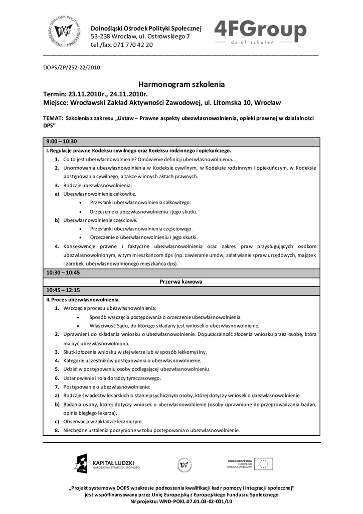 Dolnośląski Ośrodek Polityki Społecznej 53-238 Wrocław, ul. Ostrowskiego 7 tel./fax. 071 770 42 20 __________________________________________________________________________________ DOPS/ZP/252-22/2010 Harmonogram szkolenia Termin: 23.11.2010r., 24.11.2010r. Miejsce: Wrocławski Zakład Aktywności Zawodowej, ul. Litomska 10, Wrocław TEMAT: Szkolenia z zakresu „Ustaw – Prawne aspekty ubezwłasnowolnienia, opieki prawnej w działalności DPS” 9:00 – 10:30 I. Regulacje prawne Kodeksu cywilnego oraz Kodeksu rodzinnego i opiekuńczego. 1. Co to jest ubezwłasnowolnienie? Omówienie definicji ubezwłasnowolnienia. 2. Unormowania ubezwłasnowolnienia w Kodeksie cywi lnym, w Kodeksie rodzinnym i opiekuńczym, w Kodeksie postępowania cywilnego, a także w innych aktach prawnych. 3. Rodzaje ubezwłasnowolnienia: a) Ubezwłasnowolnienie całkowit e.  Przesłanki ubezwłasnowolnienia całkowitego.  Orzeczenie o ubezwłasnowolnieniu i jego skutki. b) Ubezwłasnowolnienie częściowe.  Przesłanki ubezwłasnowolnienia częściowego.  Orzeczenie o ubezwłasnowolnieniu i jego skutki. 4. Konsekwencje prawne i faktyczne ubezwłasnowolnienia oraz zakres praw przysługujących osobom ubezwłasnowolnionym, w tym mi eszkańcom dps (np. zawieranie umów, załat wianie spraw urzędowych, majątek i zarobek ubezwłasnowolnionego mieszkańca dps). 10:30 – 10:45 Przerwa kawowa 10:45 – 12:15 II. Proces ubezwłasnowolnienia. 1. Wszczęcie procesu ubezwłasnowolnienia:  Sposób wszczęcia postępowania o orzeczenie ubezwłasnowolnienia.  Właściwość Sądu, do którego składany jest wniosek o ubezwłasnowolnienie. 2. Uprawnieni do składania wniosku o ubezwłasnowolnienie. Dopuszczalność złożenia wniosku przez osobę, która ma być ubezwłasnowolniona. 3. Skutki złożenia wniosku w złej wierze lub w sposób lekkomyślny. 4. Kategorie uczestników postępowania o ubezwłasnowolnienie. 5. Udział w postępowaniu osoby podlegającej ubezwłasnowolnieniu. 6. Ustanowienie i rola doradcy tymczasowego. 7. Postępowanie o ubezwłasnowolnienie: a) Rodzaje świadectw lekarskich o stanie psychicznym osoby, której dotyczy wniosek o ubezwłasnowolnienie. b) Badania osoby, której dotyczy wniosek o ubezwłasnowolnienie (osoby uprawnione do przeprowadzania badań, opinia biegłego lekarza). c) Obserwacja w zakładzie leczniczym. 8. Niezbędne ustalenia poczynione w toku postępowania o ubezwłasnowolnienie. „Projekt systemowy DOPS w zakresie podnoszenia kwalifikacji kad r pomocy i integracji społecznej” jest współfinansowany przez Unię Europejską z Europejskiego Funduszu Społecznego Nr projektu: WND-POKL.07.01.03-02-001/10 Dolnośląski Ośrodek Polityki Społecznej 53-238 Wrocław, ul. Ostrowskiego 7 tel./fax. 071 770 42 20 __________________________________________________________________________________ 9. Orzeczenie o ubezwłasnowolnieniu. 10. Przesłanki uchylenia ubezwłasnowolnienia. 12:15 – 12:45 Lunch 12:45 – 14:15 III. Opieka prawna i kuratela. 1. Znaczenie terminu „opieka”. 2. Ustanowienie opieki dla osoby całkowicie ubezwłasnowolnionej: a) Postępowanie o ustanawiania opieki.  Kandydaci na opiekuna osoby całkowicie ubezwłasnowolnionej i kryteria ich weryfikacji .  Obowiązek objęcia opieki.  Złożenie przyrzeczenia. 3. Sprawowani e opieki przez opiekuna prawnego.  Prawna treść opieki.  Piecza nad osobą pupila.  Piecza nad majątkiem pozostającego pod opieką.  Reprezentacja osoby pozostającej pod opieką.  Wynagrodzenie i zwrot nakładów opiekuna. 4. Nadzór Sądu nad sprawowaniem opieki . 5. Zwolnienie opiekuna.  Przyczyny i skutki ustania opieki. 6. Charakter prawny kurateli . 7. Kuratela dla osoby częściowo ubezwłasnowolnionej 8. Reprezentowanie osoby częściowo ubezwłasnowolnionej przez jej kuratora. 9. Piecza nad osobą ubezwłasnowolnioną częściowo. 10. Ustanie kurateli. 11. Doradca tymczasowy. 14:15 – 14:30 Przerwa kawowa 14:30– 16:00 IV. Procedury postępowania. 1. Postępowanie o ubezwłasnowolnienie. 2. Postępowanie w sprawie o zezwolenie na dokonanie czynności przekraczającej zakres zwykłego zarządu majątki em osoby ubezwłasnowolnionej. 3. Postępowanie w sprawie o uchylenie ubezwłasnowolnienia. V. Sporządzenie wniosku o ubezwłasnowolnienie – zajęcia praktyczne. „Projekt systemowy DOPS w zakresie podnoszenia kwalifikacji kad r pomocy i integracji społecznej” jest współfinansowany przez Unię Europejską z Europejskiego Funduszu Społecznego Nr projektu: WND-POKL.07.01.03-02-001/10