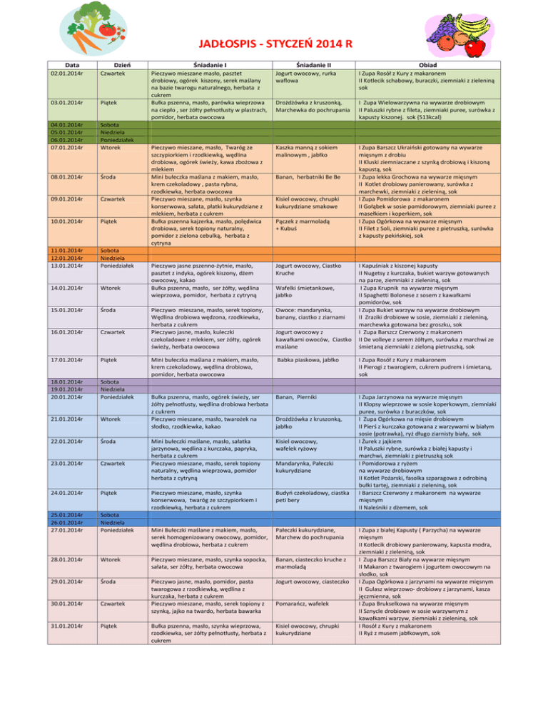 JADŁOSPIS - STYCZEŃ 2014 R Data Dzień 02.01.2014r Czwartek 03.01.2014r Piątek 04.01.2014r 05.01.2014r 06.01.2014r 07.01.2014r Sobota Niedziela Poniedziałek Wtorek 08.01.2014r Środa 09.01.2014r Czwartek 10.01.2014r Piątek 11.01.2014r 12.01.2014r 13.01.2014r Sobota Niedziela Poniedziałek 14.01.2014r Wtorek 15.01.2014r Środa 16.01.2014r Czwartek 17.01.2014r Piątek 18.01.2014r 19.01.2014r 20.01.2014r Sobota Niedziela Poniedziałek 21.01.2014r Wtorek 22.01.2014r Środa 23.01.2014r Czwartek 24.01.2014r Piątek 25.01.2014r 26.01.2014r 27.01.2014r Sobota Niedziela Poniedziałek 28.01.2014r Śniadanie I Śniadanie II Obiad Pieczywo mieszane masło, pasztet drobiowy, ogórek kiszony, serek maślany na bazie twarogu naturalnego, herbata z cukrem Bułka pszenna, masło, parówka wieprzowa na ciepło , ser żółty pełnotłusty w plastrach, pomidor, herbata owocowa Jogurt owocowy, rurka waflowa I Zupa Rosół z Kury z makaronem II Kotlecik schabowy, buraczki, ziemniaki z zieleniną sok Drożdżówka z kruszonką, Marchewka do pochrupania I Zupa Wielowarzywna na wywarze drobiowym II Paluszki rybne z fileta, ziemniaki puree, surówka z kapusty kiszonej. sok (513kcal) Pieczywo mieszane, masło, Twaróg ze szczypiorkiem i rzodkiewką, wędlina drobiowa, ogórek świeży, kawa zbożowa z mlekiem Mini bułeczka maślana z makiem, masło, krem czekoladowy , pasta rybna, rzodkiewka, herbata owocowa Pieczywo mieszane, masło, szynka konserwowa, sałata, płatki kukurydziane z mlekiem, herbata z cukrem Bułka pszenna kajzerka, masło, polędwica drobiowa, serek topiony naturalny, pomidor z zielona cebulką, herbata z cytryna Kaszka manną z sokiem malinowym , jabłko I Zupa Barszcz Ukraiński gotowany na wywarze mięsnym z drobiu II Kluski ziemniaczane z szynką drobiową i kiszoną kapustą, sok I Zupa lekka Grochowa na wywarze mięsnym II Kotlet drobiowy panierowany, surówka z marchewki, ziemniaki z zieleniną, sok I Zupa Pomidorowa z makaronem II Gołąbek w sosie pomidorowym, ziemniaki puree z masełkiem i koperkiem, sok I Zupa Ogórkowa na wywarze mięsnym II Filet z Soli, ziemniaki puree z pietruszką, surówka z kapusty pekińskiej, sok Pieczywo jasne pszenno-żytnie, masło, pasztet z indyka, ogórek kiszony, dżem owocowy, kakao Bułka pszenna, masło, ser żółty, wędlina wieprzowa, pomidor, herbata z cytryną Jogurt owocowy, Ciastko Kruche Banan, herbatniki Be Be Kisiel owocowy, chrupki kukurydziane smakowe Pączek z marmoladą + Kubuś Wafelki śmietankowe, jabłko I Kapuśniak z kiszonej kapusty II Nugetsy z kurczaka, bukiet warzyw gotowanych na parze, ziemniaki z zieleniną, sok I Zupa Krupnik na wywarze mięsnym II Spaghetti Bolonese z sosem z kawałkami pomidorów, sok I Zupa Bukiet warzyw na wywarze drobiowym II Zraziki drobiowe w sosie, ziemniaki z zieleniną, marchewka gotowana bez groszku, sok I Zupa Barszcz Czerwony z makaronem II De volleye z serem żółtym, surówka z marchwi ze śmietaną ziemniaki z zieloną pietruszką, sok Pieczywo mieszane, masło, serek topiony, Wędlina drobiowa wędzona, rzodkiewka, herbata z cukrem Pieczywo jasne, masło, kuleczki czekoladowe z mlekiem, ser żółty, ogórek świeży, herbata owocowa Owoce: mandarynka, banany, ciastko z ziarnami Mini bułeczka maślana z makiem, masło, krem czekoladowy, wędlina drobiowa, pomidor, herbata owocowa Babka piaskowa, jabłko I Zupa Rosół z Kury z makaronem II Pierogi z twarogiem, cukrem pudrem i śmietaną, sok Bułka pszenna, masło, ogórek świeży, ser żółty pełnotłusty, wędlina drobiowa herbata z cukrem Pieczywo mieszane, masło, twarożek na słodko, rzodkiewka, kakao Banan, Pierniki I Zupa Jarzynowa na wywarze mięsnym II Klopsy wieprzowe w sosie koperkowym, ziemniaki puree, surówka z buraczków, sok I Zupa Ogórkowa na mięsie drobiowym II Pierś z kurczaka gotowana z warzywami w białym sosie (potrawka), ryż długo ziarnisty biały, sok I Żurek z jajkiem II Paluszki rybne, surówka z białej kapusty i marchwi, ziemniaki z pietruszką sok I Pomidorowa z ryżem na wywarze drobiowym II Kotlet Pożarski, fasolka szparagowa z odrobiną bułki tartej, ziemniaki z zieleniną, sok I Barszcz Czerwony z makaronem na wywarze mięsnym II Naleśniki z dżemem, sok Jogurt owocowy z kawałkami owoców, Ciastko maślane Drożdżówka z kruszonką, jabłko Mini bułeczki maślane, masło, sałatka jarzynowa, wędlina z kurczaka, papryka, herbata z cukrem Pieczywo mieszane, masło, serek topiony naturalny, wędlina wieprzowa, pomidor herbata z cytryną Kisiel owocowy, wafelek ryżowy Pieczywo mieszane, masło, szynka konserwowa, twaróg ze szczypiorkiem i rzodkiewką, herbata z cukrem Budyń czekoladowy, ciastka peti bery Mini Bułeczki maślane z makiem, masło, serek homogenizowany owocowy, pomidor, wędlina drobiowa, herbata z cukrem Pałeczki kukurydziane, Marchew do pochrupania Wtorek Pieczywo mieszane, masło, szynka sopocka, sałata, ser żółty, herbata owocowa Banan, ciasteczko kruche z marmoladą 29.01.2014r Środa Jogurt owocowy, ciasteczko 30.01.2014r Czwartek Pieczywo jasne, masło, pomidor, pasta twarogowa z rzodkiewką, wędlina z kurczaka, herbata z cukrem Pieczywo mieszane, masło, serek topiony z szynką, jajko na twardo, herbata bawarka 31.01.2014r Piątek Bułka pszenna, masło, szynka wieprzowa, rzodkiewka, ser żółty pełnotłusty, herbata z cukrem Kisiel owocowy, chrupki kukurydziane Mandarynka, Pałeczki kukurydziane Pomarańcz, wafelek I Zupa z białej Kapusty ( Parzycha) na wywarze mięsnym II Kotlecik drobiowy panierowany, kapusta modra, ziemniaki z zieleniną, sok I Zupa Barszcz Biały na wywarze mięsnym II Makaron z twarogiem i jogurtem owocowym na słodko, sok I Zupa Ogórkowa z jarzynami na wywarze mięsnym II Gulasz wieprzowo- drobiowy z jarzynami, kasza jęczmienna, sok I Zupa Brukselkowa na wywarze mięsnym II Sznycle drobiowe w sosie warzywnym z kawałkami warzyw, ziemniaki z zieleniną, sok I Rosół z Kury z makaronem II Ryż z musem jabłkowym, sok