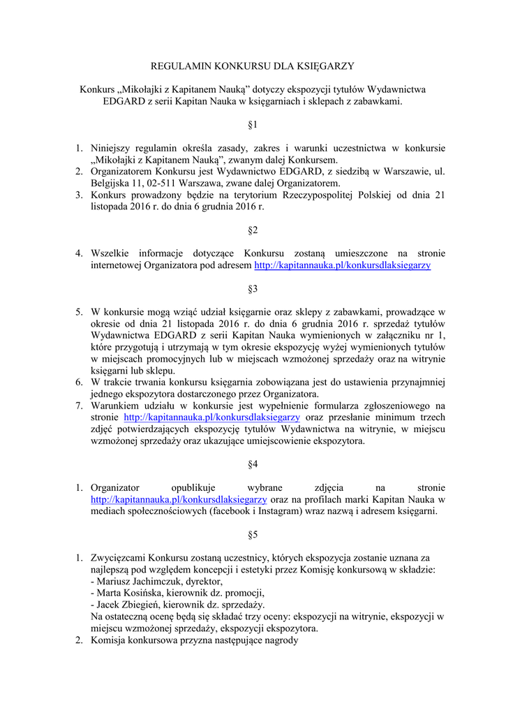 REGULAMIN KONKURSU DLA KSIĘGARZY Konkurs „Mikołajki z Kapitanem Nauką” dotyczy ekspozycji tytułów Wydawnictwa EDGARD z serii Kapitan Nauka w księgarniach i sklepach z zabawkami. §1 1. Niniejszy regulamin określa zasady, zakres i warunki uczestnictwa w konkursie „Mikołajki z Kapitanem Nauką”, zwanym dalej Konkursem. 2. Organizatorem Konkursu jest Wydawnictwo EDGARD, z siedzibą w Warszawie, ul. Belgijska 11, 02-511 Warszawa, zwane dalej Organizatorem. 3. Konkurs prowadzony będzie na terytorium Rzeczypospolitej Polskiej od dnia 21 listopada 2016 r. do dnia 6 grudnia 2016 r. §2 4. Wszelkie informacje dotyczące Konkursu zostaną umieszczone na stronie internetowej Organizatora pod adresem http://kapitannauka.pl/konkursdlaksiegarzy §3 5. W konkursie mogą wziąć udział księgarnie oraz sklepy z zabawkami, prowadzące w okresie od dnia 21 listopada 2016 r. do dnia 6 grudnia 2016 r. sprzedaż tytułów Wydawnictwa EDGARD z serii Kapitan Nauka wymienionych w załączniku nr 1, które przygotują i utrzymają w tym okresie ekspozycję wyżej wymienionych tytułów w miejscach promocyjnych lub w miejscach wzmożonej sprzedaży oraz na witrynie księgarni lub sklepu. 6. W trakcie trwania konkursu księgarnia zobowiązana jest do ustawienia przynajmniej jednego ekspozytora dostarczonego przez Organizatora. 7. Warunkiem udziału w konkursie jest wypełnienie formularza zgłoszeniowego na stronie http://kapitannauka.pl/konkursdlaksiegarzy oraz przesłanie minimum trzech zdjęć potwierdzających ekspozycję tytułów Wydawnictwa na witrynie, w miejscu wzmożonej sprzedaży oraz ukazujące umiejscowienie ekspozytora. §4 1. Organizator opublikuje wybrane zdjęcia na stronie http://kapitannauka.pl/konkursdlaksiegarzy oraz na profilach marki Kapitan Nauka w mediach społecznościowych (facebook i Instagram) wraz nazwą i adresem księgarni. §5 1. Zwycięzcami Konkursu zostaną uczestnicy, których ekspozycja zostanie uznana za najlepszą pod względem koncepcji i estetyki przez Komisję konkursową w składzie: - Mariusz Jachimczuk, dyrektor, - Marta Kosińska, kierownik dz. promocji, - Jacek Zbiegień, kierownik dz. sprzedaży. Na ostateczną ocenę będą się składać trzy oceny: ekspozycji na witrynie, ekspozycji w miejscu wzmożonej sprzedaży, ekspozycji ekspozytora. 2. Komisja konkursowa przyzna następujące nagrody 3. 4. 5. 6. 7. 8. - pierwsze miejsce: kupony Sodexo o wartości 2 000 zł - drugie miejsce: kupony Sodexo o wartości 1 000 zł - trzecie, czwarte i piąte miejsce: kupony Sodexo o wartości 500 zł Każdy z uczestników, którzy zgłoszą się do konkursu w okresie od 21 listopada do 6 grudnia na warunkach opisanych w par. 3 otrzyma od Wydawnictwo nagrodę gwarantowaną. Nie jest możliwa zamiana nagrody na ekwiwalent pieniężny lub inne nagrody. Wszelkie decyzje dotyczące przebiegu konkursu podejmuje jury konkursu. Decyzje jury co do przyznania nagród są nieodwołalne. Rozstrzygnięcie konkursu oraz wskazanie zwycięzców nastąpi w dniu 15 stycznia 2017 r. Laureaci konkursu zostaną powiadomieni pocztą elektroniczną na adres podany w zgłoszeniu do konkursu, w terminie do dnia 20 stycznia 2017 r. Dodatkowo lista laureatów zostanie opublikowana na stronie internetowej http://kapitannauka.pl/konkursdlaksiegarzy §6 1. Nagrody zostaną wysłane do laureatów na koszt Organizatora w terminie do dnia 10 lutego 2017 roku na adresy wskazane przez nich w zgłoszeniu. 2. Nieodebranie nagrody we wskazanym miejscu i terminie z przyczyn leżących po stronie nagrodzonego powoduje utratę prawa do nagrody. §7 1. Wartość uzyskanej nagrody przyznanej w konkursie stanowi przychód z działalności Nagrodzonego. §8 1. Biorąc udział w Konkursie Uczestnik wyraża zgodę na zbieranie i przetwarzanie danych osobowych przez Organizatora w celach promocyjno-marketingowych związanych z działalnością prowadzoną przez Organizatora, zgodnie z ustawą z dnia 29 sierpnia 1997 roku o ochronie danych osobowych (teks jednolity Dz. U. z 2002 r., Nr 101 poz. 926 ze zm.). 2. Administratorem danych osobowych udostępnianych przez Uczestników konkursu jest Wydawnictwo Edgard, ul Belgijska 11, 02-511 Warszawa. 3. Uczestnik konkursu ma prawo wglądu do swoich danych osobowych oraz prawo żądania ich poprawienia lub usunięcia. §9 1. Przystępując do Konkursu uczestnik wyraża zgodę na udział w Konkursie na warunkach zawartych w niniejszym Regulaminie, w tym na przetwarzanie danych osobowych przez Organizatora w celu realizacji i rozstrzygnięcia Konkursu oraz zamieszczenie jego nazwiska/nazwy jako zwycięzcy Konkursu na stronie www.kapitannauka.pl 2. Organizator zastrzega sobie prawo zmiany Regulaminu w każdym czasie bez podania przyczyny. 3. Ewentualna zmiana Regulaminu nie będzie naruszać praw nabytych przez uczestników Konkursu. 4. Informacja o zmianach, o których mowa w ust. 2 zostanie opublikowana w taki sam sposób, w jaki był ogłaszany Regulamin. 5. Organizator nie ponosi odpowiedzialności z tytułu rękojmi za wady fizyczne przyznanych nagród. 6. Organizator nie ponosi odpowiedzialności za nieprawidłowości i opóźnienia związane z działaniem firm świadczących usługi pocztowe i kurierskie, w tym zniszczenie, niedoręczenie bądź wadliwe doręczenie nagrody. 7. Regulamin wchodzi w życie z dniem rozpoczęcia Konkursu tj. 21 listopada 2016 r. i obowiązuje do dnia 10 lutego 2017 roku. ZAŁĄCZNIK nr 1 tytuł Angielski dla dzieci 3-6 lat 100 pierwszych słówek Angielski dla dzieci 6-9 lat W domu i w szkole Niemiecki dla dzieci 3-6 lat 100 pierwszych słówek Ortografia z mrówką i borówką Ortografia z muchą i pietruchą Angielski dla malucha Pierwsze słowa Angielski dla malucha Kolory Angielski dla malucha Zwierzęta Angielski dla malucha Owoce i warzywa Kapitalne łamigłówki 4-5 lat Kapitalne łamigłówki 5-6 lat Kapitalne łamigłówki 6-7 lat Kapitalne łamigłówki 7-8 lat Kapitalne zagadki 4-5 lat Kapitalne zagadki 5-6 lat Kapitalne z