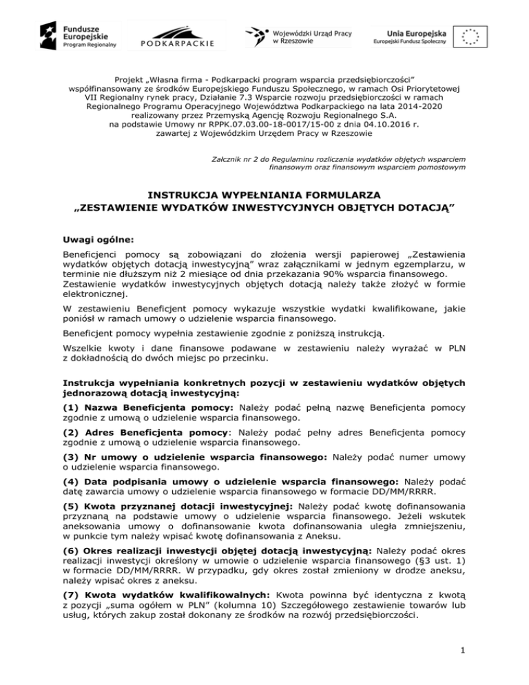 Projekt „Własna firma - Podkarpacki program wsparcia przedsiębiorczości” współfinansowany ze środków Europejskiego Funduszu Społecznego, w ramach Osi Priorytetowej VII Regionalny rynek pracy, Działanie 7.3 Wsparcie rozwoju przedsiębiorczości w ramach Regionalnego Programu Operacyjnego Województwa Podkarpackiego na lata 2014-2020 realizowany przez Przemyską Agencję Rozwoju Regionalnego S.A. na podstawie Umowy nr RPPK.07.03.00-18-0017/15-00 z dnia 04.10.2016 r. zawartej z Wojewódzkim Urzędem Pracy w Rzeszowie Załcznik nr 2 do Regulaminu rozliczania wydatków objętych wsparciem finansowym oraz finansowym wsparciem pomostowym INSTRUKCJA WYPEŁNIANIA FORMULARZA „ZESTAWIENIE WYDATKÓW INWESTYCYJNYCH OBJĘTYCH DOTACJĄ” Uwagi ogólne: Beneficjenci pomocy są zobowiązani do złożenia wersji papierowej „Zestawienia wydatków objętych dotacją inwestycyjną” wraz załącznikami w jednym egzemplarzu, w terminie nie dłuższym niż 2 miesiące od dnia przekazania 90% wsparcia finansowego. Zestawienie wydatków inwestycyjnych objętych dotacją należy także złożyć w formie elektronicznej. W zestawieniu Beneficjent pomocy wykazuje wszystkie wydatki kwalifikowane, jakie poniósł w ramach umowy o udzielenie wsparcia finansowego. Beneficjent pomocy wypełnia zestawienie zgodnie z poniższą instrukcją. Wszelkie kwoty i dane finansowe podawane w zestawieniu należy wyrażać w PLN z dokładnością do dwóch miejsc po przecinku. Instrukcja wypełniania konkretnych pozycji w zestawieniu wydatków objętych jednorazową dotacją inwestycyjną: (1) Nazwa Beneficjenta pomocy: Należy podać pełną nazwę Beneficjenta pomocy zgodnie z umową o udzielenie wsparcia finansowego. (2) Adres Beneficjenta pomocy: Należy podać pełny adres Beneficjenta pomocy zgodnie z umową o udzielenie wsparcia finansowego. (3) Nr umowy o udzielenie wsparcia finansowego: Należy podać numer umowy o udzielenie wsparcia finansowego. (4) Data podpisania umowy o udzielenie wsparcia finansowego: Należy podać datę zawarcia umowy o udzielenie wsparcia finansowego w formacie DD/MM/RRRR. (5) Kwota przyznanej dotacji inwestycyjnej: Należy podać kwotę dofinansowania przyznaną na podstawie umowy o udzielenie wsparcia finansowego. Jeżeli wskutek aneksowania umowy o dofinansowanie kwota dofinansowania uległa zmniejszeniu, w punkcie tym należy wpisać kwotę dofinansowania z Aneksu. (6) Okres realizacji inwestycji objętej dotacją inwestycyjną: Należy podać okres realizacji inwestycji określony w umowie o udzielenie wsparcia finansowego (§3 ust. 1) w formacie DD/MM/RRRR. W przypadku, gdy okres został zmieniony w drodze aneksu, należy wpisać okres z aneksu. (7) Kwota wydatków kwalifikowalnych: Kwota powinna być identyczna z kwotą z pozycji „suma ogółem w PLN” (kolumna 10) Szczegółowego zestawienie towarów lub usług, których zakup został dokonany ze środków na rozwój przedsiębiorczości. 1 (8) Kwota otrzymanych zaliczek: Należy wpisać kwotę zaliczki otrzymanej przez Beneficjenta pomocy zgodnie z §2 ust. 3 pkt 1) umowy o udzielenie wsparcia finansowego. (9) Wnioskowana kwota płatności końcowej: Należy wpisać różnicę, jaka powstała pomiędzy kwotą z pozycji „suma ogółem w PLN” (kolumna 10) Szczegółowego zestawienie towarów lub usług, których zakup został dokonany ze środków na rozwój przedsiębiorczości, a kwotą otrzymanej zaliczki. Załączniki - Jest to pole informacyjne, nie należy go uzupełniać. Załącznik nr 1) Szczegółowe zestawienie towarów lub usług, których zakup został dokonany ze środków na rozwój przedsiębiorczości Beneficjent pomocy wykazuje w zestawieniu WYŁĄCZNIE dokumenty potwierdzające poniesione wydatki kwalifikowane. Należy ująć w zestawieniu wszystkie w całości zapłacone faktury lub inne dokumenty o równoważnej wartości dowodowej, które stanowią udokumentowanie poniesienia wydatków kwalifikowanych przez Beneficjenta pomocy w ramach umowy o udzielenie wsparcia finansowego. W kolejnych kolumnach Szczegółowego zestawienie towarów lub usług należy uzupełnić: Ad. 1 Liczba porządkowa Ad. 2 Należy podać nazwę pozycji z Harmonogramu rzeczowo - finansowego inwestycji (pkt. 4.4 biznes planu), której dotyczy wydatek. Ad. 3 Należy podać nazwę wydatku z dokumentu księgowego (faktury, rachunku, umowy kupna-sprzedaży). W polu należy także podać rzeczywiste parametry techniczne i/lub jakościowych oraz nr seryjny (jeżeli dotyczy) zakupione sprzętu. Przykład: Zapis w biznes planie Laptop-notebook Parametry techniczne lub jakościowe pojemność dysku magnetycznego nie mniej niż 500GB wielkość pamięci RAM: min 4GB minimalna rozdzielczość LCD 1366x768 pikseli Zapis w zestawieniu NOTDEL6410 Notebook Dell Inspiron 3521 i33217U/4GB/500GB/AMD7670 /DVDRW/15.6’’/Win 8 3521i3NBD -----------------Parametry: pojemność dysku twardego 500GB wielkość pamięci RAM: 8GB rozdzielczość LCD 1366x768 pikseli Samochód dostawczy (używany) Parametry techniczne lub jakościowe Ładowność min. 800 kg, pojemność min 1.9 diesel Opel Vivaro nr. VIN ………………. rok pr.2008 ładowność 880kg poj.siln.1995 nr.rej……..……….. -----------------Parametry: Ładowność 900 kg, pojemność 1995 cm3 diesel, Samochód ciężarowy wyposażony w 1 rząd siedzeń oraz część załadunkową Ad. 4 Należy podać numer dokumentu księgowego potwierdzającego zakup (nr faktury, nr rachunku lub umowę kupna-sprzedaży). Ad. 5 Należy podać datę wystawienia dokumentu księgowego (faktury, rachunku, umowy kupna-sprzedaży) o równoważnej wartości dowodowej. 2 Ad. 6 Należy wpisać datę dokonania płatności faktury lub innego dokumentu księgowego o równoważnej wartości dowodowej. W zestawieniu mogą zostać ujęte wyłącznie dokumenty w całości zapłacone. Jeżeli np. faktura była płacona ratami, należy wskazać wszystkie daty płatności za daną fakturę. Dokument, który nie 
