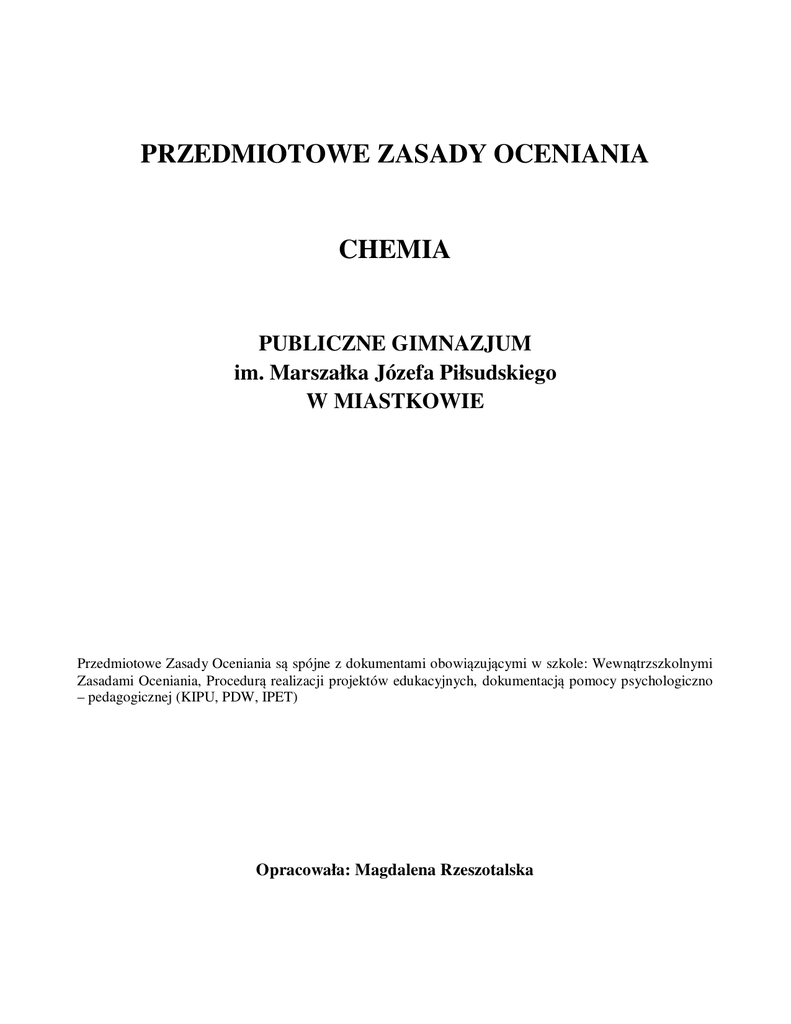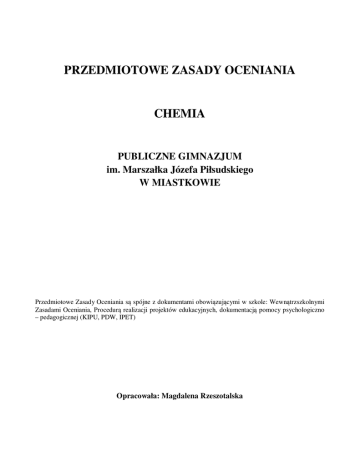 PRZEDMIOTOWE ZASADY OCENIANIA CHEMIA PUBLICZNE GIMNAZJUM im. Marszałka Józefa Piłsudskiego W MIASTKOWIE Przedmiotowe Zasady Oceniania są spójne z dokumentami obowiązującymi w szkole: Wewnątrzszkolnymi Zasadami Oceniania, Procedurą realizacji projektów edukacyjnych, dokumentacją pomocy psychologiczno – pedagogicznej (KIPU, PDW, IPET) Opracowała: Magdalena Rzeszotalska Przedmiotowe Zasady Oceniania 1. Podstawa prawna. 2. Ogólne zasady oceniania. 3. Obszary aktywności ucznia. 4. Formy sprawdzania wiedzy i umiejętności oraz częstotliwość oceniania. 5. Wymagania przedmiotowe. 6. Kryteria oceniania. 7. Sposoby i formy przekazywania informacji zwrotnej: nauczyciel – uczeń, nauczyciel – rodzic. 8. Postanowienia końcowe. Ad. 1 Podstawa prawna Rozporządzenie Ministra Edukacji Narodowej z dnia 30 kwietnia 2007 r. w sprawie warunków i sposobu oceniania, klasyfikowania i promowania uczniów i słuchaczy oraz przeprowadzania sprawdzianów i egzaminów w szkołach publicznych (Dz. U. z dnia 11 maja 2007 r. z późniejszymi zmianami). Rozporządzenie Ministra Edukacji Narodowej z dnia 27.08.2012r. w sprawie podstawy programowej wychowania przedszkolnego oraz kształcenia ogólnego w poszczególnych typach szkół Rozporządzenie Ministra Edukacji Narodowej z dnia 7 października 2009r. w sprawie nadzoru pedagogicznego (Dz. U. z dnia 9 października 2009r.) Ad. 2 Ogólne zasady oceniania • Ocenie podlegają wszystkie wymienione obszary aktywności ucznia. • Każdy uczeń powinien otrzymać w semestrze minimum trzy oceny przy jednej godzinie chemii w tygodniu i pięć ocen przy dwóch godzinach. • Prace klasowe, kartkówki i odpowiedzi są obowiązkowe. • Uczeń ma obowiązek prowadzenia zeszytu przedmiotowego, w którym powinny znajdować się zapisy tematów, notatki, zapisy poleceń prac domowych. Zeszyt powinien być prowadzony systematycznie. W przypadku nieobecności w szkole uczeń ma obowiązek uzupełnić zeszyt. • Uczeń ma prawo raz (klasa pierwsza i druga), dwa razy (klasa trzecia) w semestrze nie przygotować się do zajęć. W takim przypadku zgłasza to nauczycielowi przed rozpoczęciem lekcji. Punkt ten nie dotyczy zapowiedzianych prac kontrolnych i powtórzeń. • Za każde kolejne nieprzygotowanie uczeń otrzymuje ocenę niedostateczną. • Za nieprzygotowanie się do lekcji uznawana jest: niegotowość do odpowiedzi, brak pomocy potrzebnych do lekcji np. zeszyt, podręcznik, przybory kreślarskie i inne wskazane przez nauczyciela. • Na podstawie pisemnej opinii Poradni Psychologiczno-Pedagogicznej lub innej poradni specjalistycznej nauczyciel dostosowuje wymagania edukacyjne dla ucznia, którego opinia ta dotyczy. Ad. 3 Obszary aktywności ucznia na lekcjach chemii • Znajomość: faktów: • występowania pierwiastków i związków chemicznych • składu jakościowego i ilościowego związku chemicznego • właściwości fizycznych i chemicznych substancji • substratów reakcji i surowców przemysłowych • otrzymywania pierwiastków i związków chemicznych • reakcji chemicznych i warunków ich przebiegu 2. pojęć chemicznych , twierdzeń ogólnych i praw, terminologii chemicznej , symboli i wzorów chemicznych, systemów klasyfikacyjnych • Rozumienie: reguł, praw i uogólnień , wyjaśnienie definicji i pojęć , wyjaśnienie reakcji chemicznych, klasyfikacji 1. • Umiejętność: 1. operowania symboliką chemiczną i terminologią 2. odczytywania symboli pierwiastków i wzorów związków chemicznych 3. określania wartościowości pierwiastka w cząsteczce związku chemicznego 4. ustalania wzorów związków chemicznych 5. zapisywania i odczytywania równań reakcji chemicznych 6. prowadzenia obserwacji doświadczeń, planowania doświadczeń, dostrzegania symptomów reakcji chemicznych 7. posługiwania się modelami 8. konstruowania i odczytywania tabel i wykresów 9. wykonywania prostych obliczeń chemicznych 10. abstrahowania i uogólniania 11. konkretyzowania, tj. odczytywania twierdzenia ogólnego, prawa i teorii w konkretach 12. wykrywania związków przyczynowo – skutkowych 13. znajdowania prawidłowości i ustalania cech charakterystycznych 14. wnioskowania na drodze dedukcji i przez analogię 15. przewidywania zjawisk lub reakcji na podstawie budowy substancji 16. formułowania hipotezy 17. dowodzenia i uzasadniania hipotez 18. projektowania nowych doświadczeń 19. tłumaczenia nowych i nietypowych zjawisk 20. wykonywania złożonych obliczeń chemicznych • Prace domowe, prace samodzielne ucznia, w tym prace badawcze • Praca na lekcjach • Praca w grupach • Udział w konkursach • Wykonywanie pomocy dydaktycznych • Doświadczenie uczniowskie indywidualne lub grupowe • Projekt edukacyjny o tematyce przedmiotowej Ad. 4 Formy sprawdzania wiedzy i umiejętności oraz częstotliwość oceniania. • prace pisemne: - prace klasowe (1 godz. lekcyjna) 1-2 razy w semestrze; - kartkówka (10-15 min.) 2-3 razy w semestrze; • prace domowe obowiązkowe i dodatkowe (minimum raz w semestrze); • odpowiedzi ustne - co najmniej jedna w semestrze; • obserwacja ucznia: przygotowanie do lekcji, aktywność na lekcji, praca w grupie; • prace długoterminowe (w uzgodnieniu z uczniem); • zeszyt przedmiotowy lub zeszyt ćwiczeń; • karty pracy (dla uczniów z dostosowanie wymagań edukacyjnych i z orzeczeniem o niepełnosprawności) Ad. 5 Wymagania edukacyjne ( załączniku) Ad. 6 Kryteria oceniani Zasady przeprowadzania prac klasowych i kartkówek: • Praca klasowa jest zapowiedziana tydzień wcześniej i omówiony jest jej zakres. • Prace klasowe są obowiązkowe. • Jeżeli uczeń opuścił klasówkę z przyczyn losowych, powinien ją napisać w terminie nie przekraczającym dwóch tygodni od powrotu do szkoły po uzgodnieniu terminu z nauczycielem. • Poprawa prac klasowych jest dobrowolna i musi odbywać się poza lekcjami chemii, również w ciągu dwóch tygodni od rozdania prac. Uczeń pisze ją tylko 