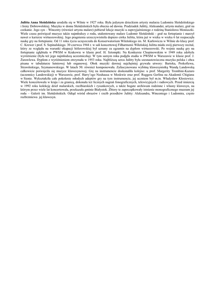 Julitta Anna Sleńdzińska urodziła się w Wilnie w 1927 roku. Była jedynym dzieckiem artysty malarza Ludomira Sleńdzińskiego i Ireny Dobrowolskiej. Muzyka w domu Sleńdzińskich była obecna od dawna. Pradziadek Julitty, Aleksander, artysta malarz, grał na czekanie. Jego syn – Wincenty (również artysta malarz) pobierał lekcje muzyki u zaprzyjaźnionego z rodziną Stanisława Moniuszki. Wiele czasu poświęcał muzyce także najmłodszy z rodu, utalentowany malarz Ludomir Sleńdziński - grał na fortepianie i marzył nawet o karierze wirtuozowskiej. Jego pragnienia urzeczywistniła dopiero córka Julitta, która już w wieku w wieku 6 lat rozpoczęła naukę gry na fortepianie. Od 11 roku życia uczęszczała do Konserwatorium Wileńskiego im. M. Karłowicza w Wilnie do klasy prof. C. Krewer i prof. S. Szpinalskiego. 30 czerwca 1944 r. w sali koncertowej Filharmonii Wileńskiej Julitta miała swój pierwszy recital, który ze względu na warunki okupacji hitlerowskiej był uznany za egzamin na dyplom wirtuozowski. Po wojnie naukę gry na fortepianie zgłębiała w PWSM w Krakowie w klasie prof. H. Sztompki. Na Konkursie Chopinowskim w 1949 roku zdobyła wyróżnienie (była też jego najmłodszą uczestniczką). W tym samym roku podjęła studia w PWSM w Warszawie w klasie prof. J. Żurawlewa. Dyplom z wyróżnieniem otrzymała w 1953 roku. Najbliższą sercu Julitty była szesnastowieczna muzyka polska i obca pisana w tabulaturze lutniowej lub organowej. Obok muzyki dawnej najchętniej grywała utwory: Bartoka, Prokofiewa, Strawińskiego, Szymanowskiego. W latach 50. również komponowała. Zafascynowana wybitną klawesynistką Wandą Landowską całkowicie poświęciła się muzyce klawesynowej. Grę na instrumencie doskonaliła kolejno: u prof. Margerity Trombini-Kazuro (uczennicy Landowskiej) w Warszawie, prof. Harry’ego Neuhausa w Moskwie oraz prof. Ruggera Gerlina na Akademii Chigiana w Sienie. Wykształciła całe pokolenie młodych adeptów gry na tym instrumencie, jej uczniem był m.in. Władysław Kłosiewicz. Wiele koncertowała w kraju i za granicą, dokonała też licznych nagrań fonograficznych, telewizyjnych i radiowych. Przed śmiercią w 1992 roku kolekcję dzieł malarskich, rzeźbiarskich i rysunkowych, a także bogate archiwum rodzinne i własny klawesyn, na którym przez wiele lat koncertowała, przekazała gminie Białystok. Zbiory te zapoczątkowały istnienie monograficznego muzeum jej rodu – Galerii im. Sleńdzińskich. Odtąd wśród obrazów i rzeźb przodków Julitty: Aleksandra, Wincentego i Ludomira, często rozbrzmiewa jej klawesyn.