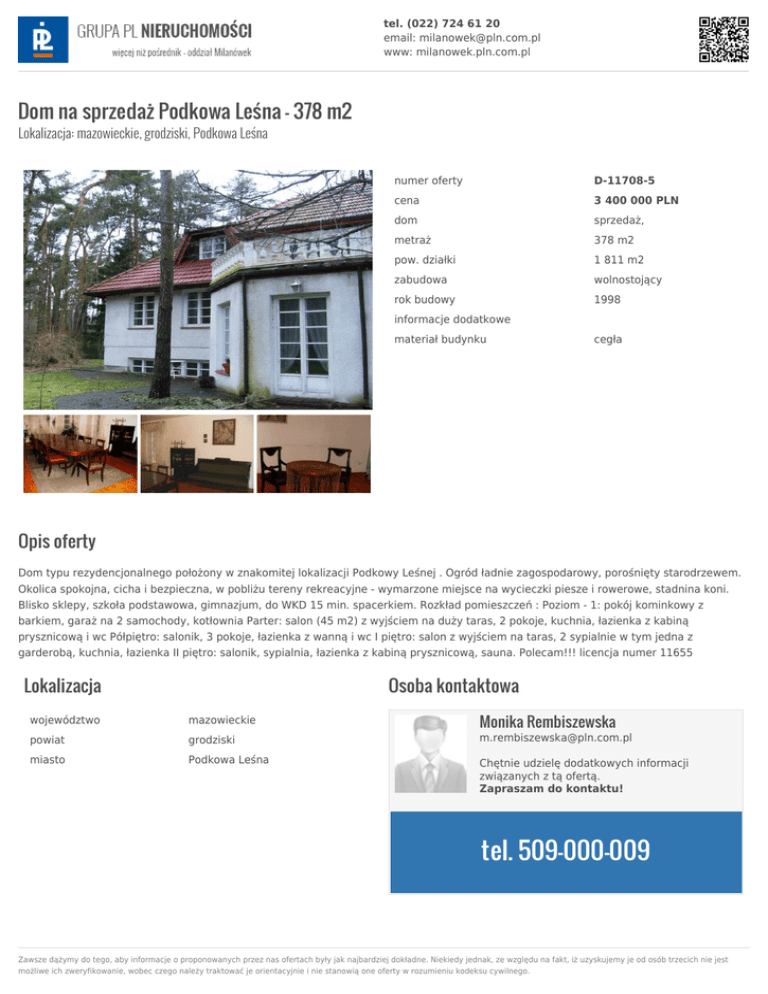 tel. (022) 724 61 20 email: [email protected] www: milanowek.pln.com.pl Dom na sprzedaż Podkowa Leśna - 378 m2 Lokalizacja: mazowieckie, grodziski, Podkowa Leśna numer oferty D-11708-5 cena 3 400 000 PLN dom sprzedaż, metraż 378 m2 pow. działki 1 811 m2 zabudowa wolnostojący rok budowy 1998 informacje dodatkowe materiał budynku cegła Opis oferty Dom typu rezydencjonalnego położony w znakomitej lokalizacji Podkowy Leśnej . Ogród ładnie zagospodarowy, porośnięty starodrzewem. Okolica spokojna, cicha i bezpieczna, w pobliżu tereny rekreacyjne - wymarzone miejsce na wycieczki piesze i rowerowe, stadnina koni. Blisko sklepy, szkoła podstawowa, gimnazjum, do WKD 15 min. spacerkiem. Rozkład pomieszczeń : Poziom - 1: pokój kominkowy z barkiem, garaż na 2 samochody, kotłownia Parter: salon (45 m2) z wyjściem na duży taras, 2 pokoje, kuchnia, łazienka z kabiną prysznicową i wc Półpiętro: salonik, 3 pokoje, łazienka z wanną i wc I piętro: salon z wyjściem na taras, 2 sypialnie w tym jedna z garderobą, kuchnia, łazienka II piętro: salonik, sypialnia, łazienka z kabiną prysznicową, sauna. Polecam!!! licencja numer 11655 Lokalizacja Osoba kontaktowa Monika Rembiszewska województwo mazowieckie powiat grodziski [email protected] miasto Podkowa Leśna Chętnie udzielę dodatkowych informacji związanych z tą ofertą. Zapraszam do kontaktu! tel. 509-000-009 Zawsze dążymy do tego, aby informacje o proponowanych przez nas ofertach były jak najbardziej dokładne. Niekiedy jednak, ze względu na fakt, iż uzyskujemy je od osób trzecich nie jest możliwe ich zweryfikowanie, wobec czego należy traktować je orientacyjnie i nie stanowią one oferty w rozumieniu kodeksu cywilnego.