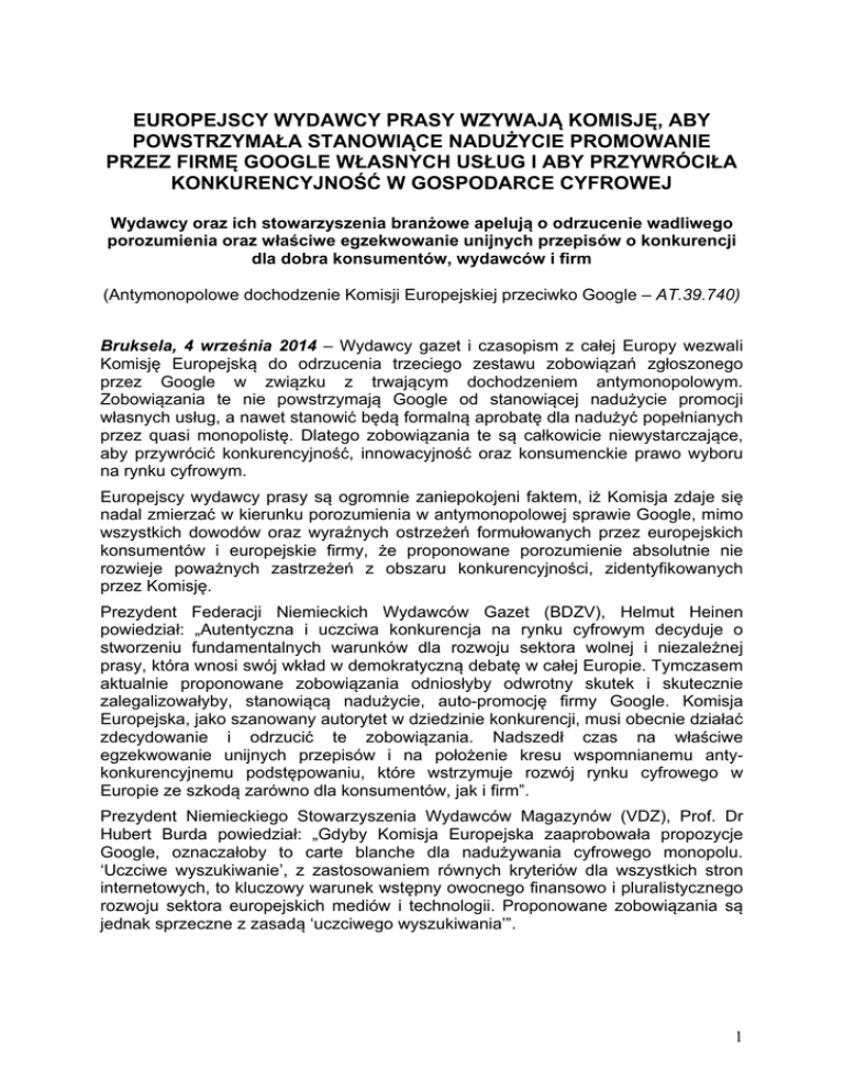 EUROPEJSCY WYDAWCY PRASY WZYWAJĄ KOMISJĘ, ABY POWSTRZYMAŁA STANOWIĄCE NADUŻYCIE PROMOWANIE PRZEZ FIRMĘ GOOGLE WŁASNYCH USŁUG I ABY PRZYWRÓCIŁA KONKURENCYJNOŚĆ W GOSPODARCE CYFROWEJ Wydawcy oraz ich stowarzyszenia branżowe apelują o odrzucenie wadliwego porozumienia oraz właściwe egzekwowanie unijnych przepisów o konkurencji dla dobra konsumentów, wydawców i firm (Antymonopolowe dochodzenie Komisji Europejskiej przeciwko Google – AT.39.740) Bruksela, 4 września 2014 – Wydawcy gazet i czasopism z całej Europy wezwali Komisję Europejską do odrzucenia trzeciego zestawu zobowiązań zgłoszonego przez Google w związku z trwającym dochodzeniem antymonopolowym. Zobowiązania te nie powstrzymają Google od stanowiącej nadużycie promocji własnych usług, a nawet stanowić będą formalną aprobatę dla nadużyć popełnianych przez quasi monopolistę. Dlatego zobowiązania te są całkowicie niewystarczające, aby przywrócić konkurencyjność, innowacyjność oraz konsumenckie prawo wyboru na rynku cyfrowym. Europejscy wydawcy prasy są ogromnie zaniepokojeni faktem, iż Komisja zdaje się nadal zmierzać w kierunku porozumienia w antymonopolowej sprawie Google, mimo wszystkich dowodów oraz wyraźnych ostrzeżeń formułowanych przez europejskich konsumentów i europejskie firmy, że proponowane porozumienie absolutnie nie rozwieje poważnych zastrzeżeń z obszaru konkurencyjności, zidentyfikowanych przez Komisję. Prezydent Federacji Niemieckich Wydawców Gazet (BDZV), Helmut Heinen powiedział: „Autentyczna i uczciwa konkurencja na rynku cyfrowym decyduje o stworzeniu fundamentalnych warunków dla rozwoju sektora wolnej i niezależnej prasy, która wnosi swój wkład w demokratyczną debatę w całej Europie. Tymczasem aktualnie proponowane zobowiązania odniosłyby odwrotny skutek i skutecznie zalegalizowałyby, stanowiącą nadużycie, auto-promocję firmy Google. Komisja Europejska, jako szanowany autorytet w dziedzinie konkurencji, musi obecnie działać zdecydowanie i odrzucić te zobowiązania. Nadszedł czas na właściwe egzekwowanie unijnych przepisów i na położenie kresu wspomnianemu antykonkurencyjnemu podstępowaniu, które wstrzymuje rozwój rynku cyfrowego w Europie ze szkodą zarówno dla konsumentów, jak i firm”. Prezydent Niemieckiego Stowarzyszenia Wydawców Magazynów (VDZ), Prof. Dr Hubert Burda powiedział: „Gdyby Komisja Europejska zaaprobowała propozycje Google, oznaczałoby to carte blanche dla nadużywania cyfrowego monopolu. ‘Uczciwe wyszukiwanie’, z zastosowaniem równych kryteriów dla wszystkich stron internetowych, to kluczowy warunek wstępny owocnego finansowo i pluralistycznego rozwoju sektora europejskich mediów i technologii. Proponowane zobowiązania są jednak sprzeczne z zasadą ‘uczciwego wyszukiwania’”. 1 Występując w imieniu Hiszpańskiego Stowarzyszenia Wydawców Gazet Codziennych (AEDE), Luis Enriquez, Consejero Delegado firmy VOCENTO, powiedział: „To sprawa o kluczowym znaczeniu dla przyszłej ewolucji jednolitego rynku cyfrowego w Europie. Ufam, że Komisja będzie się domagała, aby firma Google zapewniła równe warunki wyszukiwania i pokazywania wyników wszystkim witrynom internetowym, kładąc zarazem kres niewłaściwemu wykorzystywaniu kontentu wydawców”. Podmioty skarżące z hiszpańskiego i niemieckiego sektora wydawców gazet i czasopism, wsparte przez zdecydowaną większość europejskich wydawców prasy, zdecydowanie krytykują brak wiarygodnych rozwiązań zaproponowanych, jak dotąd, przez Google. Stowarzyszenia wydawców, które są podmiotami skarżącymi w tej spawie, zgłosiły formalne uwagi do proponowanego trzeciego zestawu zobowiązań po tym, jak otrzymały od Komisji „pisma poprzedzające odrzucenie skarg”. Wiceprzewodniczący Komisji Europejskiej, Joaquin Almunia oznajmił w maju 2014 roku o swoim zamiarze zakończenia dochodzenia, po podjęciu na jesieni decyzji przez Kolegium Komisarzy. Kolegium Komisarzy posiada uprawnienia do odrzucenia decyzji w spawie zobowiązań i skierowania sprawy do rozpatrzenia przez następne Kolegium Komisarzy, które rozpocznie urzędowanie w listopadzie. Dalsze informacje dotyczące poglądów wydawców na trzeci zestaw proponowanych przez Google zobowiązań znaleźć można w dołączonym do tego komunikatu prasowego załączniku. Aby uzyskać dalsze informacje, prosimy o skontaktowanie się z przedstawicielami koalicji: AEDE: Irene Lanzaco, [email protected], +34 91 425 10 85 BDZV: Helmut Verdenhalven, [email protected], +49 30 7262 98203 VDZ: Christoph Fiedler, [email protected], +49 307 262 98120 EMMA: Max von Abendroth, [email protected]; +32 2 536 06 04 ENPA: Sophie Scrive; [email protected]; +32 2 551 01 97 EPC: Angela Mills-Wade, [email protected], +32 2 231 1299 Doradca prawny: Thomas Höppner, [email protected], +49 30 700 171 176 Nieformalna koalicja składa się z podmiotów z sektora prasowego, które złożyły formalne skargi: Bundesverband Deutscher Zeitungsverleger (BDZV); Verband Deutscher Zeitschriftenverleger (VDZ); Asociación de Editores de Diarios Españoles (AEDE); oraz ich europejskich stowarzyszeń: Europejskie Stowarzyszenie Mediów Magazynowych (EMMA); Europejskie Stowarzyszenie Wydawców Gazet (ENPA); Europejska Rada Wydawców (EPC); oraz Europejskie Stowarzyszenie Wydawców Sieciowych (OPA Europe). Dodatkowi sygnatariusze to: Aikakausmedia / Aikakauslehtien (AKM); Association luxembourgeoise des éditeurs de journaux (ALEJ); Asociación de Revistas de Información (ARI); Asociación de Prensa Profesional y Contenidos Multimedia (ConeQtia); Associacao Portugesa de Imprensa (APIMPRENSA); Ateńskie Stowarzyszenie Wydawców Prasy Codziennej, Czeskie Stowarzyszenie Wydawców (CPA); Cypryjskie Stowarzyszenie Wydawców 2 Gazet i Magazynów (CNMPA); Danske Medier (Duńskie Media); Fagpressen (Norweskie Stowarzyszenie Prasy Specjalistycznej); Federazione Italiana Editori Giornali (FIEG); Polska Izba