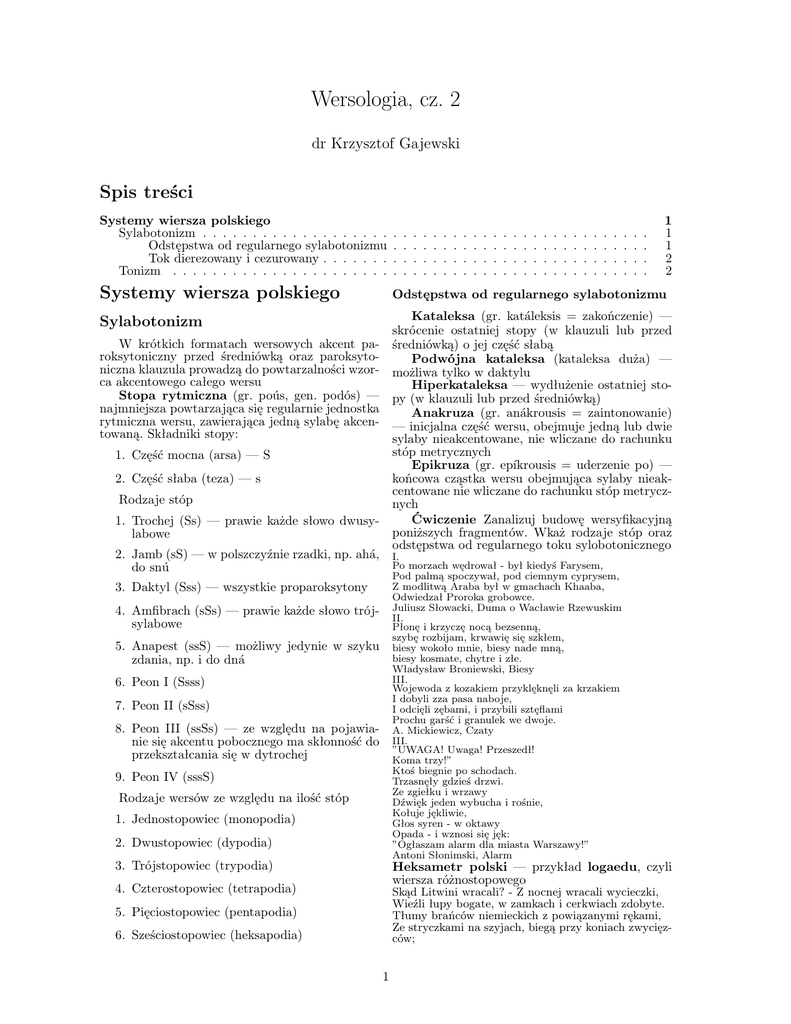 Wersologia, cz. 2 dr Krzysztof Gajewski Spis treści Systemy wiersza polskiego Sylabotonizm . . . . . . . . . . . . . . . . . . . Odstępstwa od regularnego sylabotonizmu Tok dierezowany i cezurowany . . . . . . . Tonizm . . . . . . . . . . . . . . . . . . . . . . . . . . Systemy wiersza polskiego Odstępstwa od regularnego sylabotonizmu Sylabotonizm Kataleksa (gr. katáleksis = zakończenie) — skrócenie ostatniej stopy (w klauzuli lub przed średniówką) o jej część słabą Podwójna kataleksa (kataleksa duża) — możliwa tylko w daktylu Hiperkataleksa — wydłużenie ostatniej stopy (w klauzuli lub przed średniówką) Anakruza (gr. anákrousis = zaintonowanie) — inicjalna część wersu, obejmuje jedną lub dwie sylaby nieakcentowane, nie wliczane do rachunku stóp metrycznych Epikruza (gr. epı́krousis = uderzenie po) — końcowa cząstka wersu obejmująca sylaby nieakcentowane nie wliczane do rachunku stóp metrycznych Ćwiczenie Zanalizuj budowę wersyfikacyjną poniższych fragmentów. Wkaż rodzaje stóp oraz odstępstwa od regularnego toku sylobotonicznego W krótkich formatach wersowych akcent paroksytoniczny przed średniówką oraz paroksytoniczna klauzula prowadzą do powtarzalności wzorca akcentowego całego wersu Stopa rytmiczna (gr. poús, gen. podós) — najmniejsza powtarzająca się regularnie jednostka rytmiczna wersu, zawierająca jedną sylabę akcentowaną. Składniki stopy: 1. Część mocna (arsa) — S 2. Część słaba (teza) — s Rodzaje stóp 1. Trochej (Ss) — prawie każde słowo dwusylabowe 2. Jamb (sS) — w polszczyźnie rzadki, np. ahá, do snú . . . . . . . . . . . . . . . . . . . . . . . . . . . . . . . . . . . . . . . . . . . . . . . . . . . . . . . . . . . . . . . . . . . . . . . . . . . . . . . . . . . . . . . . . . . . . . . . . . . . 1 1 1 2 2 I. Po morzach wędrował - był kiedyś Farysem, Pod palmą spoczywał, pod ciemnym cyprysem, Z modlitwą Araba był w gmachach Khaaba, Odwiedzał Proroka grobowce. Juliusz Słowacki, Duma o Wacławie Rzewuskim II. Płonę i krzyczę nocą bezsenną, szybę rozbijam, krwawię się szkłem, biesy wokoło mnie, biesy nade mną, biesy kosmate, chytre i złe. Władysław Broniewski, Biesy III. Wojewoda z kozakiem przyklęknęli za krzakiem I dobyli zza pasa naboje, I odcięli zębami, i przybili sztęflami Prochu garść i granulek we dwoje. A. Mickiewicz, Czaty III. ”UWAGA! Uwaga! Przeszedł! Koma trzy!” Ktoś biegnie po schodach. Trzasnęły gdzieś drzwi. Ze zgiełku i wrzawy Dźwięk jeden wybucha i rośnie, Kołuje jękliwie, Głos syren - w oktawy Opada - i wznosi się jęk: ”Ogłaszam alarm dla miasta Warszawy!” Antoni Słonimski, Alarm 3. Daktyl (Sss) — wszystkie proparoksytony 4. Amfibrach (sSs) — prawie każde słowo trójsylabowe 5. Anapest (ssS) — możliwy jedynie w szyku zdania, np. i do dná 6. Peon I (Ssss) 7. Peon II (sSss) 8. Peon III (ssSs) — ze względu na pojawianie się akcentu pobocznego ma skłonność do przekształcania się w dytrochej 9. Peon IV (sssS) Rodzaje wersów ze względu na ilość stóp 1. Jednostopowiec (monopodia) 2. Dwustopowiec (dypodia) 3. Trójstopowiec (trypodia) Heksametr polski — przykład logaedu, czyli wiersza różnostopowego 4. Czterostopowiec (tetrapodia) Skąd Litwini wracali? - Z nocnej wracali wycieczki, Wieźli łupy bogate, w zamkach i cerkwiach zdobyte. Tłumy brańców niemieckich z powiązanymi rękami, Ze stryczkami na szyjach, biegą przy koniach zwycięzców; 5. Pięciostopowiec (pentapodia) 6. Sześciostopowiec (heksapodia) 1 Tonizm Poglądają ku Prusom i zalewają się łzami, Poglądają na Kowno - i polecają się Bogu. Za manifest polskiego tonizmu uznawana jest Księga ubogich Jana Kasprowicz wydana w roku 1916. Formy najpopularniejsze to trójzestrojowiec i szeTok dierezowany i cezurowany ściozestrojowiec. Zestrój akcentowy to autosemantyczny ciąg sy- Zestrój ściągnięty składa się z wyrazów, które lab podporządkowany jednemu akcentowi główne- przy powolnej i starannej lekturze mogłyby twomu. Podział na zestroje akcentowe zwykle nie po- rzyć dwa zestroje oto są oczy — słone krywa się z podziałem na stopy. i gorzkie dwie małe bryły — Cezura (łac. caesura = odcięcie) to miejsce roz- Kazimiera Iłłakowiczówna, Preludium jesienne cięcia stopy metrycznej przez granicę zestroju. Ćwiczenie Narysuj schemat wersyfikacyjny poSkłonność do tok cezurowego wykazują szczegól- danych wierszy nie jamb, daktyl, anapest. I. gdy z tego dzbana Diereza (gr. diaíresis = podział) — granica stopy Lubię, Podlewasz kwiaty na grzędzie, metrycznej będąca jednocześnie granicą zestroju Marząca lub głośno mówiąca, akcentowego. Skłonność do toku dierezowego wy- Jaka to rozkosz z nich będzie! Jan Kasprowicz, Księga ubogich kazują trochej, amfibrach, peon III. Ćwiczenie Przedstaw wersyfikację poniższych II. Nie kładźcie go w trumnę drewnianą — fragmentów oraz określ, czy opierają się na toku Nie zaśnie snem sprawiedliwym: Bo trumna jak okręt zbryzgany pianą dierezowanym czy cezurowanym Adam Mickiewicz, Pieśń Wajdeloty Zaskrzypi drzewem płaczliwym. Gdy wichru zerwie się pęd, Niech okręt z Nim odpłynie: Nie leżeć mu w hrabstwie Kent Ani w Londynie. Antoni Słonimski, Na śmierć Conrada III. Byleby w garści karabin, taki, co w boju nie chybi, Co mi tam śniegi Syberii, co mi tam piaski Libii. Co mi tam obóz, więzienie, głód, poniewierka, szkorbut Radość żołnierską ładuję , jak chleb i naboje do torby! W. Broniewski, Co mi tam troski I. tańczą dziś w dancingu indra mister shean ze swoją panią on pół diabła ona anioł w równych frakach i cylindrach M. Pawlikowska-Jasnorzewska, Excentrycy II. Panieneczki, mieszczaneczki podlewają ogródeczki, Posypują żółtym piaskiem drobne, kręte, wąskie steczki, Paniczyki (och, okrzyki!), cynie, fuksje i gwoździki, Rezedowe wonne grządki, pieski, kotki i króliki. Jarosław Iwaszkiewicz, Ogrodnicz