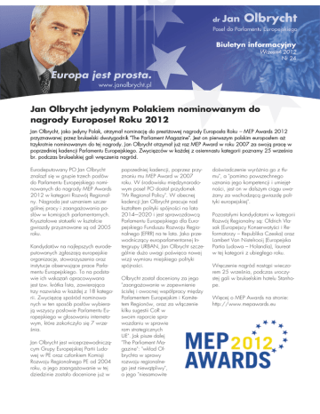 Biuletyn informacyjny Wrzesień 2012 Nr 24 Jan Olbrycht jedynym Polakiem nominowanym do nagrody Europoseł Roku 2012 Jan Olbrycht, jako jedyny Polak, otrzymał nominację do prestiżowej nagrody Europosła Roku – MEP Awards 2012 przyznawanej przez brukselski dwutygodnik "The Parliament Magazine". Jest on pierwszym polskim europosłem aż trzykrotnie nominowanym do tej nagrody. Jan Olbrycht otrzymał już raz MEP Award w roku 2007 za swoją pracę w poprzedniej kadencji Parlamentu Europejskiego. Zwycięzców w każdej z osiemnastu kategorii poznamy 25 września br. podczas brukselskiej gali wręczenia nagród. Eurodeputowany PO Jan Olbrycht znalazł się w grupie trzech posłów do Parlamentu Europejskiego nominowanych do nagrody MEP Awards 2012 w kategorii Rozwój Regionalny. Nagroda jest uznaniem szczególnej pracy i zaangażowania posłów w komisjach parlamentarnych. Kryształowe statuetki w kształcie gwiazdy przyznawane są od 2005 roku. Kandydatów na najlepszych eurodeputowanych zgłaszają europejskie organizacje, stowarzyszenia oraz instytucje obserwujące prace Parlamentu Europejskiego. To na podstawie ich wskazań opracowywana jest tzw. krótka lista, zawierająca trzy nazwiska w każdej z 18 kategorii. Zwycięzcę spośród nominowanych w ten sposób posłów wybierają wszyscy posłowie Parlamentu Europejskiego w głosowaniu internetowym, które zakończyło się 7 września. Jan Olbrycht jest wiceprzewodniczącym Grupy Europejskiej Partii Ludowej w PE oraz członkiem Komisji Rozwoju Regionalnego PE od 2004 roku, a jego zaangażowanie w tej dziedzinie zostało docenione już w poprzedniej kadencji, poprzez przyznaniu mu MEP Award w 2007 roku. W środowisku międzynarodowym poseł PO dostał przydomek "Mr Regional Policy". W obecnej kadencji Jan Olbrycht pracuje nad kształtem polityki spójności na lata 2014-–2020 i jest sprawozdawcą Parlamentu Europejskiego dla Europejskiego Funduszu Rozwoju Regionalnego (EFRR) na te lata. Jako przewodniczący europarlamentarnej Intergrupy URBAN, Jan Olbrycht szczególnie dużo uwagi poświęca nowej wizji wymiaru miejskiego polityki spójności. Olbrycht został doceniony za jego "zaangażowanie w zapewnienie ścisłej i owocnej współpracy między Parlamentem Europejskim i Komitetem Regionów, oraz za włączenie kilku sugestii CoR w swoim raporcie sprawozdaniu w sprawie ram strategicznych UE". Jak pisze dalej "The Parliament Magazine": "wkład Olbrychta w sprawy rozwoju regionalnego jest niewątpliwy", a jego "niesamowite doświadczenie wyróżnia go z tłumu", a "pomimo powszechnego uznania jego kompetencji i umiejętności, jest on w dalszym ciągu uważany za wschodzącą gwiazdę polityki europejskiej". Pozostałymi kandydatami w kategorii Rozwój Regionalny są: Oldrich Vlasak (Europejscy Konserwatyści i Reformatorzy – Republika Czeska) oraz Lambert Van Nistelrooij (Europejska Partia Ludowa – Holandia), laureat w tej kategorii z ubiegłego roku. Wręczenie nagród nastąpi wieczorem 25 września, podczas uroczystej gali w brukselskim hotelu Stanhope. Więcej o MEP Awards na stronie: http://www.mepawards.eu Konferencje, spotkania... W dniach 27–31 sierpnia 2012 poseł Jan Olbrycht, jako wiceprzewodniczący grupy EPL w Parlamencie Europejskim, uczestniczył w kilkuosobowej delegacji prezydium EPL w Stanach Zjednoczonych. Delegacja spotkała się m.in. z szefową MFW Christine Lagarde (na zdjęciu) oraz wiceprezesami Banku Światowego. Rozmawiano o aktualnych i powyborczych relacjach UE z USA. Następnie poseł Olbrycht udał się do Tampy na Florydzie, gdzie wziął udział w krajowej konwencji wyborczej Partii Republikańskiej. W czasie tego pobytu poseł odbył szereg spotkań z republikańskimi politykami. 3 września 2012 Jan Olbrycht wziął udział w VI Światowym Forum Miast organizowanym w Neapolu przez agendę ONZ – Program Narodów Zjednoczonych ds. Osiedli Ludzkich, gdzie uczestniczył w panelu na temat mieszkalnictwa, współorganizowanym przez Międzynarodowy Związek Lokatorów, oraz w specjalnej sesji tzw. Światowej Kampanii Miejskiej dotyczącej „Manifestu dla Miast”. Rozmawiano m.in. o wartościach EPL, a także na temat wzrostu gospodarczego oraz ochrony społecznej gospodarki rynkowej. 7–8 września 2012 Jan Olbrycht, jako wiceprzewodniczący Grupy EPL w PE zajmujący się z ramienia Grupy dialogiem międzykulturowym i międzywyznaniowym, prowadził XV Dialog Grupy EPL z Kościołami i Instytucjami Religijnymi „Europejski kryzys gospodarczy i jego konsekwencje”. Podczas spotkania omówiono praktyki związane z wdrażaniem artykułu 17 Traktatu Lizbońskiego określającego stosunek Unii do kościołów, stowarzyszeń i wspólnot wyznaniowych, a także przeprowadzono dyskusję o społecznych konsekwencjach kryzysu gospodarczego. 14 września Jan Olbrycht wziął udział w międzynarodowej konferencji „Rola Kościoła katolickiego w procesie integracji europejskiej”, która odbyła się w Krakowie. Poseł był jedną z osób otwierających konferencję. Moderował także dyskusję nt. przyszłeW dniach 6–7 września 2012 poseł Olbrycht wziął go kształtu politycznego Unii Europejskiej. udział w spotkaniu zarządu grupy EPL we Florencji. Europa jest prosta. Biuletyn Informacyjny. Redaguje zespół. Wydawca: dr Jan Olbrycht, Poseł do Parlamentu Europejskiego, ul. 3 Maja 17/3, PL–40–097 Katowice, tel./fax: +48 (32) 354 12 07, e–mail: [email protected]. Wszelkie prawa zastrzeżone. Przedruk wraz z podaniem źródła. Bieżące informacje i rozszerzone wersje artykułów na stronie www.janolbrycht.pl. Numer zamknięto 18 września 2012