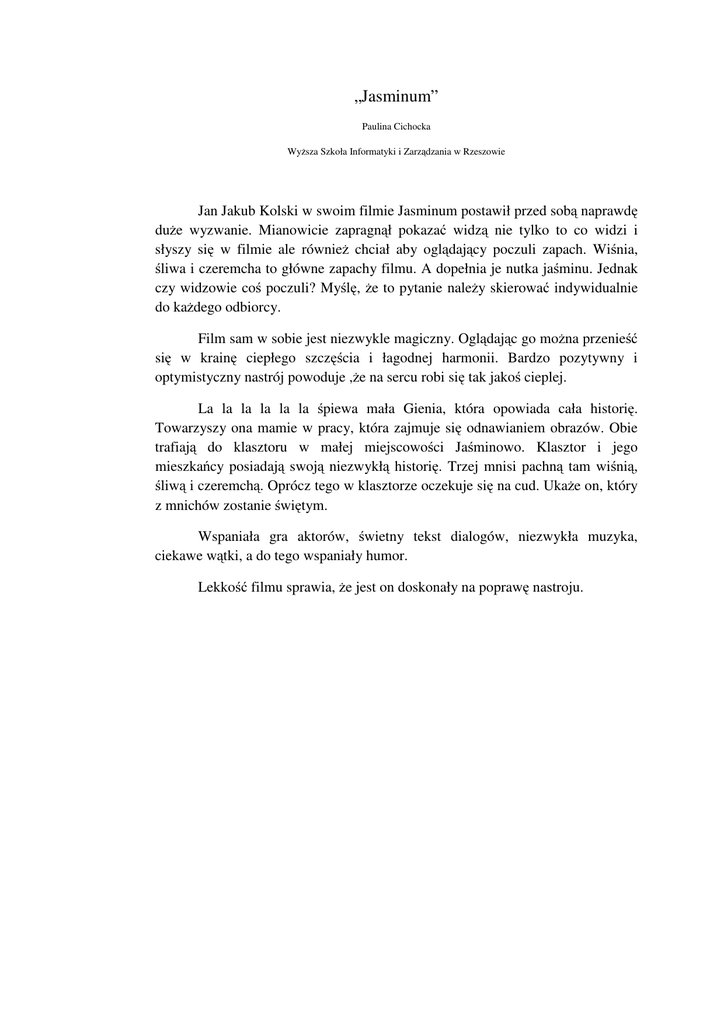 „Jasminum” Paulina Cichocka Wyższa Szkoła Informatyki i Zarządzania w Rzeszowie Jan Jakub Kolski w swoim filmie Jasminum postawił przed sobą naprawdę duże wyzwanie. Mianowicie zapragnął pokazać widzą nie tylko to co widzi i słyszy się w filmie ale również chciał aby oglądający poczuli zapach. Wiśnia, śliwa i czeremcha to główne zapachy filmu. A dopełnia je nutka jaśminu. Jednak czy widzowie coś poczuli? Myślę, że to pytanie należy skierować indywidualnie do każdego odbiorcy. Film sam w sobie jest niezwykle magiczny. Oglądając go można przenieść się w krainę ciepłego szczęścia i łagodnej harmonii. Bardzo pozytywny i optymistyczny nastrój powoduje ,że na sercu robi się tak jakoś cieplej. La la la la la la śpiewa mała Gienia, która opowiada cała historię. Towarzyszy ona mamie w pracy, która zajmuje się odnawianiem obrazów. Obie trafiają do klasztoru w małej miejscowości Jaśminowo. Klasztor i jego mieszkańcy posiadają swoją niezwykłą historię. Trzej mnisi pachną tam wiśnią, śliwą i czeremchą. Oprócz tego w klasztorze oczekuje się na cud. Ukaże on, który z mnichów zostanie świętym. Wspaniała gra aktorów, świetny tekst dialogów, niezwykła muzyka, ciekawe wątki, a do tego wspaniały humor. Lekkość filmu sprawia, że jest on doskonały na poprawę nastroju.