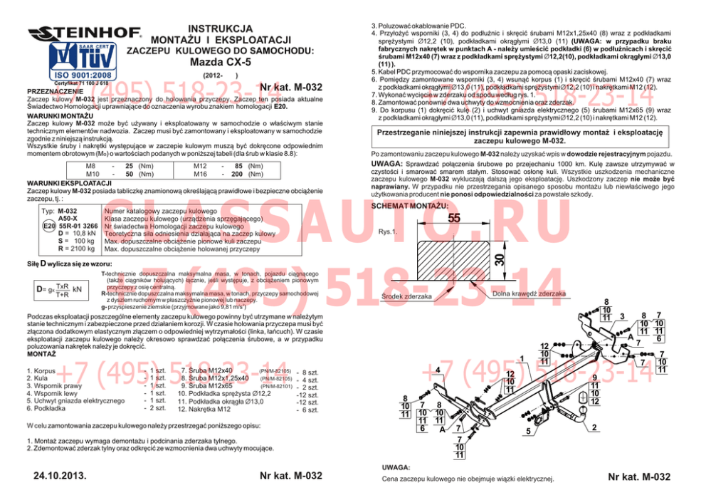 INSTRUKCJA MONTA¯U I EKSPLOATACJI ZACZEPU KULOWEGO DO SAMOCHODU: Mazda CX-5 (2012- ® ) +7 (495) 518-23-14 Certyfikat 71 100 J 618 Nr kat. M-032 PRZEZNACZENIE Zaczep kulowy M-032 jest przeznaczony do holowania przyczepy. Zaczep ten posiada aktualne Œwiadectwo Homologacji uprawniaj¹ce do oznaczenia wyrobu znakiem homologacji E20. WARUNKI MONTA¯U Zaczep kulowy M-032 mo¿e byæ u¿ywany i eksploatowany w samochodzie o w³aœciwym stanie technicznym elementów nadwozia. Zaczep musi byæ zamontowany i eksploatowany w samochodzie zgodnie z niniejsz¹ instrukcj¹. Wszystkie œruby i nakrêtki wystêpuj¹ce w zaczepie kulowym musz¹ byæ dokrêcone odpowiednim momentem obrotowym (Mo) o wartoœciach podanych w poni¿szej tabeli (dla œrub w klasie 8.8): M8 25 (Nm) M12 85 (Nm) M10 50 (Nm) M16 - 200 (Nm) WARUNKI EKSPLOATACJI Zaczep kulowy M-032 posiada tabliczkê znamionow¹ okreœlaj¹c¹ prawid³owe i bezpieczne obci¹¿enie zaczepu, tj. : +7 (495) 518-23-14 Przestrzeganie niniejszej instrukcji zapewnia prawid³owy monta¿ i eksploatacjê zaczepu kulowego M-032. Po zamontowaniu zaczepu kulowego M-032 nale¿y uzyskaæ wpis w dowodzie rejestracyjnym pojazdu. UWAGA: Sprawdzaæ po³¹czenia œrubowe po przejechaniu 1000 km. Kulê zawsze utrzymywaæ w czystoœci i smarowaæ smarem sta³ym. Stosowaæ os³onê kuli. Wszystkie uszkodzenia mechaniczne zaczepu kulowego M-032 wykluczaj¹ dalsz¹ jego eksploatacjê. Uszkodzony zaczep nie mo¿e byæ naprawiany. W przypadku nie przestrzegania opisanego sposobu monta¿u lub niew³aœciwego jego u¿ytkowania producent nie ponosi odpowiedzialnoœci za powsta³e szkody. CLASSAUTO.RU SCHEMAT MONTA¯U: Numer katalogowy zaczepu kulowego Klasa zaczepu kulowego (urz¹dzenia sprzêgaj¹cego) Nr œwiadectwa Homologacji zaczepu kulowego Teoretyczna si³a odniesienia dzia³aj¹ca na zaczep kulowy Max. dopuszczalne obci¹¿enie pionowe kuli zaczepu Max. dopuszczalne obci¹¿enie holowanej przyczepy 55 Rys.1. 30 Typ: M-032 A50-X E20 55R-01 3266 D = 10,8 kN S = 100 kg R = 2100 kg 3. Poluzowaæ okablowanie PDC. 4. Przy³o¿yæ wsporniki (3, 4) do pod³u¿nic i skrêciæ œrubami M12x1,25x40 (8) wraz z podk³adkami sprê¿ystymi Ø12,2 (10), podk³adkami okr¹g³ymi Ø13,0 (11) (UWAGA: w przypadku braku fabrycznych nakrêtek w punktach A - nale¿y umieœciæ podk³adki (6) w pod³u¿nicach i skrêciæ œrubami M12x40 (7) wraz z podk³adkami sprê¿ystymi Ø12,2(10), podk³adkami okr¹g³ymi Ø13,0 (11) ). 5. Kabel PDC przymocowaæ do wspornika zaczepu za pomoc¹ opaski zaciskowej. 6. Pomiêdzy zamontowane wsporniki (3, 4) wsun¹æ korpus (1) i skrêciæ œrubami M12x40 (7) wraz z podk³adkami okr¹g³ymi Ø13,0 (11), podk³adkami sprê¿ystymi Ø12,2 (10) i nakrêtkami M12 (12). 7. Wykonaæ wyciêcie w zderzaku od spodu wed³ug rys. 1. 8. Zamontowaæ ponownie dwa uchwyty do wzmocnienia oraz zderzak. 9. Do korpusu (1) dokrêciæ kulê (2) i uchwyt gniazda elektrycznego (5) œrubami M12x65 (9) wraz z podk³adkami okr¹g³ymi Ø13,0 (11), podk³adkami sprê¿ystymi Ø12,2 (10) i nakrêtkami M12 (12). +7 (495) 518-23-14 Si³ê D wylicza siê ze wzoru: D= gx TxR kN T+R T-technicznie dopuszczalna maksymalna masa, w tonach, pojazdu ci¹gn¹cego (tak¿e ci¹gników holuj¹cych) ³¹cznie, jeœli wystêpuje, z obci¹¿eniem pionowym przyczepy z osiê centraln¹. R-technicznie dopuszczalna maksymalna masa, w tonach, przyczepy samochodowej z dyszlem ruchomym w p³aszczyŸnie pionowej lub naczepy. g- przyspieszenie ziemskie (przyjmowane jako 9,81 m/s2) Podczas eksploatacji poszczególne elementy zaczepu kulowego powinny byæ utrzymane w nale¿ytym stanie technicznym i zabezpieczone przed dzia³aniem korozji. W czasie holowania przyczepa musi byæ z³¹czona dodatkowym elastycznym z³¹czem o odpowiedniej wytrzyma³oœci (linka, ³añcuch). W czasie eksploatacji zaczepu kulowego nale¿y okresowo sprawdzaæ po³¹czenia œrubowe, a w przypadku poluzowania nakrêtek nale¿y je dokrêciæ. MONTA¯ +7 (495) 518-23-14 1. Korpus 2. Kula 3. Wspornik prawy 4. Wspornik lewy 5. Uchwyt gniazda elektrycznego 6. Podk³adka - 1 szt. 1 szt. 1 szt. 1 szt. 1 szt. 2 szt. 7. Œruba M12x40 (PN/M-82105) 8. Œruba M12x1,25x40 (PN/M-82105) 9. Œruba M12x65 (PN/M-82101) 10. Podk³adka sprê¿ysta Ø12,2 11. Podk³adka okr¹g³a Ø13,0 12. Nakrêtka M12 - 8 szt. - 4 szt. - 2 szt. -12 szt. -12 szt. - 6 szt. Dolna krawêdŸ zderzaka Œrodek zderzaka 8 10 11 12 10 11 3 8 7 10 10 11 11 A 6 7 7 10 7 11 +7 (495) 518-23-14 1 4 8 10 11 W celu zamontowania zaczepu kulowego nale¿y przestrzegaæ poni¿szego opisu: 1. Monta¿ zaczepu wymaga demonta¿u i podcinania zderzaka tylnego. 2. Zdemontowaæ zderzak tylny oraz odkrêciæ ze wzmocnienia dwa uchwyty mocuj¹ce. 7 8 10 10 11 11 6 A 12 10 11 7 7 10 11 9 11 10 12 5 2 UWAGA: 24.10.2013. Nr kat. M-032 Cena zaczepu kulowego nie obejmuje wi¹zki elektrycznej. Nr kat. M-032 TOW BAR FOR Mazda CX-5 (2012- ® ) FITTING AND OPERATION MANUAL +7 (495) 518-23-14 Certificate 71 100 J 618 Cat. No.M-032 DESTINATION Tow bar M-032 is designed for towing a trailer. This ball hook has a current certification of approval authorizing the product with E20 certification sign. FITTING CONDITIONS Tow bar M-032 can be used and operated in a car with proper technical conditions of body elements. Those parts cannot be mechanically damaged . The ball hook has to be installed and operated in a car according to this instruction . All bolts and nuts in ball hook have to be screwed down with proper torque (Mo) . Torque values are given below : M8 M10 - 25 (Nm) 50 (Nm) M12 M16 - 85 (Nm) 200 (Nm) 3. Loosen the wiring PDC. 4. Insert the supports (3, 4) into the stringers and screw on using bolts M12x1,25x40 (8) with spring washers Ø12,2 (10), round washers Ø13,0 (11) ( ATTENTION: in the absene of the factory nuts at points A – insert the washers (6) into the stringers and screw on using bolts M12x40 (7), withspring washers Ø12,2(10) and round washers Ø13,0 (11) ). 5. PDC cable attached to the hitch br