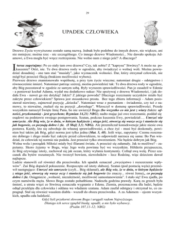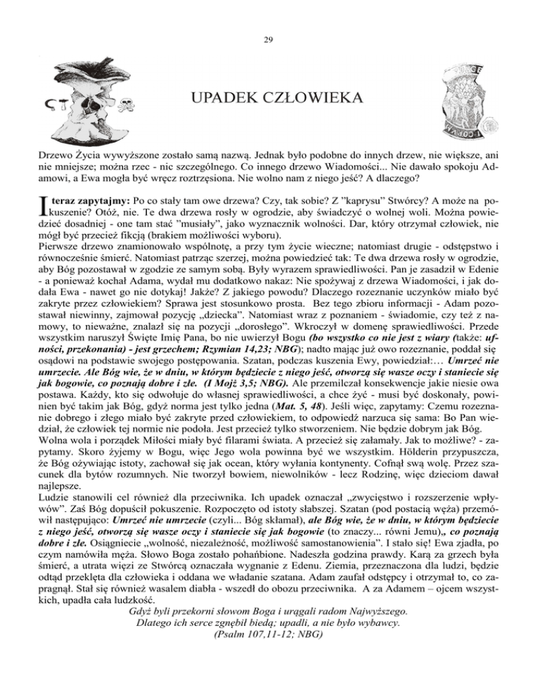29 Drzewo Życia wywyższone zostało samą nazwą. Jednak było podobne do innych drzew, nie większe, ani nie mniejsze; można rzec - nic szczególnego. Co innego drzewo Wiadomości... Nie dawało spokoju Adamowi, a Ewa mogła być wręcz roztrzęsiona. Nie wolno nam z niego jeść? A dlaczego? I teraz zapytajmy: Po co stały tam owe drzewa? Czy, tak sobie? Z ”kaprysu” Stwórcy? A może na pokuszenie? Otóż, nie. Te dwa drzewa rosły w ogrodzie, aby świadczyć o wolnej woli. Można powiedzieć dosadniej - one tam stać ”musiały”, jako wyznacznik wolności. Dar, który otrzymał człowiek, nie mógł być przecież fikcją (brakiem możliwości wyboru). Pierwsze drzewo znamionowało wspólnotę, a przy tym życie wieczne; natomiast drugie - odstępstwo i równocześnie śmierć. Natomiast patrząc szerzej, można powiedzieć tak: Te dwa drzewa rosły w ogrodzie, aby Bóg pozostawał w zgodzie ze samym sobą. Były wyrazem sprawiedliwości. Pan je zasadził w Edenie - a ponieważ kochał Adama, wydał mu dodatkowo nakaz: Nie spożywaj z drzewa Wiadomości, i jak dodała Ewa - nawet go nie dotykaj! Jakże? Z jakiego powodu? Dlaczego rozeznanie uczynków miało być zakryte przez człowiekiem? Sprawa jest stosunkowo prosta. Bez tego zbioru informacji - Adam pozostawał niewinny, zajmował pozycję „dziecka”. Natomiast wraz z poznaniem - świadomie, czy też z namowy, to nieważne, znalazł się na pozycji „dorosłego”. Wkroczył w domenę sprawiedliwości. Przede wszystkim naruszył Święte Imię Pana, bo nie uwierzył Bogu (bo wszystko co nie jest z wiary (także: ufności, przekonania) - jest grzechem; Rzymian 14,23; NBG); nadto mając już owo rozeznanie, poddał się osądowi na podstawie swojego postępowania. Szatan, podczas kuszenia Ewy, powiedział:… Umrzeć nie umrzecie. Ale Bóg wie, że w dniu, w którym będziecie z niego jeść, otworzą się wasze oczy i staniecie się jak bogowie, co poznają dobre i złe. (I Mojż 3,5; NBG). Ale przemilczał konsekwencje jakie niesie owa postawa. Każdy, kto się odwołuje do własnej sprawiedliwości, a chce żyć - musi być doskonały, powinien być takim jak Bóg, gdyż norma jest tylko jedna (Mat. 5, 48). Jeśli więc, zapytamy: Czemu rozeznanie dobrego i złego miało być zakryte przed człowiekiem, to odpowiedź narzuca się sama: Bo Pan wiedział, że człowiek tej normie nie podoła. Jest przecież tylko stworzeniem. Nie będzie dobrym jak Bóg. Wolna wola i porządek Miłości miały być filarami świata. A przecież się załamały. Jak to możliwe? - zapytamy. Skoro żyjemy w Bogu, więc Jego wola powinna być we wszystkim. Hölderin przypuszcza, że Bóg ożywiając istoty, zachował się jak ocean, który wyłania kontynenty. Cofnął swą wolę. Przez szacunek dla bytów rozumnych. Nie tworzył bowiem, niewolników - lecz Rodzinę, więc dzieciom dawał najlepsze. Ludzie stanowili cel również dla przeciwnika. Ich upadek oznaczał „zwycięstwo i rozszerzenie wpływów”. Zaś Bóg dopuścił pokuszenie. Rozpoczęto od istoty słabszej. Szatan (pod postacią węża) przemówił następująco: Umrzeć nie umrzecie (czyli... Bóg skłamał), ale Bóg wie, że w dniu, w którym będziecie z niego jeść, otworzą się wasze oczy i staniecie się jak bogowie (to znaczy... równi Jemu),, co poznają dobre i złe. Osiągniecie „wolność, niezależność, możliwość samostanowienia”. I stało się! Ewa zjadła, po czym namówiła męża. Słowo Boga zostało pohańbione. Nadeszła godzina prawdy. Karą za grzech była śmierć, a utrata więzi ze Stwórcą oznaczała wygnanie z Edenu. Ziemia, przeznaczona dla ludzi, będzie odtąd przeklęta dla człowieka i oddana we władanie szatana. Adam zaufał odstępcy i otrzymał to, co zapragnął. Stał się również wasalem diabła - wszedł do obozu przeciwnika. A za Adamem – ojcem wszystkich, upadła cała ludzkość. Gdyż byli przekorni słowom Boga i urągali radom Najwyższego. Dlatego ich serce zgnębił biedą; upadli, a nie było wybawcy. (Psalm 107,11-12; NBG)