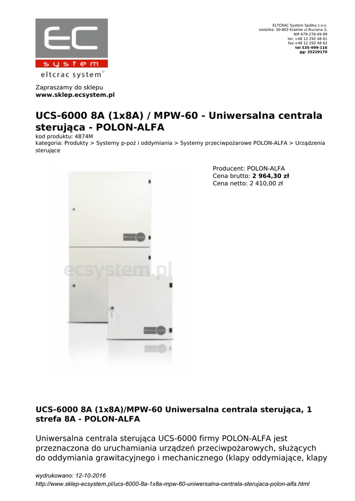 ELTCRAC System Spółka z o.o. siedziba: 30-803 Kraków ul.Ruciana 3, NIP 679-278-49-99 tel: +48 12 292 48 61 fax:+48 12 292 48 62 tel 535-999-116 gg: 35229170 Zapraszamy do sklepu www.sklep.ecsystem.pl UCS-6000 8A (1x8A) / MPW-60 - Uniwersalna centrala sterująca - POLON-ALFA kod produktu: 4874M kategoria: Produkty > Systemy p-poż i oddymiania > Systemy przeciwpożarowe POLON-ALFA > Urządzenia sterujące Producent: POLON-ALFA Cena brutto: 2 964,30 zł Cena netto: 2 410,00 zł UCS-6000 8A (1x8A)/MPW-60 Uniwersalna centrala sterująca, 1 strefa 8A - POLON-ALFA Uniwersalna centrala sterująca UCS-6000 firmy POLON-ALFA jest przeznaczona do uruchamiania urządzeń przeciwpożarowych, służących do oddymiania grawitacyjnego i mechanicznego (klapy oddymiające, klapy wydrukowano: 12-10-2016 http://www.sklep-ecsystem.pl/ucs-6000-8a-1x8a-mpw-60-uniwersalna-centrala-sterujaca-polon-alfa.html odcinające) i umożliwia: - wykrywanie pożaru (zadymienia); - uruchamianie automatyczne lub ręczne urządzeń przeciwpożarowych, instalowanych w systemach oddymiania; - sygnalizowanie akustyczne i optyczne stanów pracy urządzeń (alarm, uszkodzenie); - automatyczną kontrolę zadziałania urządzeń przeciwpożarowych i wykonawczych (siłowniki, elektromagnesy, wentylatory itp.) systemu oddymiania; - automatyczną kontrolę własnych układów i obwodów centrali; - przekazywanie podstawowych informacji do systemów nadrzędnych (np. systemu POLON 4000, systemu IGNIS 1000 lub innych) o alarmie, uszkodzeniu, stanie urządzeń przeciwpożarowych i wykonawczych. Centrala może pracować indywidualnie jako jedno- lub wielostrefowy uniwersalny sterownik oddymiania lub w adresowalnych liniach / pętlach dozorowych central sygnalizacji pożarowej systemu POLON 4000Wyposażenie centrali. Centrala UCS-6000 firmy POLON-ALFA może być wyposażona w: Moduł MGS-60 (x1): - nadzorowaną linię przyjmującą sygnał alarmu z zewnętrznej centrali sygnalizacji pożarowej, - linię zasilającą czujnik deszczu i/lub wiatru, linię przyjmującą sygnał z czujnika deszczu i/lub wiatru, przekaźnik alarmu PKA nadzorowany (ciągłość toru), - przekaźnik uszkodzenia PKU Moduł MGL-60 (x8): - konwencjonalną linię dozorową (czujki szere-gu 40), - konwencjonalną linię ręcznych przycisków oddymiania (przyciski szeregu PO-6X), - wyjście główne nadzorowane uniwersalnego zastosowania do sterowania i zasilania urządzeń przeciwpożarowych (siłowniki i napędy klap przeciwpożarowych, - elektromagnesy oddzieleń przeciwpożaro-wych, itp.), - linie kontrolne stanu przełączników krańco-wych urządzeń przeciwpożarowych sterowanych i zasilanych przez wyjście główne, - linie przyjmujące sygnały z przycisków przewietrzających (OTWÓRZ, ZAMKNIJ); Moduł MPW-60 (x4): - 2 przekaźniki programowalne PK1 i PK2 wyso-konapięciowe (5 A / 230 V), - 2 nadzorowane linie kontrolne progra-mowalne LK1 i LK2 (24 V); Moduł MPD-60 (x1): - 2 nadzorowane przekaźniki programowalne PK1 i PK2 (1 A / 24 V), - 2 nadzorowane linie kontrolne programo-walne LK1 i LK2 (24 V); wydrukowano: 12-10-2016 http://www.sklep-ecsystem.pl/ucs-6000-8a-1x8a-mpw-60-uniwersalna-centrala-sterujaca-polon-alfa.html Moduł MKA-60 (x1): - linię komunikacyjną do systemu POLON 4000 (adresowalna linia dozorowa); Moduł MZU-60 (x4): - przekaźnik uszkodzenia zasilania PKUZ (1 A / 24 V), - nadzorowane wyjście do zasilania urządzeń zewnętrznych (0,5 A / 24 V). Charakterystyka produktu Głównym zadaniem centrali UCS-6000, poza wykrywaniem zagrożenia pożarowego, jest sterowanie i zasilanie urządzeń przeciwpożarowych wykonawczych w postaci wszelkiego rodzaju klap i okien przeciwpożarowych (wyposażonych w napędy lub siłowniki elektryczne), oddzieleń przeciwpo-żarowych (elektromagnesy) itp. Do sterowania i zasilania tych urządzeń jest przeznaczone dedykowane wyjście przekaźnika głównego umieszczonego na module MGL-60. Wyjście przekaźnika głównego jest wyjściem uniwersalnym, może być zaprogramowane w trzech trybach pracy - z odpowiednimi parametrami czasowymi. Dodatkowo można zaprogramować kontrolę ciągłości zasilania oraz kontrolę stanu przełączników krańcowych urządzeń przeciwpożarowych sterowanych i zasilanych za pomocą wyjścia głównego. Ze względu na różnorodność zasilania i sterowania siłowników i napędów elektrycznych urządzeń przeciwpoża-rowych wprowadzono - oprócz trybów pracy wyjścia - sterowanie siłowników dwukierunkowych, dwu-przewo-dowe lub trzy-przewodowe. Do detekcji pożaru służy konwencjonalna linia dozorowa z czujkami szeregu 40. Linia ma możliwość zaprogramo-wania wariantu alarmowania ze wstępnym kasowaniem (60 s) w celu eliminacji przypadkowych zadziałań. W części sterowania oddymianiem, uruchomienie urządzeń przeciwpożarowych możliwe jest w wyniku: - zadziałania czujki na konwencjonalnej linii dozorowej, - zadziałania ręcznego przycisku oddymiania PO-6x, - pojawienia się sygnału alarmu z zewnętrznej centrali sygnalizacji pożarowej, np. IGNIS 1000, - otrzymania rozkazu z centrali systemu POLON 4000. W przypadku otrzymania sygnału inicjującego, następuje uruchomienie procedury oddymiania zgodnie z zaprogra-mowanym scenariuszem pożarowym danego obiektu. Blokowane są przyciski przewietrzania, ignorowane są sygnały z czujnika deszczu i/lub wiatru. W stanie dozorowania jest możliwe zrealizowanie dziennego przewietrzania – wentylacji za pomocą okien lub klap wentylacyjnych. Moduły centrali UCS 6000 są wyposażone w szereg uniwersalnych wejść i wyjść do podłączania zewnętrznych instalacji systemu oddymiania. Do programowania pracy central UCS 6000 stosowana jest aplikacja do konfiguracji UCS wydrukowano: 12-10-2016 http://www.sklep-ecsystem.pl/ucs-6000-8a-1x8a-mpw-60-uniwersalna-centrala-sterujaca-polon-alfa.html (UCSKonfigurator). Centralę podłącza się do komputera przy użyciu złącza USB. Budowa i podstawowe wersje centrali Centrala UCS-