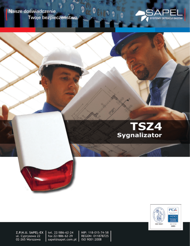 TSZ4 Sygnalizator Opis ogólny Sygnalizator TSZ-4/4D przeznaczony jest do wytwarzania sygnału akustycznego i optycznego w systemach sygnalizacji włamania, napadu oraz sygnalizacji przeciwpoarowej. Zródłem sygnału akustycznego jest przetwornik piezoelektryczny generujacy modulowany dzwiek o wysokiej głosnosci. Zródłem sygnału optycznego w sygnalizatorze TSZ-4 jest pulsujaca żarówka, a w wersji TSZ-4D diody LED o dużej luminancji. Sygnalizator może pracować samodzielnie oraz współpracować z centralami alarmowymi. Można go instalować zarówno wewnątrz, jak i na zewnątrz pomieszczeń. Elektronika sygnalizatora, wykonana w technologii montażu powierzchniowego (SMT) oraz zabezpieczona dodatkową pokrywą przed udarami mechanicznymi i niekorzystnym wpływem czynników atmosferycznych, gwarantuje bardzo wysoką niezawodność urządzenia. Obudowa, wykonana z wysokoudarowego tworzywa sztucznego (poliweglan/ABS), zapewnia bardzo wysoką odporność sygnalizatora na silne udary mechaniczne i działanie niekorzystnych czynników atmosferycznych. Jej konstrukcja oraz wykonanie z najwyższej jakości materiałów, gwarantuje estetyczny wygląd sygnalizatora w ciągu długoletniego okresu eksploatacji oraz odpowiedni poziom jego zabezpieczenia antysabotażowego. Stopień ochrony antysabotażowej zwiększa mikroprzełącznik wykrywający fakt zdjęcia pokrywy obudowy lub oderwanie sygnalizatora od podłoża. Dane techniczne Napięcie zasilania Max. pobór prądu - dla sygnalizacji akustycznej - sygnalizacji optycznej: arówka/ diody LED Średni pobór pradu dla sygnalizatora: TSZ-4 /TSZ-4D Natężenie dźwięku - z odległosci 1 m (wg PN) - w bezposrednim otoczeniu sygnalizatora Temperatura pracy Wymiary Masa Schemat podłączenia 12VDC ok. 60mA ok. 410/105mA ok. 310/130mA ok. 105 dB ok. 116 dB -30° do +60°C 310x183x75 mm 0,75 kg