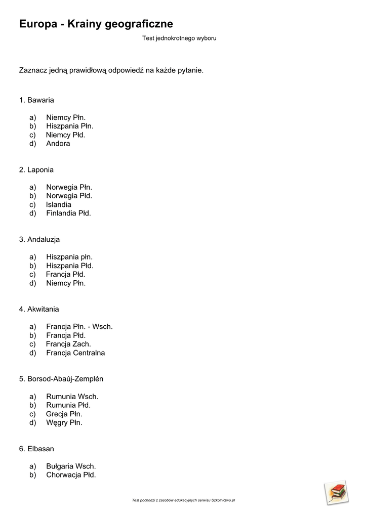 Europa - Krainy geograficzne Test jednokrotnego wyboru Zaznacz jedną prawidłową odpowiedź na każde pytanie. 1. Bawaria a) b) c) d) Niemcy Płn. Hiszpania Płn. Niemcy Płd. Andora 2. Laponia a) b) c) d) Norwegia Płn. Norwegia Płd. Islandia Finlandia Płd. 3. Andaluzja a) b) c) d) Hiszpania płn. Hiszpania Płd. Francja Płd. Niemcy Płn. 4. Akwitania a) b) c) d) Francja Płn. - Wsch. Francja Płd. Francja Zach. Francja Centralna 5. Borsod-Abaúj-Zemplén a) b) c) d) Rumunia Wsch. Rumunia Płd. Grecja Płn. Węgry Płn. 6. Elbasan a) b) Bułgaria Wsch. Chorwacja Płd. Test pochodzi z zasobów edukacyjnych serwisu Szkolnictwo.pl c) d) Macedonia Płn. Albania Centralna 7. Zelandia a) b) c) d) Dania Wsch. Szwecja Płd. Norwegia Zach. Estonia Wsch. 8. Trnawa a) b) c) d) Czechy Wsch. Słowacja Zach. Czechy Zach. Słowacja Wsch. 9. Limburgia a) b) c) d) Holandia Płd. Dania Płn. Norwegia Płn. Liechtenstein 10. Drawsko a) b) c) d) pow. chodzieski pow. strzelecko - drezdenkowski pow. czarnkowski pow. sulęciński Test pochodzi z zasobów edukacyjnych serwisu Szkolnictwo.pl
