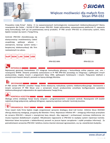 Większe możliwości dla małych firm Slican IPM-032 Prowadzisz małą firmę? Zależy Ci na zaawansowanych technologicznie rozwiązaniach telekomunikacyjnych? Mamy rozwiązanie dla Ciebie – SLICAN IP PBX serwer IPM-032. Dzięki jednorodnej, zaawansowanej platformie IT, zapewnia tanią komunikację VoIP już od podstawowej wersji produktu. IP PBX serwer IPM-032 to uniwersalny system, który będzie rozwijać się razem z Twoją firmą. Centrale IPM-032 charakteryzują się elastycznością i modułowością. Całość uzupełniają aplikacje własne i zewnętrzne, tworząc system taniej i bezpiecznej telekomunikacji dla firm nastawionych na sukces. IPM-032.WM IPM-032.2U INTEGRACJA Najnowszej generacji Komunikator CTI integruje komunikację głosową z komunikacją online poprzez czat, sms i rozwiązania WWW. Otwarte protokoły zastosowane w IP PBX IPM-032 pozwalają na integrację z aplikacjami innych producentów, między innymi z programami klasy CRM, aplikacjami hotelowymi i innymi. Połączenie telefonii z zewnętrznymi bazami danych, pozwala na lepszą obsługę klientów. SIECIOWANIE IP PBX serwer IPM-032 umożliwi Twojej firmie elastyczną rozbudowę systemu telekomunikacyjnego. Sieciowanie z innymi serwerami IP PBX Slican oraz z serwerami innych producentów umożliwia konfigurowanie systemów telekomunikacyjnych odpowiednio do zapotrzebowania Twojej firmy. KONTROLA KOSZTÓW Obsługa online zredukuje Twoje koszty związane z programowaniem i serwisem centrali. Rozwiązanie LCR (wybór najtańszej drogi połączenia), aplikacje bilingowe, zapewnią najniższe rachunki i kontrolę kosztów. ORGANIZACJA PRACY Teraz nawet mała firma będzie mogła zorganizować sprawnie działający dział Call Center. Infolinie Slican INVENIO oferują elastyczną nawigację, przyjazną dla klientów i firmy. Najnowsze infolinie API – zintegrują informacje przesyłane do serwera IPM-032 z danymi z zewnętrznej bazy danych. Aby nagrywać i archiwizować rozmowy telefoniczne nie musisz kupować dodatkowych urządzeń. Wbudowane nagrywanie w IPM-032 to wydajny system rejestracji rozmów. Natomiast łatwe korzystanie z telekonferencji pozwoli na jeszcze lepsze zarządzanie i szybki przepływ informacji. Za pośrednictwem serwerów IPM-032 i telefonu można również sterować ogrzewaniem, czy np. oświetleniem budynku. www.slican.pl S t r o n a 1 Większe możliwości dla małych firm Slican IPM-032 Stan na listopad 2012 SERWER IPM-032.WM.A 24 12 12 2 64* 100 100 12 124 12 1 SERWER SERWER SERWER IPM-032.WM.L IPM-032.2U.A IPM-032.2U.L Porty analogowe AB 24 32 32 Linie miejskie POTS 12 16 16 ISDN BRA (wew. lub zewn.) 12 16 16 E 1/ ISDN PRA (wew. lub zewn.) --2 --Kanały VoIP 4 64* 4 Maksymalna Translacje VoIP 100 100 100 pojemność Abonenci VoIP 100 100 100 Linie GSM 12 16 16 Porty systemowe CTS Up0 / IP 124 / 8 124 124 / 8 Kanały nagrywania rozmów 12 12 12 Karty pamięci SD 1 1 1 telefony systemowe Slican CTS Up0 / IP telefony Slican SIP VPS-2000P / 310P telefon Slican XL-2023ID Urządzenia współpracujące telefon beztarczowy Slican HLP-22 bramofony Slican DPH Multi Switch Box (MSB-1102) Multi Audio Box (MAB-1101) pakiet aplikacji Slican CTI Aplikacje wspomagające pracę IPM Slican BillingMAN / BillingMAN.plus Slican RecordMAN.server / RecordMAN.client Obsługiwane protokoły ESSL, SIP 2.0 oraz kodeki: G.711, G.729 (opcja) Parametry VoIP Obsługiwani klienci VoIP do 100 urządzeń VoIP-SIP Tryb pracy Klient lub / i serwer VoIP ~110-230V;50-60 ~110-230V;50-60 ~110-230V;50-60 ~110-230V;50-60 Zasilanie Hz; < 150 VA Hz; < 150 VA Hz; < 150 VA Hz; < 150 VA Zasilanie buforowe opcja opcja PROTOKOŁY Protokoły komunikacji głosowej POTS / ISDN-EDSS1 / QSIG / SIP 2.0 / GSM900 / 1800 / Up0 Protokoły komunikacji z serwerem CTIP / HOTELP / TAPI / EbdRECP / HTTP / XML CECHY I ZALETY współpraca z telefonami systemowymi Slican Up0, IP i SIP współpraca z Komunikatorem Slican CTI- aplikacje do pracy stacjonarnej i mobilnej otwarte protokoły (HTTP / EbdRECP / TAPI / HOTELP / XML / CTIP) telefonia internetowa VoIP zaawansowane zarządzanie i kontrola kosztów zintegrowany GSM sieciowanie po LAN / WAN zintegrowane nagrywanie rozmów sterowanie urządzeniami zewnętrznymi obudowa naścienna i RACK *8 na dzień przygotowania ulotki www.slican.pl S t r o n a 2
