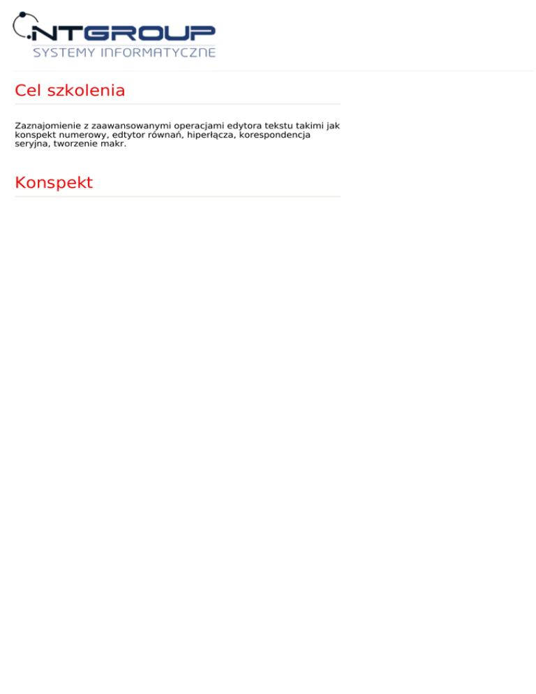 Cel szkolenia Zaznajomienie z zaawansowanymi operacjami edytora tekstu takimi jak konspekt numerowy, edtytor równań, hiperłącza, korespondencja seryjna, tworzenie makr. Konspekt Wymagana wiedza Znajomość podstawowych zagadnień dotyczących tworzenia i formatowania dokumentów w MS Word Program szkolenia: 1. Powtórzenie podstaw a. Znaki podziału wiersza i akapitu 2. Wykorzystanie spacji nierozdzielającej. 3. Wiersz i akapit a. Podział wiersza i strony, Wcięcia i odstępy. 4. Tabulatory a. Rodzaje, Znaki wiodące. 5. Sekcje – rodzaje a. Podział dokumentu na sekcje, b. Typy podziałów. Nagłówek i stopka w sekcjach. 6. Grafika a. Zamieszczanie grafiki b. Modyfikacja grafiki; szacowanie grafiki c. Przemieszczanie i formatowanie grafiki, SmartArt. 7. Koperty i etykiety 8. Style i motywy a. Wybieranie, zmiana b. Modyfikacje, własne style. 9. Przypis i podpis. 10. Edytor równań a. Wstawianie złożonych wzorów i wyrażeń b. Modyfikacje wzorów 11. Indeksy i spisy a. Tworzenie spisu treści, modyfikacja i aktualizacja b. Spis treści na podstawie własnych stylów teksu c. Tworzenie i oznaczanie indeksów. 12. Korespondencja seryjna a. Tworzenie i modyfikacja z MS EXCEL i MS ACCESS. 13. Formularze a. Rodzaje, Ochrona dokumentu b. Osadzanie obiektów w dokumencie c. Osadzanie tabel i wykresów Excel d. Tworzenie i edycja łączy, Hiperłącza, Obiekty OLE. 14. Import i eksport danych a. Import danych CSV, TXT, XLS 15. Export do formatów PDF. 16. Szablony dokumentów a. Gotowe szablony b. Tworzenie i wykorzystanie własnych szablonów. 17.Makra Dodatkowe informacje W cenę szkolenia wliczony jest: Certyfikat ukończenia szkolenia NT Group Sp. z o.o. Materiały szkoleniowe, notatnik, długopis Kontakt z trenerem po szkoleniu Kawa, herbata, słodki poczęstunek Obiad Firma posiada wpis w Urzędzie Miasta Łodzi jako placówka kształcenia ustawicznego. Nazwa: Szkolenie MS Word 2010/2013/2016 – operacje zaawansowane Czas trwania: 2 dni Ilość godzin: 16 Język: Prowadzący: Wieloletni trener Microsoft Lokalizacja: NT Group Łódź, siedziba klienta, lub dowolne miasto w Polsce Cena szkolenia: 390 PLN Dostępne terminy NT GROUP Sp. z o.o. 90-418 Łódź, Al. T. Kościuszki 39 III piętro infolina 801 011 684 Tel.: +48 42 655-33-77; Fax: +48 42 630-15-63 e-mail: [email protected] NT Group Systemy Informatyczne Sp. z o.o. Krajowy Rejestr Sądowy Konto Bankowe 90-418 Łódź, Al. T. Kościuszki 39 III piętro KRS 0000214993 Kredyt Bank S.A. tel.: +42 6553377 Sąd Rejonowy dla Łodzi-Śródmieścia Rozliczenie Krajowe: tel. / fax. +42 6301563 w Łodzi, XX Wydział KRS 71 1500 1246 1215 4005 5991 0000 e-mail: [email protected] www.ntgroup.pl Rozliczenie Zagraniczne: Regon: 470557218 PL 71 1500 1246 1215 4005 5991 0000 NIP: 7251888624 KRDBPLPW