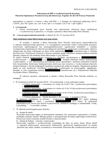 WPS.IX.431.2.2015.BG/DS Informacja do BIP o wynikach kontroli doraźnej Placówki Opiekuńczo-Wychowawczej dla Dziewcząt, Topolno 45, 86-120 Pruszcz Pomorski sporządzona w oparciu o Ustawę z dnia 6.09.2001 r. o dostępie do informacji publicznej (Dz.U. z 2014r., poz.782 z późn. zm. ) art. 4 ust.1 pkt 1 w związku z art. 6 ust. 1 pkt 4 ppkt a I. Cel kontroli: Ocena przestrzegania praw dziecka oraz zapewnienia właściwej pracy opiekuńczej i wychowawczej w placówce, w związku z pismem z Biura Rzecznika Praw Dziecka. II. Czas przeprowadzenia kontroli: w dniach 20, 26 i 27 stycznia 2015r. Opis ustalonego stanu faktycznego oraz jego ocena: W związku z pismem z Biura Rzecznika Praw Dziecka dotyczącym nieprawidłowości w zakresie funkcjonowania placówki, a w szczególności stosowania wobec wychowanek przemocy (stosowanie upokarzających kar pozaregulaminowych), ograniczania kontaktów z rodziną, występowania niepokojących zdarzeń powodujących niewłaściwe zachowania wychowanek, odmowy urlopowania do domu rodzinnego na okres świąt małoletniej xxxxxx x hospitalizowanej w Szpitalu dla Nerwowo i Psychicznie Chorych w Świeciu, pomimo zgody ordynatora, przeprowadzono kontrolę doraźną, mającą na celu ustalenie stanu faktycznego w tym zakresie. W trakcie kontroli przeprowadzono rozmowę z s. Dyrektor, psychologiem p. xxxxxxxx xxxxx-, wychowawcami – s. xxxxxxxx xx, i p. xxxxxxxx xxxxx. Ponadto dokonano analizy dokumentacji wychowanków, w tym dokumentacji prowadzonej przez specjalistów. Istotnym elementem kontroli była bezpośrednia obserwacja funkcjonowania dziewcząt oraz rozmowa z wychowankami placówki przeprowadzona w dwóch podgrupach (spotkania następowały jedno po drugim). Organizacja spotkań miała na celu możliwość weryfikacji wypowiedzi wychowanek na poszczególne zagadnienia. Ponadto, w celu wyjaśnienia sytuacji xxxxxxx xxxxxxx konsultowano się z Ordynatorem Oddziału Psychiatrii Dzieci i Młodzieży. W zakresie zarzutów wskazanych w piśmie z Biura Rzecznika Praw Dziecka ustalono, co następuje: 1. W ewidencji na dzień 20 stycznia 2015r. 19 wychowanek, w tym realizujące naukę: w I klasie gimnazjum – 4 uczennice (w wieku od 14 do17 lat) , wychowawca prowadzący s. xxxxxxxx xxxxxx, w II klasie gimnazjum – 4 uczennice (w wieku od 15 do 18 lat),wychowawca prowadzący xxxxxxxx xxxxx-xxxxxxxxxx, w III klasie gimnazjum – 10 uczennic ( w wieku 16 do 19 lat), wychowawca prowadzący s. xxxxxxxx xxxxxxx i xxx xxxxxxxxxxxxxxxxx. w II klasie gimnazjum – Szkoła Specjalna w Koronowie – 1 uczennica (18 lat). W placówce zatrudnione są również – wychowawca xxxxxxx xxxx (0.5 etatu), pedagog xxxxxxxxxx xxx(0.5 etatu) i psycholog xxxxxxxx xxxxx (0.5 etatu). W godzinach popołudniowych zawsze jest dwóch wychowawców, dodatkowo pedagog w poniedziałek i środę, a psycholog w czwartek i sobotę. 2. W zakresie przestrzegania praw dziecka: a) dostęp do nauki: Wszystkie dziewczęta objęte są obowiązkiem szkolnym, bez zastrzeżeń wyposażenie w książki, niezbędne artykuły szkolne. Bieżącą pomoc w przygotowaniu do lekcji zapewniają wychowawcy. Pozytywna ocena wyrażona została również o nauczycielach. b) dostęp do kultury, rozwoju i wypoczynku: Dziewczęta wspólnie z wychowawcami wyjeżdżają do kina, na pizzę, basen. Biorą udział w zajęciach plastycznych, muzycznych, kulinarnych, sportowych organizowanych na terenie placówki (np. taniec zumba), uczestniczą w koncertach. Placówka dba o podtrzymywanie tradycji 1 wspólnego obchodzenia urodzin, imienin i świąt. Na terenie placówki organizowane są różne imprezy, przedstawienia i konkursy np. Andrzejki, Wieczór Wigilijny, Dzień Dziecka. Na co dzień dzieci mają zapewniony dostęp do telewizji, radia, komputera oraz biblioteki. Dziewczęta prowadzą kronikę dokumentującą wycieczki oraz uczestnictwo w imprezach kulturoworekreacyjnych, c) swobody wypowiedzi, prywatności oraz ochrony przed poniżającym traktowaniem i karaniem: W powyższym zakresie, została przeprowadzona rozmowa w dwóch podgrupach, a uzyskane odpowiedzi były zbieżne ze sobą. Wychowanki mają prawo do prywatności, mogą swobodnie wypowiadać się na każdy temat, w zachowaniu są spontaniczne, żadna z dziewcząt nie skarżyła się na przemoc psychiczną czy fizyczną. Na zadane wprost pytanie – czy doświadczają przemocy psychicznej w formie obrażania, ośmieszania, poniżania, wyśmiewania, molestowania, czy doświadczają przemocy fizycznej w formie bicia, popychania, szturchania, pozbawiania posiłku – kategorycznie zaprzeczyły. Poproszono również o wymienienie stosowanych kar – obydwie grupy wymieniły zgodnie, że są to prace wykonywane na rzecz placówki np. grabienie liści, prace porządkowe, przy czym zawsze jasno jest określany obowiązujący zakres dodatkowych obowiązków. Na pytanie z jakiego powodu są karane – odpowiedź również była zgodna - za używanie wulgaryzmów. Odnośnie ograniczania kontaktów z rodziną – wychowanki przekazały, iż obowiązuje w placówce zasada braku zgody na najbliższy wyjazd do domu w przypadku ucieczki. W placówce panuje dobra kameralna atmosfera, wychowanki potwierdziły, iż w sprawach trudnych zawsze mogą liczyć na wsparcie ze strony wychowawców, na rozmowy indywidualne z psychologiem. d) zrzeszania się: W placówce funkcjonuje Samorząd Wychowanków, zagadnienia dotyczące spraw wychowanków omawiane są wspólnie z wychowawcą. Opiekunem Samorządu jest s. xxxxxxxx xxxxxx, przewodniczącą xxxxxxx xxxx, z-ca xxxxxx xx i xxxxxxx xxxx prowadząca kronikę. Samorząd ma wpływ na organizację różnych imprez i uroczystości w placówce. Duże znaczenie dziewczęta przypisują spotkaniom społeczności, które odbywają się jeden raz w tygodniu (piątek). Spotkanie te, w ocenie wychowanek uczą ich rozmawiania o problemach występujących w grupie, szukania konstruktywnych rozwiązań, mówienia o swoich emocjach i oczekiwania