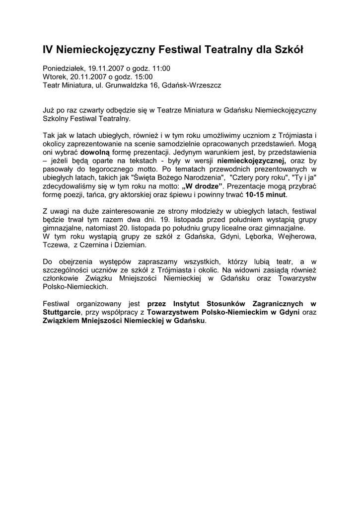 IV Niemieckojęzyczny Festiwal Teatralny dla Szkół Poniedziałek, 19.11.2007 o godz. 11:00 Wtorek, 20.11.2007 o godz. 15:00 Teatr Miniatura, ul. Grunwaldzka 16, Gdańsk-Wrzeszcz Już po raz czwarty odbędzie się w Teatrze Miniatura w Gdańsku Niemieckojęzyczny Szkolny Festiwal Teatralny. Tak jak w latach ubiegłych, również i w tym roku umożliwimy uczniom z Trójmiasta i okolicy zaprezentowanie na scenie samodzielnie opracowanych przedstawień. Mogą oni wybrać dowolną formę prezentacji. Jedynym warunkiem jest, by przedstawienia – jeżeli będą oparte na tekstach - były w wersji niemieckojęzycznej, oraz by pasowały do tegorocznego motto. Po tematach przewodnich prezentowanych w ubiegłych latach, takich jak "Święta Bożego Narodzenia", "Cztery pory roku", "Ty i ja" zdecydowaliśmy się w tym roku na motto: „W drodze”. Prezentacje mogą przybrać formę poezji, tańca, gry aktorskiej oraz śpiewu i powinny trwać 10-15 minut. Z uwagi na duże zainteresowanie ze strony młodzieży w ubiegłych latach, festiwal będzie trwał tym razem dwa dni. 19. listopada przed południem wystąpią grupy gimnazjalne, natomiast 20. listopada po południu grupy licealne oraz gimnazjalne. W tym roku wystąpią grupy ze szkół z Gdańska, Gdyni, Lęborka, Wejherowa, Tczewa, z Czernina i Dziemian. Do obejrzenia występów zapraszamy wszystkich, którzy lubią teatr, a w szczególności uczniów ze szkół z Trójmiasta i okolic. Na widowni zasiądą również członkowie Związku Mniejszości Niemieckiej w Gdańsku oraz Towarzystw Polsko-Niemieckich. Festiwal organizowany jest przez Instytut Stosunków Zagranicznych w Stuttgarcie, przy współpracy z Towarzystwem Polsko-Niemieckim w Gdyni oraz Związkiem Mniejszości Niemieckiej w Gdańsku.