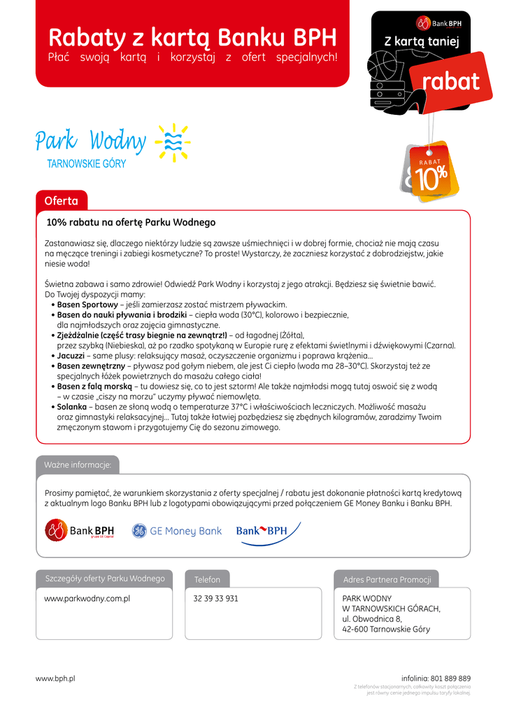 Rabaty z kartą Banku BPH Płać swoją kartą i korzystaj z ofert specjalnych! 810 R AA B TA T RBA Oferta 10% rabatu na ofertę Parku Wodnego Zastanawiasz się, dlaczego niektórzy ludzie są zawsze uśmiechnięci i w dobrej formie, chociaż nie mają czasu na męczące treningi i zabiegi kosmetyczne? To proste! Wystarczy, że zaczniesz korzystać z dobrodziejstw, jakie niesie woda! Świetna zabawa i samo zdrowie! Odwiedź Park Wodny i korzystaj z jego atrakcji. Będziesz się świetnie bawić. Do Twojej dyspozycji mamy: • Basen Sportowy – jeśli zamierzasz zostać mistrzem pływackim. • Basen do nauki pływania i brodziki – ciepła woda (30°C), kolorowo i bezpiecznie, dla najmłodszych oraz zajęcia gimnastyczne. • Zjeżdżalnie (część trasy biegnie na zewnątrz!) – od łagodnej (Żółta), przez szybką (Niebieska), aż po rzadko spotykaną w Europie rurę z efektami świetlnymi i dźwiękowymi (Czarna). • Jacuzzi – same plusy: relaksujący masaż, oczyszczenie organizmu i poprawa krążenia... • Basen zewnętrzny – pływasz pod gołym niebem, ale jest Ci ciepło (woda ma 28–30°C). Skorzystaj też ze specjalnych łóżek powietrznych do masażu całego ciała! • Basen z falą morską – tu dowiesz się, co to jest sztorm! Ale także najmłodsi mogą tutaj oswoić się z wodą – w czasie „ciszy na morzu” uczymy pływać niemowlęta. • Solanka – basen ze słoną wodą o temperaturze 37°C i właściwościach leczniczych. Możliwość masażu oraz gimnastyki relaksacyjnej... Tutaj także łatwiej pozbędziesz się zbędnych kilogramów, zaradzimy Twoim zmęczonym stawom i przygotujemy Cię do sezonu zimowego. Ważne informacje: Prosimy pamiętać, że warunkiem skorzystania z oferty specjalnej / rabatu jest dokonanie płatności kartą kredytową z aktualnym logo Banku BPH lub z logotypami obowiązującymi przed połączeniem GE Money Banku i Banku BPH. Szczegóły oferty Parku Wodnego Telefon Adres Partnera Promocji www.parkwodny.com.pl 32 39 33 931 PARK WODNY W TARNOWSKICH GÓRACH, ul. Obwodnica 8, 42-600 Tarnowskie Góry www.bph.pl infolinia: 801 889 889 Z telefonów stacjonarnych, całkowity koszt połączenia jest równy cenie jednego impulsu taryfy lokalnej.