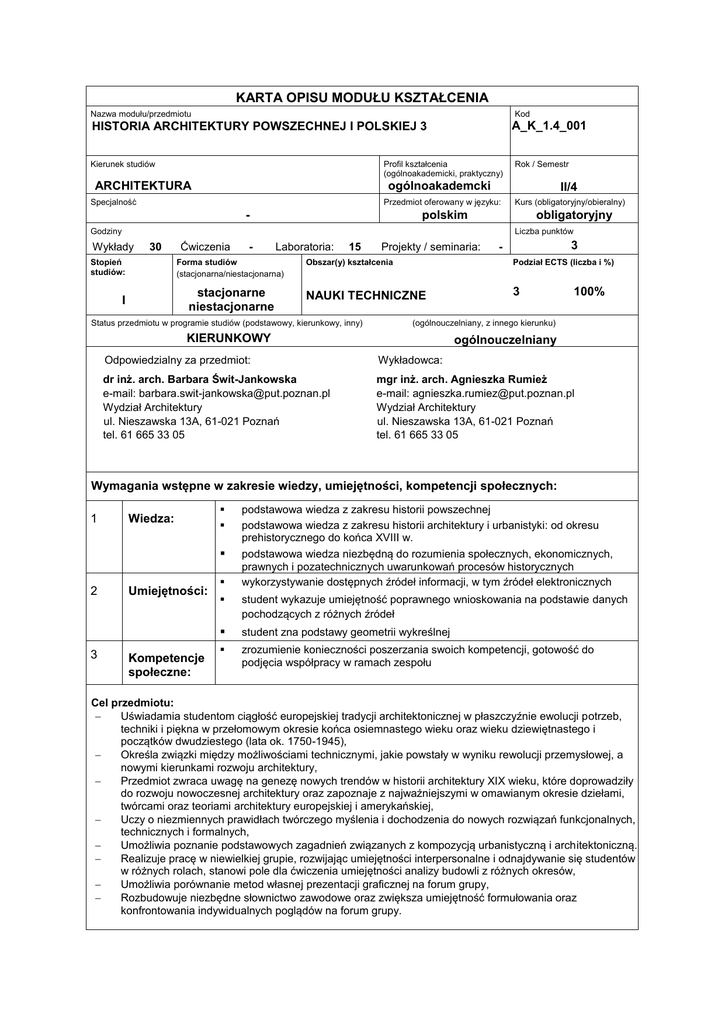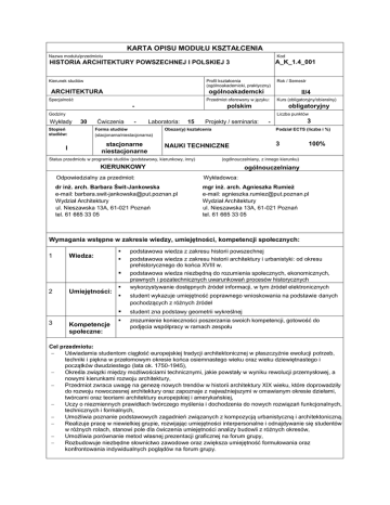KARTA PRZEDMIOTU - Wydział Architektury Politechniki Poznańskiej