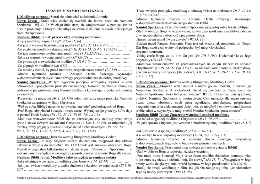 TYDZIEŃ 2: NAMIOT SPOTKANIA 1. Modlitwa poranna: Staraj się odmawiać codziennie Jutrznię Słowo Życia: „Ktokolwiek chciał się zwrócić do Jahwe, szedł do Namiotu Spotkania”. Wj 33, 7b W ciągu dnia staraj się zarejestrować w pamięci łub na piśmie problemy, z którymi chciałbyś się zwrócić do Pana w czasie dzisiejszego Namiotu Spotkania. Studium Biblii: Temat: przeszkadza owocnej modlitwie? -Czyją modlitwę wspiera Bóg? (2 Krn 16,9a)……………………………………. -Co jest przyczyną bezskutecznej modlitwy? (Prz 21,13 i Jk 4,3)……………….. -Co pozbawia modlitwy skuteczności? (Hi 35,12-13; Jk 4,6; 1 P 5,5b).....…..….. -Co jest warunkiem wysłuchania modlitwy? (1 J 3,22-23)…………...………..… -Jakie są warunki owocnej modlitwy? (1P 3,8-12) ……….…………................... -Co powoduje niewysłuchanie modlitwy? (Jk 9,5-7) …….…..………………… -Co piętnuje w modlitwie (Mt 6,5)? ……………………………………………... -Co musimy zrobić, by przed modlitwą oczyścić nasze serca? (1 J 1,9) ………… Odmów tajemnicę różańca - Zesłanie Ducha Świętego, wyrażając w dopowiedzeniach myśl: Duch Święty przysposabia nas do dobrej modlitwy. Namiot Spotkania: W tym tygodniu podejmij szczególny wysiłek w celu odnowienia i pogłębienia praktyki codziennego Namiotu Spotkania. Staraj się codziennie przygotować swój Namiot Spotkania korzystając z podanych poniżej wskazówek. -Przeczytaj na początku Mk 1, 35. Uświadom sobie, że przez praktykę Namiotu Spotkania wstępujesz w ślady Chrystusa. -Weź ze sobą Biblię i notes do notowania natchnień pochodzących od Boga. -Proś Boga, aby zbadał i oczyścił twoje serce. Wyznaj swoje grzechy, które daje ci poznać Duch Święty (Ps 139, 23-24; Ps 68, 18; 1 J 1,9). -Modlitwa wstawiennicza: Módl się: za chrześcijan, aby stali się przez swoje życic i słowa żywymi świadkami Chrystusa (2 Kor 5, 17-20); za młodzież i jej rodziny, żeby pragnęły słuchać i uczyć się od siebie nawzajem (Ps 127, 1a; Prz 3, 33; Ef 4, 31-32; 5, 22; 6, 4; Kol 1, 10; 1 P 3,8-9). 2. Modlitwa poranna: Jutrznia według liturgicznej Modlitwy Godzin Słowo Życia: „Ile razy Mojżesz wszedł do namiotu, zstępował słup obłoku i stawał u wejścia do namiotu”. Wj 33,9 Obłok jest znakiem obecności Boga. Pomyśl w ciągu dnia kilkakrotnie o dzisiejszym Namiocie Spotkania, w którym danym ci będzie w szczególny sposób przeżyć obecność Boga dla ciebie. Studium Biblii Temat: Modlitwa jako narzędzie przemiany świata -Jaką obietnicę w związku z modlitwą daje Jezus w J 14, 12-14? ………………. -Jaki jest związek modlitwy z walką duchową i dziełem ewangelizacji (Ef 8,1020)? ………………………………………………………………………………. -Ukaż związek pomiędzy modlitwą a odnową świata na podstawie Dz 1, 12-14; 2, 1-13; 2,42-47…………………………………………………………………………… Odmów tajemnicę różańca - Zesłanie Ducha Świętego, nawiązując w dopowiedzeniach do dzisiejszego studium Biblii. Namiot Spotkania: Przed Namiotem Spotkania przygotuj sobie teksty biblijne! -Stań w obliczu Boga w oczekiwaniu, że ten czas spotkania i modlitwy odsłoni ci w sposób głębszy obecność i przymioty Boga. „Spraw, abym ujrzał Twoją chwałę” (Wj 33, 18). -Czekaj przed Panem. Słuchanie Pana jest tak ważne jak mówienie do Niego. Daj Bogu swój czas wolny od pośpiechu, byś mógł Go słuchać sercem i rozumem. -Oddaj cześć Bogu, za to, kim On jest (Ps 103 i 104). Uwielbiaj Go za Jego przymioty (Ps 145; 150). -Modlitwa wstawiennicza: za prześladowanych na całym świecie za oddanie Chrystusowi (Ps 91,14-16; Flp 3,8-16); za niewolników alkoholu, narkotyków, grzechu niewiary i rozpaczy (Mt 5,44-45; J 8, 31-32; Rz 6, 19-23; 1 Kor 10, 13; 2 Kor 3, 17). 3. Modlitwa poranna: Jutrznia według liturgicznej Modlitwy Godzin Słowo Życia: „Mojżesz wziął namiot i rozbił go za obozem, i nazwał go Namiotem Spotkania. A ktokolwiek chciał się zwrócić do Pana, szedł do Namiotu Spotkania, który był poza obozem”. Wj 33, 7 Przemyśl dzisiaj sprawę praktyki Namiotu Spotkania w twoim życiu. Czy znalazłeś dla niego miejsce i czas „poza obozem”, czyli poza zgiełkiem, niepokojem, pośpiechem i zagonieniem dnia codziennego? Jeżeli nie, co mógłbyś i co powinieneś jeszcze zrobić, abyś w swym życiu mógł rozbić Namiot Spotkania „poza obozem”. Studium Biblii Temat: Znaczenie wspólnej i zgodnej modlitwy -Co mówi o zgodnej modlitwie Chrystus w Mt 18, 19-20? ……………………… -W jaki sposób Chrystus jest wzorem i źródłem zgodnej modlitwy? (Rz 15,5-7) ………….............................................................................................................. -Jaki jest owoc wspólnej modlitwy? (2 Kor 1, 10-11)............................................. -Co ma być treścią wspólnej modlitwy? (Kol 4, 2-3 i 2 Tes 3, 1)..……................ Odmów tajemnicę różańca o Zesłaniu Ducha Świętego, uwydatniaj w dopowiedzeniach Jego rolę w budowaniu jedności wiernych. Namiot Spotkania: Przed modlitwą wybierz potrzebne cytaty z Biblii! -Stań w obliczu Boga z radością i dziękczynieniem. „Pan moją mocą i tarczą! Moje serce Jemu zaufało: doznałem pomocy, więc moje serce się cieszy i pieśnią moją Go sławię” (Ps 28, 7). „Wstępujcie w Jego bramy wśród dziękczynienia, wśród hymnów w Jego przedsionki” (Ps 100,4). -Raduj się swoją wspólnotą z Nim, tak jak On raduje się tobą- „upodobaniem Jego są modły uczciwych” (Prz 15, 8b). Notatnik opracowany przez Diakonię Ewangelizacji diecezji Sandomierskiej na podstawie „Notatnika uczestnika I roku formacji deuterokatechumenalnej Ruchu Światło-Życie. Modlitwa Krok 6” -Modlitwa wstawiennicza: o jedność Ciała Chrystusa i za ewangelizację 