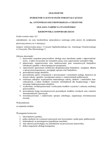 OGŁOSZENIE DYREKTOR I LICEUM OGÓLNOKSZTAŁCĄCEGO im. ANTONIEGO OSUCHOWSKIEGO w CIESZYNIE OGŁASZA NABÓR NA STANOWISKO KIEROWNIKA GOSPODARCZEGO liczba wymiar etatu: 0,5 zatrudnienie: na czas nieokreślony (pracodawca zastrzega sobie prawo do podpisania pierwszej umowy na 3 miesięcy). miejsce wykonywania pracy: I Liceum Ogólnokształcące im. Antoniego Osuchowskiego w Cieszynie, Plac Słowackiego 2. Główne obowiązki: 1. kierowanie zespołem pracowników obsługi oraz określanie zadań i odpowiedzialności, a także stwarzanie im warunków pracy oraz zapewnienie warunków bhp, 2. planowanie, organizowanie oraz nadzorowanie prac remontowych budynków szkolnych zgodnie z obowiązującymi przepisami, 3. zapewnienie sprawności techniczno-eksploatacyjnej budynków, urządzeń, dbanie o sprzęt przeciwpożarowy, przeglądy sprzętu oraz budynków, 4. prowadzenie księgi obiektów, 5. prowadzenie spraw związanych z inwestycjami i remontami (usługi, dostawy) na terenie szkoły, zgodnie z przepisami ustawy o zamówieniach publicznych, 6. realizacja zakupów wyposażenia materialnego szkoły, druków i materiałów kancelaryjnych, a także środków czystości niezbędnych dla bezpiecznego i higienicznego funkcjonowania obiektów, 7. wydawanie, ewidencjonowanie i rozliczanie środków czystości i ochrony osobistej pracowników. 8. prowadzenie ksiąg inwentarzowych pozostałych środków trwałych oraz wartości niematerialnych i prawnych, 9. inwentaryzowanie i znakowanie sprzętu szkolnego, organizacja inwentaryzacji rocznej. Wykształcenie: co najmniej średnie. Wymagania konieczne: 1. 2. 3. 4. 5. obywatelstwo polskie, pełna zdolność do czynności prawnych oraz korzystanie z pełni praw publicznych, niekaralność za przestępstwa popełnione umyślnie, stan zdrowia pozwalający na zatrudnienie na powyższym stanowisku, dobra znajomość obsługi komputera, 6. staż pracy co najmniej 2 lata w przypadku wykształcenia wyższego kierunkowego lub 6 lat w przypadku wykształcenia średniego. Wymagania pożądane: a) doświadczenie w pracy na powyższym stanowisku lub podobnym, b) znajomość edytora Word, c) znajomość arkusza Excel. d) kreatywność e) umiejętność zarządzania zespołem pracowników. Wymagane dokumenty i oświadczenia: 1. a) życiorys kandydata (CV), b) list motywacyjny, c) oświadczenie o korzystaniu z pełni praw publicznych, d) oświadczenie o niekaralności za przestępstwa popełnione umyślnie, e) kopie dokumentów potwierdzających wykształcenie, f) dokumenty potwierdzające staż pracy. g) kopie nowego dowodu osobistego. Wymagane dokumenty aplikacyjne: list motywacyjny, CV, powinny być opatrzone klauzulą: Wyrażam zgodę na przetwarzanie moich danych osobowych zawartych w ofercie pracy dla potrzeb niezbędnych do realizacji procesu rekrutacji zgodnie z ustawą z dnia 29 sierpnia 1997 r. o ochronie danych osobowych. Dokumenty należy składać lub przesłać do dnia: 1 lutego 2013 r. na adres: I Liceum Ogólnokształcące im. A. Osuchowskiego, Pl. Słowackiego 2, 43-400 Cieszyn, z dopiskiem na kopercie „OFERTA ZATRUDNIENIA”. Inne informacje: Kandydaci zakwalifikowani zostaną powiadomieni o terminie rozmowy wstępnej. Oferty odrzucone zostaną komisyjnie zniszczone. Dodatkowe informacje można uzyskać pod nr tel. 033 8521139 Cieszyn, 2 stycznia 2013 r. Dyrektor Szkoły Janusz Łukomski-Prajzner