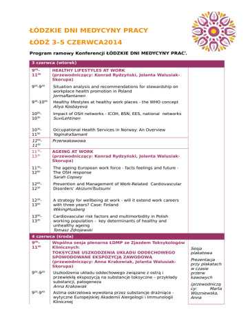 ŁÓDZKIE DNI MEDYCYNY PRACY ŁÓDŹ 3–5 CZERWCA2014 Program ramowy Konferencji ŁÓDZKIE DNI MEDYCYNY PRACY 3 czerwca (wtorek) 9001100 HEALTHY LIFESTYLES AT WORK (przewodniczący: Konrad Rydzyński, Jolanta WalusiakSkorupa) 900-930 Situation analysis and recommendations for stewardship on workplace health promotion in Poland JormaRantanen 930-1000 Healthy lifestyles at healthy work places - the WHO concept Aliya Kosbayeva 10001030 Impact of OSH networks - ICOH, BSN, EES, national networks SuviLehtinen 10301100 Occupational Health Services in Norway: An Overview YogindraSamant 11001130 Przerwakawowa 11301330 AGEING AT WORK (przewodniczący: Konrad Rydzyński, Jolanta WalusiakSkorupa) 11301200 The ageing European work force - facts feelings and future The OSH response Sarah Copsey 12001230 Prevention and Management of Work-Related Cardiovascular Disorders' AkizumiTsutsumi 12301300 A strategy for wellbeing at work - will it extend work careers with three years? Case: Finland WikingHusberg 13001330 Cardiovascular risk factors and multimorbidity in Polish working population - key determinants of healthy and unhealthy ageing Tomasz Zdrojewski 4 czerwca (środa) 9001100 900-920 920-940 Wspólna sesja plenarna ŁDMP ze Zjazdem Toksykologów Klinicznych: TOKSYCZNE USZKODZENIA UKŁADU ODDECHOWEGO SPOWODOWANE EKSPOZYCJĄ ZAWODOWĄ (przewodniczący: Anna Krakowiak, Jolanta WalusiakSkorupa) Uszkodzenia układu oddechowego związane z ostrą i przewlekłą ekspozycją na substancje toksyczne – przykłady substancji, patogeneza Anna Krakowiak Astma oskrzelowa wywołana przez substancje drażniące wytyczne Europejskiej Akademii Alergologii i Immunologii Klinicznej Sesja plakatowa Prezentacja przy plakatach w czasie przerw kawowych (przewodniczą cy: Marta Wiszniewska, Anna Marta Wiszniewska 40 9 -10 00 Zespół Reaktywnej Dysfunkcji Dróg Oddechowych Cezary Pałczyński 10001020 Współczesne metody oceny zapalenia w układzie oddechowym Wojciech Piotrowski 10201040 Leczenie toksycznych uszkodzeń układu oddechowego Adam Antczak 10401100 Dyskusja 11001130 Przerwa kawowa 11301215 PLENARNA SESJA WSPOMNIENIOWA O DR EWIE WĄGROWSKIEJ-KOSKI (przewodniczący: Konrad Rydzyński, Jolanta WalusiakSkorupa) 12151310 NOWE WYZWANIA W OCHRONIE ZDROWIA PRACUJĄCYCH (przewodniczący: Jolanta Walusiak-Skorupa, Ewa Kaczanowska-Burker) 12151235 Praca po 50 roku życia - konieczność czy szansa na lepsze życie? Bogumiła Urbaniak 12351255 Ochrona zdrowia psychicznego jako zadanie służby medycyny pracy Dorota Merecz 12551310 Służba medycyny pracy kluczowym elementem działań prozdrowotnych Jolanta Walusiak-Skorupa 13101400 Lunch 14001530 ZDROWE ŻYCIE I AKTYWNE STARZENIE SIĘ JAKO WYZWANIE WSPÓŁCZESNEJ MEDYCYNY PRACY (przewodniczący: Patrycja Krawczyk-Szulc, Anna Mikołajczyk) 14001430 Centra Kariery 50+ - innowacyjne wsparcie dla pracowników starszych zagrożonych utratą pracy Marta Kononowicz 14301445 Rola rehabilitacji w procesie pozytywnego starzenia się i utrzymania aktywności zawodowej i społecznej Anna Puzder 14451500 Czy służba medycyny pracy rzeczywiście uczestniczy w rehabilitacji zawodowej? Patrycja Krawczyk-Szulc 15001515 Ograniczenia zdolności do wykonywania pracy u pracowników z reumatoidalnym zapaleniem stawów Przemysław Markowski, Agnieszka Gajo, Patrycja KrawczykSzulc 15151530 Projekt e-CAPACIT8 szansą wzrostu kompetencji profesjonalistów w zakresie ochrony zdrowia starszych pracowników Piotr Sakowski, Maciej Dobras 1530- Przerwa kawowa Mikołajczyk) 1600 16001730 16001615 16151630 ORZECZNICTWO W MEDYCYNIE PRACY (przewodniczący: Ewa Kaczanowska-Burker, Grażyna Wośkowiak) Obustronnaniestabilność nerwów łokciowych na poziomie stawu łokciowego ze współistniejącą neuropatią nerwu łokciowego lewego u osoby pracującej zawodowo z użyciem komputera - prezentacja przypadku Magdalena Lewańska Gruźlica płuc pochodzenia zawodowego u pracownika domu pogrzebowego – opis przypadku Anna Witkowska, Marta Wiszniewska, Anna Krakowiak, Jolanta Walusiak- Skorupa 16301645 Ogólne zasady dobrej praktyki w opiece profilaktycznej Jolanta Walusiak-Skorupa, Marcin Rybacki, Patrycja KrawczykSzulc, Andrzej Marcinkiewicz, Marta Wiszniewska 16451700 Opis przypadku gorączki krwotocznej zgłoszonej jako choroba zawodowa Katarzyna Skręt, Judyta Tomasik-Homicka 17001715 Standardy postępowania orzeczniczego u pracowników chorych na cukrzycę Andrzej Marcinkiewicz Dorota Szosland, Marcin Rybacki, MartaWiszniewska, Jolanta Walusiak-Skorupa Współistnienie objawów alergicznego zapalenia spojówek i nieżytu nosa wśród pacjentów z podejrzeniem alergii zawodowej Diana Tymoszuk, Marta Wiszniewska, Jolanta Walusiak-Skorupa 5 czerwca (czwartek) 900WSPÓŁCZESNE ZAGROŻENIA ZDROWOTNE W MIEJSCU 1030 PRACY (przewodniczący: Marta Wiszniewska, Renata Złotkowska) 17151730 900-930 Uszkodzenie słuchu jako problem cywilizacyjny Mariola Śliwińska-Kowalska 930-945 Zagrożenia zdrowotne w służbie ratownika górniczego Renata Złotkowska, Alina Mroczek, Ewa Zbrojkiewicz, Teresa Bilewicz-Wyrozumska, Mariusz Kuś 945-1000 Problemy zdrowotne osób zatrudnionych w salonach kosmetycznych Marta Kieć-Świerczyńska, Dorota Chomiczewska-Skóra, Dominika Świerczyńska-Machura, Beata Kręcisz 10001015 Narząd wzroku w pułapce cywilizacji Alicja Pas-Wyroślak 10151030 Epidemia alergii kontaktowej na metyloizotiazolinon Beata Kręcisz, Dorota Chomiczewska-Skóra, Marta KiećŚwierczyńska Przerwakawowa 10301100 11001315 VARIA (przewodniczący: Marcin Rybacki, Jacek Parszuto) 11001115 Realia profilaktycznej opieki zdrowotnej nad pracownikami w Polsce Jerzy Kopias 11151130 Sytuacja zdrowotna kierowców z terenu woj. świętokrzyskiego prowadzących pojazdy po spożyciu alkoholu - prezentacja wyników badań własnych Ewa Latała-Łoś 11301145 Zdolność do kierowania pojazdami osoby z niepełnosprawnością rąk - prezentacja przypadku Marcin Rybacki, Marcin Kosobudzki, Zbigniew Jóźwiak 11451200 Portal 
