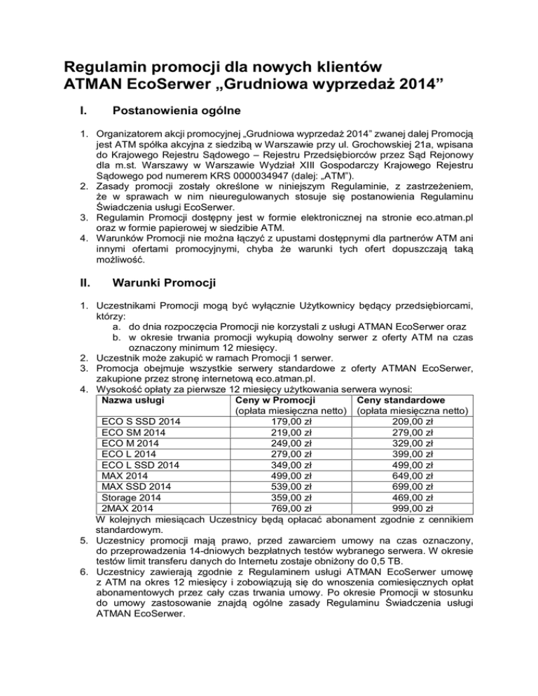 Regulamin promocji dla nowych klientów ATMAN EcoSerwer „Grudniowa wyprzedaż 2014” I. Postanowienia ogólne 1. Organizatorem akcji promocyjnej „Grudniowa wyprzedaż 2014” zwanej dalej Promocją jest ATM spółka akcyjna z siedzibą w Warszawie przy ul. Grochowskiej 21a, wpisana do Krajowego Rejestru Sądowego – Rejestru Przedsiębiorców przez Sąd Rejonowy dla m.st. Warszawy w Warszawie Wydział XIII Gospodarczy Krajowego Rejestru Sądowego pod numerem KRS 0000034947 (dalej: „ATM”). 2. Zasady promocji zostały określone w niniejszym Regulaminie, z zastrzeżeniem, że w sprawach w nim nieuregulowanych stosuje się postanowienia Regulaminu Świadczenia usługi EcoSerwer. 3. Regulamin Promocji dostępny jest w formie elektronicznej na stronie eco.atman.pl oraz w formie papierowej w siedzibie ATM. 4. Warunków Promocji nie można łączyć z upustami dostępnymi dla partnerów ATM ani innymi ofertami promocyjnymi, chyba że warunki tych ofert dopuszczają taką możliwość. II. Warunki Promocji 1. Uczestnikami Promocji mogą być wyłącznie Użytkownicy będący przedsiębiorcami, którzy: a. do dnia rozpoczęcia Promocji nie korzystali z usługi ATMAN EcoSerwer oraz b. w okresie trwania promocji wykupią dowolny serwer z oferty ATM na czas oznaczony minimum 12 miesięcy. 2. Uczestnik może zakupić w ramach Promocji 1 serwer. 3. Promocja obejmuje wszystkie serwery standardowe z oferty ATMAN EcoSerwer, zakupione przez stronę internetową eco.atman.pl. 4. Wysokość opłaty za pierwsze 12 miesięcy użytkowania serwera wynosi: Nazwa usługi Ceny w Promocji Ceny standardowe (opłata miesięczna netto) (opłata miesięczna netto) ECO S SSD 2014 179,00 zł 209,00 zł ECO SM 2014 219,00 zł 279,00 zł ECO M 2014 249,00 zł 329,00 zł ECO L 2014 279,00 zł 399,00 zł ECO L SSD 2014 349,00 zł 499,00 zł MAX 2014 499,00 zł 649,00 zł MAX SSD 2014 539,00 zł 699,00 zł Storage 2014 359,00 zł 469,00 zł 2MAX 2014 769,00 zł 999,00 zł W kolejnych miesiącach Uczestnicy będą opłacać abonament zgodnie z cennikiem standardowym. 5. Uczestnicy promocji mają prawo, przed zawarciem umowy na czas oznaczony, do przeprowadzenia 14-dniowych bezpłatnych testów wybranego serwera. W okresie testów limit transferu danych do Internetu zostaje obniżony do 0,5 TB. 6. Uczestnicy zawierają zgodnie z Regulaminem usługi ATMAN EcoSerwer umowę z ATM na okres 12 miesięcy i zobowiązują się do wnoszenia comiesięcznych opłat abonamentowych przez cały czas trwania umowy. Po okresie Promocji w stosunku do umowy zastosowanie znajdą ogólne zasady Regulaminu Świadczenia usługi ATMAN EcoSerwer. 7. Promocja niniejsza nie dotyczy osób fizycznych nieprowadzących działalności gospodarczej. III. Czas trwania Promocji 1. Promocja obowiązuje od 19 grudnia 2014 roku do: a. 31 grudnia 2014 roku lub b. wyczerpania zapasów lub c. odwołania, którekolwiek z powyższych zdarzeń nastąpi wcześniej. 2. Liczba serwerów dostępnych w Promocji jest ograniczona. 3. Organizator może odwołać akcję promocyjną bez podania przyczyny, w szczególności w przypadku wprowadzenia nowej oferty promocyjnej. IV. Postanowienia końcowe 1. Do świadczenia usług ATMAN EcoSerwer w ramach Umów zawartych na warunkach niniejszej Promocji mają zastosowanie postanowienia Regulaminu Świadczenia usługi EcoSerwer dostępnego na stronie http://eco.atman.pl/. W przypadku sprzeczności pomiędzy postanowieniami Regulaminu Promocji i Regulaminu Świadczenia usługi EcoSerwer, stosuje się postanowienia Regulaminu Świadczenia usługi EcoSerwer. 2. Zakup usług w ramach oferty promocyjnej oznacza zaakceptowanie postanowień niniejszego Regulaminu. 3. Zasady oferty promocyjnej mogą ulec zmianie w czasie jej trwania, z tym zastrzeżeniem, że zmiana taka nie będzie dotyczyć umów zawartych przed dniem dokonania takiej zmiany. Organizator zobowiązuje się poinformować o zakresie ewentualnych zmian na stronie internetowej, na której umieścił informację o ofercie promocyjnej. 4. Rabat, rozumiany jako różnica pomiędzy ceną standardową usługi a ceną promocyjną, przyznany Uczestnikowi w ramach oferty promocyjnej, nie podlega wymianie na ekwiwalent pieniężny, inne usługi bądź świadczenia. 5. Uczestnik Promocji zobowiązuje się nie rozwiązywać umowy w okresie 12 miesięcy licząc od dnia jej zawarcia. W przypadku rozwiązania umowy przed upływem ww. okresu przez Uczestnika albo przez Organizatora z winy Uczestnika, Uczestnik zobowiązany będzie do zwrotu Organizatorowi wartości rabatu udzielonego Uczestnikowi, pomniejszonego o proporcjonalną jego wartość za okres od dnia zawarcia umowy do jej rozwiązania. 6. Regulamin Promocji wchodzi w życie z dniem 19 grudnia 2014 r.