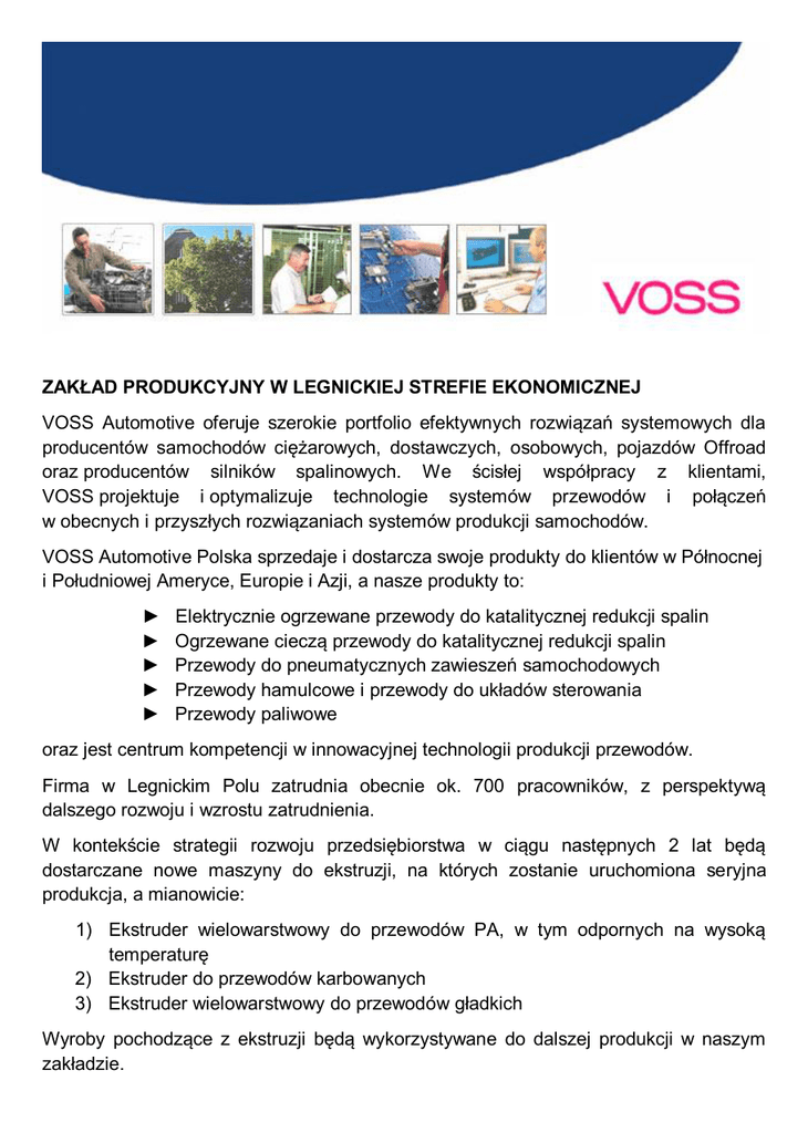 ZAKŁAD PRODUKCYJNY W LEGNICKIEJ STREFIE EKONOMICZNEJ VOSS Automotive oferuje szerokie portfolio efektywnych rozwiązań systemowych dla producentów samochodów ciężarowych, dostawczych, osobowych, pojazdów Offroad oraz producentów silników spalinowych. We ścisłej współpracy z klientami, VOSS projektuje i optymalizuje technologie systemów przewodów i połączeń w obecnych i przyszłych rozwiązaniach systemów produkcji samochodów. VOSS Automotive Polska sprzedaje i dostarcza swoje produkty do klientów w Północnej i Południowej Ameryce, Europie i Azji, a nasze produkty to: ► ► ► ► ► Elektrycznie ogrzewane przewody do katalitycznej redukcji spalin Ogrzewane cieczą przewody do katalitycznej redukcji spalin Przewody do pneumatycznych zawieszeń samochodowych Przewody hamulcowe i przewody do układów sterowania Przewody paliwowe oraz jest centrum kompetencji w innowacyjnej technologii produkcji przewodów. Firma w Legnickim Polu zatrudnia obecnie ok. 700 pracowników, z perspektywą dalszego rozwoju i wzrostu zatrudnienia. W kontekście strategii rozwoju przedsiębiorstwa w ciągu następnych 2 lat będą dostarczane nowe maszyny do ekstruzji, na których zostanie uruchomiona seryjna produkcja, a mianowicie: 1) Ekstruder wielowarstwowy do przewodów PA, w tym odpornych na wysoką temperaturę 2) Ekstruder do przewodów karbowanych 3) Ekstruder wielowarstwowy do przewodów gładkich Wyroby pochodzące z ekstruzji będą wykorzystywane do dalszej produkcji w naszym zakładzie.