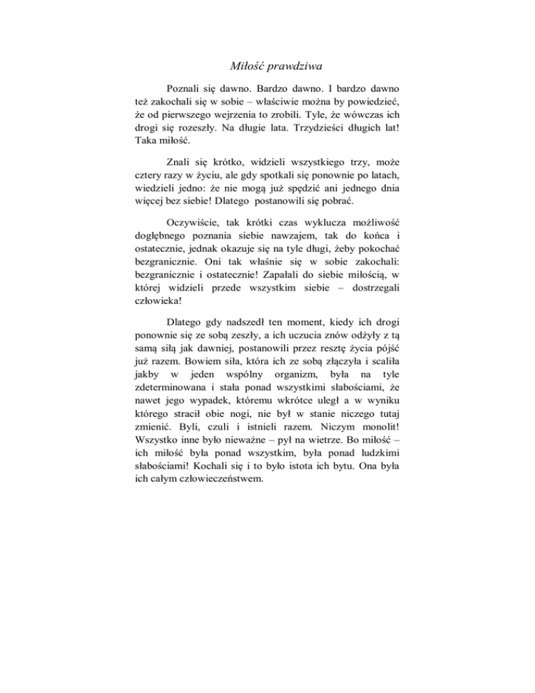 Miłość prawdziwa Poznali się dawno. Bardzo dawno. I bardzo dawno też zakochali się w sobie – właściwie można by powiedzieć, że od pierwszego wejrzenia to zrobili. Tyle, że wówczas ich drogi się rozeszły. Na długie lata. Trzydzieści długich lat! Taka miłość. Znali się krótko, widzieli wszystkiego trzy, może cztery razy w życiu, ale gdy spotkali się ponownie po latach, wiedzieli jedno: że nie mogą już spędzić ani jednego dnia więcej bez siebie! Dlatego postanowili się pobrać. Oczywiście, tak krótki czas wyklucza możliwość dogłębnego poznania siebie nawzajem, tak do końca i ostatecznie, jednak okazuje się na tyle długi, żeby pokochać bezgranicznie. Oni tak właśnie się w sobie zakochali: bezgranicznie i ostatecznie! Zapałali do siebie miłością, w której widzieli przede wszystkim siebie – dostrzegali człowieka! Dlatego gdy nadszedł ten moment, kiedy ich drogi ponownie się ze sobą zeszły, a ich uczucia znów odżyły z tą samą siłą jak dawniej, postanowili przez resztę życia pójść już razem. Bowiem siła, która ich ze sobą złączyła i scaliła jakby w jeden wspólny organizm, była na tyle zdeterminowana i stała ponad wszystkimi słabościami, że nawet jego wypadek, któremu wkrótce uległ a w wyniku którego stracił obie nogi, nie był w stanie niczego tutaj zmienić. Byli, czuli i istnieli razem. Niczym monolit! Wszystko inne było nieważne – pył na wietrze. Bo miłość – ich miłość była ponad wszystkim, była ponad ludzkimi słabościami! Kochali się i to było istota ich bytu. Ona była ich całym człowieczeństwem.