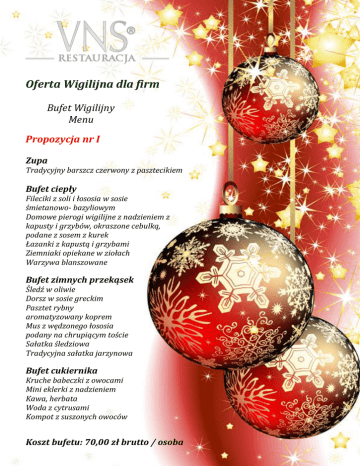 Oferta Wigilijna dla firm Bufet Wigilijny Menu Propozycja nr I Zupa Tradycyjny barszcz czerwony z pasztecikiem Bufet ciepły Fileciki z soli i łososia w sosie śmietanowo- bazyliowym Domowe pierogi wigilijne z nadzieniem z kapusty i grzybów, okraszone cebulką, podane z sosem z kurek Łazanki z kapustą i grzybami Ziemniaki opiekane w ziołach Warzywa blanszowane Bufet zimnych przekąsek Śledź w oliwie Dorsz w sosie greckim Pasztet rybny aromatyzowany koprem Mus z wędzonego łososia podany na chrupiącym toście Sałatka śledziowa Tradycyjna sałatka jarzynowa Bufet cukiernika Kruche babeczki z owocami Mini eklerki z nadzieniem Kawa, herbata Woda z cytrusami Kompot z suszonych owoców Koszt bufetu: 70,00 zł brutto / osoba Propozycja nr II Zupa Grzybowa z łazankami Bufet ciepły Domowe pierogi wigilijne z nadzieniem z kapusty i pieczarek, okraszone cebulką Pierogi faszerowane gotowanym karpiem i pstrągiem, podane z sosem z kurek Łosoś pieczony, podany na sosie śmietanowo – borowikowym Fileciki z soli i łososia w sosie śmietanowo- bazyliowym Ziemniaki pieczone w ziołach Warzywa blanszowane z ziołowym masełkiem Surówka z buraczków Przystawki zimne Pstrąg parzony w białym winie glazurowany cytrynową galaretką Tymbaliki z białych ryb, dopełnione szyjkami rakowymi, w jarzynach Sałatka śledziowa Tatar z łososia z kaparami i oliwkami Pasztet rybny Dorsz w sosie greckim Śledzik w śmietanie z cebulą, ogórkiem i jabłkiem Tradycyjna sałatka jarzynowa Mix sałat i warzyw z tuńczykiem i zielonymi oliwkami Dodatki Pieczywo, masełka smakowe, sosy Bufet cukiernika Domowa szarlotka Tradycyjny makowiec Kawa, herbata Woda z cytrusami Kompot z suszonych owoców Koszt bufetu: 95,00 zł brutto / osoba Propozycja nr III Zupa Zupa borowikowa z lanymi kluseczkami Tradycyjny barszcz czerwony z pasztecikiem Bufet ciepły Filet z halibuta zapiekany z suszonymi pomidorami i parmezanem Pierogi z kapustą i grzybami, okraszone cebulką Pierogi faszerowane łososiem i karpiem Pstrąg panierowany w płatkach migdałów Łazanki z kapustą i grzybami Roladki z soli, z szyjkami rakowymi w sosie śmietanowo – koperkowym Cannelloni z duszonym szpinakiem i serem feta Ziemniaki opiekane w ziołach Warzywa blanszowane Surówka z kiszonej kapusty Bufet zimnych przekąsek Przepiórcze jajka z kawiorem i łososiem Fileciki z pstrąga parzone w białym winie, glazurowane cytrynową galaretką Tatar z wędzonego i świeżego łososia, z kaparami i pastą guacamole Śledzik w śmietanie z cebulką, ogórkiem i jabłkiem Mus z wędzonego łososia podany z kaparami Łódeczki z cykorii podane z anchois i orzechami Tradycyjna sałatka jarzynowa Mix sałat, warzyw i ziół z serem feta i czarnymi oliwkami Dodatki Kosze pieczywa i masełka smakowe Bufet Cukiernika Tradycyjny makowiec Domowa szarlotka Kawa, herbata Woda z cytrusami Kompot z suszonych owoców Koszt bufetu: 130,00 zł brutto / osoba Forma płatności: do uzgodnienia