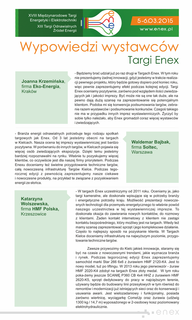 XVIII Międzynarodowe Targi Energetyki i Elektrotechniki XIII Targi Odnawialnych Źródeł Energii Joanna Krzemińska, firma Eko-Energia, Kraków - Będziemy brać udział już po raz drugi w Targach Enex. W tym roku nie prezentujemy żadnej innowacji, gdyż jesteśmy w trakcie realizacji pewnego projektu, który będzie gotowy dopiero pod koniec roku, więc pewnie zaprezentujemy efekt podczas kolejnej edycji. Targi Enex oceniamy pozytywnie, zarówno pod względem ilości zwiedzających jak i jakości imprezy. Być może nie są one tak duże, ale na pewno dają dużą szansę na zaprezentowanie się potencjalnym klientom. Podoba mi się konwencja podsumowania targów, zebranie razem wystawców i podsumowanie konkursów. Czegoś takiego nie ma w przypadku innych imprez wystawienniczych. Życzyć by sobie tylko należało, aby Enex gromadził coraz więcej wystawców i zwiedzających. - Branża energii odnawialnych potrzebuje tego rodzaju spotkań targowych jak Enex. Od 3 lat jesteśmy obecni na targach w Kielcach. Nasza ocena tej imprezy wystawienniczej jest bardzo pozytywna. W porównaniu do innych targów, w Kielcach pojawia się więcej osób zwiedzających ekspozycje. Dzięki temu jesteśmy bardziej rozpoznawalni na rynku. Właśnie tu pozyskujemy więcej klientów, co oczywiście jest dla naszej firmy priorytetem. Podczas Enexu doceniamy też świetne przygotowanie techniczne targów, całą nowoczesną infrastrukturę Targów Kielce. Podczas tegorocznej edycji z pewnością zaprezentujemy nasze ciekawe i nowoczesne produkty, na przykład te związane z pozyskiwaniem energii ze słońca. Katarzyna Wolszewska, firma HMF Polska, Krzeszowice Waldemar Bajbak, firma Soltec, Warszawa - W targach Enex uczestniczymy od 2011 roku. Oceniamy je, jako targi kameralne, ale doskonale wpisujące się w potrzeby branży i energetyczne potrzeby kraju. Możliwość prezentacji nowoczesnych technologii dla przemysłu energetycznego to właśnie powód naszego uczestnictwa w tej wystawienniczej imprezie. To doskonała okazja do zawierania nowych kontaktów, do rozmowy z klientami. Żaden kontakt internetowy z klientem nie zastąpi kontaktu bezpośredniego, który możliwy jest na targach. Wtedy też mamy szansę zaprezentować sprzęt i jego kompleksowe działanie. Często to najlepszy sposób na pozyskanie klienta. W Targach Kielce doceniamy infrastrukturę na najwyższym poziomie, przygotowanie techniczne targów. Zawsze przywozimy do Kielc jakieś innowacje, staramy się być na czasie z nowoczesnymi trendami, jakie wyznacza branża i rynek. Podczas tegorocznej edycji Enex zaprezentujemy samochód marki Star 266 6x6 z żurawiem HMF 2120-K4. Jest to nowy model, tuż po liftingu. W 2013 roku jego pierwowzór - żuraw HMF 2020-K4 zdobył na targach Enex złoty medal. W tym roku poka-żemy jeszcze SCANIĘ P360 CB 4x4 HHZ z żurawiem HMF 2620-K5, sprzęt dedykowany do pracy w najcięższym terenie, używany będzie do budowany linii przesyłowych w tym również do remontów i modernizacji już istniejących sieci oraz do konserwacji i usuwania awarii. Jest wielozadaniowy i funkcjonalny, posiada zarówno wiertnicę, wyciągarkę ComeUp oraz żurawia (udźwig 1300 kg / 14,7 m) wyposażonego w 2-osobowy kosz poziomowany elektrohydraulicznie. e n ex