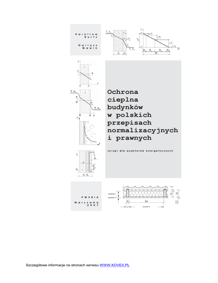 Ochrona cieplna budynków w polskich przepisach normalizacyjnych i prawnych Szczegółowe informacje na stronach serwisu WWW.KOVEX.PL Spis treści Przedmowa 9 Wprowadzenie 11 1. Wymiana ciepła 1.1. Przewodzenie ciepła 1.1.1. Współczynnik przewodzenia ciepła 1.2. Promieniowanie 1.3. Przejmowanie ciepła 1.4. Przenikanie ciepła przez przegrody 1.4.1. Rozkład temperatury 1.5. Współczynnik przenikania ciepła 1.6. Wpływ usytuowania izolacji termicznej na jakość przegrody 1.6.1. Płyty wapienno-krzemianowe do ocieplania od wewnątrz 13 13 15 15 17 19 21 22 22 24 2. Wskaźnik sezonowego zapotrzebowania na ciepło 27 3. Uregulowania prawne a ochrona cieplna budynków 3.1. Dyrektywy Wspólnoty Europejskiej a normalizacja ochrony cieplnej 3.1.1. ZaleŜności pomiędzy normami krajowymi a europejskimi 3.2. Stan prawny i normalizacja ochrony cieplnej w Polsce 3.2.1. Normalizacja ochrony cieplnej w Polsce 29 29 31 31 33 4. Wymagania związane z oszczędnością energii i izolacyjnością cieplną przegród budowlanych 4.1. Wymagania dotyczące wskaźnika sezonowego zapotrzebowania na ciepło budynku 4.2. Wymagania izolacyjności cieplnej przegród budowlanych 4.3. Inne wymagania związane z oszczędnością energii 4.3.1. Maksymalna powierzchnia okien i przegród szklanych 4.3.2. Punkt rosy 4.3.3. Szczelność na przenikanie powietrza 4.4. Wymagania izolacyjności cieplnej względem przegród poddawanych termomodernizacji 35 36 37 40 40 41 41 42 5. Klimat Polski i podział na strefy klimatyczne 43 6. Normy ochrony cieplnej 6.1. PN-EN ISO 10456 6.2. PN-EN ISO 12524 6.3. PN-EN ISO 6946 6.3.1. Opór cieplny warstw jednorodnych 6.3.2. Warstwy powietrza 6.3.3. Przestrzenie nieogrzewane 6.3.4. Całkowity opór cieplny komponentów z warstw jednorodnych i niejednorodnych 6.3.5. Współczynnik przenikania ciepła 6.3.6. Współczynnik przenikania ciepła komponentów o zmiennej grubości 6.3.7. Skorygowany współczynnik przenikania ciepła 6.4. PN-EN ISO 14683 6.4.1. Mostki cieplne 6.4.2. Katalogi liniowych mostków cieplnych 6.5. PN-EN ISO 10077-1 6.6. PN-EN ISO 13370 6.6.1. Podłoga typu płyta na gruncie 6.6.2. Podłoga podniesiona 6.6. PN-EN ISO 13789 6.8. PN-B-02025 6.8.1. Bilans energetyczny budynku 6.8.2. Dane klimatyczne 45 45 47 48 49 50 53 54 59 59 61 65 65 72 75 81 84 86 89 92 92 94 Szczegółowe informacje na stronach serwisu WWW.KOVEX.PL 6.8.3. Obliczanie strat ciepła 6.8.4. Zyski ciepła 94 96 7. Zagadnienia cieplno-wilgotnościowe 7.1. Wpływ wilgoci na trwałość materiałów i obiektów budowlanych 7.2. Zjawiska fizyczne związane z ruchem wilgoci w materiałach i przegrodach budowlanych 7.2.1. Napięcie powierzchniowe 7.2.2. Sorpcja 7.2.3. Kondensacja pary wodnej i punkt rosy 7.3. Mechanizmy przenoszenia wilgoci 7.3.1. Dyfuzja pary wodnej 7.3.2. Mechanizm kondensacja-odparowanie 7.3.3. konwekcja 7.3.4. Przepływ kapilarny 101 102 104 8. Normy związane ze stanem cieplno-wilgotnościowym przegród budowlanych 8.1. Kondensacja powierzchniowa 8.2. PN-EN ISO 13788 8.2.1. Krytyczna wilgotność powierzchni 8.2.2. Kondensacja międzywarstwowa 115 115 117 118 123 Bibliografia i materiały źródłowe 129 Szczegółowe informacje na stronach serwisu WWW.KOVEX.PL 104 105 107 109 109 111 112 112 Przedmowa Intencją autorów było przedstawienie problematyki oceny energetycznej budynków w myśl polskich i europejskich przepisów prawnych i normalizacyjnych. Opracowanie powstało głównie z myślą o uczestnikach kursów przygotowujących do zawodu audytora energetycznego. Miało na celu przypomnienie fizykalnych podstaw projektowania obiektów oraz praktyczną pomoc przy sporządzaniu ocen energetycznych budynków. Starano się, aby treść pracy odzwierciedlała aktualny (tj. w końcu listopada 2007 r.) stan wiedzy w tym zakresie. W rozdziale pierwszym, jako wprowadzenie do tematu normalizacji ochrony cieplnej, przedstawiono zagadnienia związane z wymianą ciepła przez przegody budowlane. W rozdziale kolejnym omówiono znaczenie w projektowaniu i bieŜącej gospodarce energią w budynku, wskaźnika sezonowego zapotrzebowania na ciepło do ogrzewania. Rozdział trzeci i czwarty poświęcono uregulowaniom związanym z oszczędnością energii w branŜy budowlanej, omówiono podstawowe, europejskie i polskie, akty prawne wraz z obowiązującymi wymaganiami projektowymi w tym zakresie. Rozdział piąty zawiera podstawowe informacje dotyczące parametrów klimatu zewnętrznego Polski. W rozdziale szóstym omówiono osiem podstawowych norm z zakresu ochrony cieplnej budynków, podając algorytmy obliczeń charakterystyk głównych elementów odzielających przestrzeń ogrzewaną budynku od środowiska zewnętrznego. Treść rozdziału zilustrowana została kilkunastoma przykładami obliczeniowymi. W kolejnej części przedstawiono zagadnienia związane ze stanem cieplno-wilgotnościowym przegród budowlanych, omawiając wpływ wilgoci na trwałość materiałów / wyrobów, mechanizmy oraz zjawiska związane z ruchem wilgoci w przegrodach budowlanych. W rozdziale ósmym zaprezentowano metodykę wyznaczania punktu rosy oraz algorytmy obliczeń kondensacji powierzchniowej i międzywarstwowej zaczerpnięte z obowiązującej w tym zakresie normy. (...) Autorzy składają serdeczne podziękowanie Jego Magnificencji Profesorowi dr. Tadeuszowi Koźlukowi, Rektorowi Prywatnej WyŜszej Szkoły Businessu, Administracji i Technik Komputerowych za wydanie ksiąŜki. Pierwsza Autorka skryptu chciałaby podziękować swojemu współautorowi – Panu Profesorowi Dariuszowi Gawinowi za wyrozumiałość, pomoc w zmierzeniu się z tematem i cenne uwagi, a ponadto wyrazić wdzięczność Pani Profesor Halinie Garbalińskiej, kierownik Katedry Dróg, Mostów i Materiałów Budowlanych Politechniki Szczecińskiej za przyjęcie jej do swojego zespołu i Ŝyczliwe wsparcie. Karolina Kurtz, Dariusz Gawin Szczecin - Łódź, grudzień 2007 roku. Szczegółowe informacje na stronach serwisu WWW.KOVEX.PL