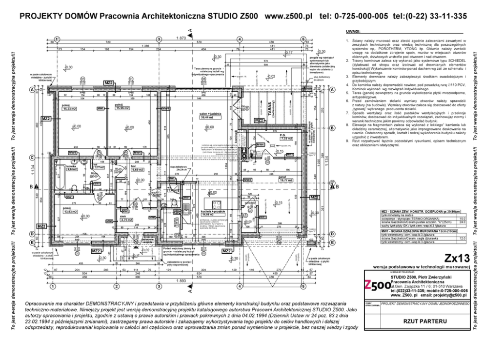 A PROJEKTY DOMÓW Pracownia Architektoniczna STUDIO Z500 www.z500.pl tel: 0-725-000-005 tel:(0-22) 33-11-335 154 234 404 450 411 411 79 61 73 73 - 0,30 - 0,17 pergola wg rozwiązań systemowych lub alternatywnie jako drewniana (ostateczny wybór do ustalenia z inwestorem) 574 spadek 1% 400 235 s łu p ż e lb e to w y 2 4 x 2 4 c m 73 24 40 97 204 51 203 504 450 39 154 1 035 12 80 205 21 196 840 garaż 19,77 m2 M W 4 1 134 spadek 1% TARAS 39 442 12 194 124 70 k o m in d = 2 0 c m ( R o n d o P lu s ) 124 1 056 90 B nawiew typu "Z" M W 1 C' -0,17 12 520 11 306 270 361 25 39 nawiew typu "Z" 90 51 79 M Z 2 O3 304 624 570 E w pasie cokołowym okładzina - z płytki klinkierowej zadaszenie w postaci płyty wspornikowej 191 D MW1 - ŚCIANA DZIAŁOWA MUROWANA 12cm (10cm) tynk wewnętrzny: cem.-wap.kl.3 /glazura ściana:Gazobeton/Ceram. cegła dziurawka 12.0 tynk wewnętrzny: cem.-wap.kl.3 /glazura 27 Dg Podest wejściowy ziemny na gruncie - ostateczny kształt wg indywidualnego opracowania - 0,30 114 246 300 178 80 108 21 21 60 304 h=0 ±0,00 MZ2 - ŚCIANA ZEW. KONSTR. OCIEPLONA gr.39(40)cm tynk mineralny na siatce ocieplenie - styropian (TERMO ORGANIKA) 15.0 ściana:Gazobeton/Ceram.pustak szczelin. "U"(25cm) 24.0 suchy tynk-plyty GK / tynk cem.-wap.kl.3 /glazura - 0,30 M W 1 39 39 80 210 12 spadek 1% 80 205 wentylacja - pustaki wentylacyjne zakończone kominem alternatywnie rura "spiro" o średnicy 150mm zakończona wywiewką dachową B MZ2 D2 80 210 Ds 12x17cm 329 409 kuchnia + przejście 14,08 m2 -0,15 spadek podjazdu - 0,02 140 120 90 12 260 225 zadaszone wejście 246 53 D2 92 schodek 35 -0,30 - 0,15 spadek podjazdu 102 O2 453 12 12 Dz1 spadek 1% 200 235 p a s ie c o k o ło w y m o k ła d z in a - z p ły tk i k lin k ie r o w e j M Z 2 67 162 E 60 164 spadek 1% komin d=14/16cm (Avant) 12 24 spadek 1% 100 230 204 h=0 60 60 58 M W 4 piec C.O 140 94 426 39 12x17cm 12x17cm 1 2 x 1 7 c m MW1 288 114 80 P.G. 7,33 m2 426 18 M W 1 300 235 12 140 80 327 sień 4,75 m2 MW1 M Z 2 24 Ds M W 1 ±0,00 378 a d e k 1 % 24 ±0,00 spizarnia 2,97 m2 pokój 13,93 m2 101 12 100 210 Dw 172 90 110 61 39 A 46 339 77 90 165 D1 275 80 205 225 M W 1 48 292 w.c 2,41 m2 61 D3 90 278 MW1 ±0,00 198 8 113 81 12 80 205 12 540 654 255 sp 1 2 x 1 7 c m słup żelbetowy 24x24cm 117 12 60 M W 1 B hol 9,69 m2 129 80 205 D1 90 12 237 D3 90 80 205 288 80 205 34 80 205 159 hol 3,77 m2 66 łazienka 6,04 m2 237 1 134 went. d=15cm C kominek wg opracowania indywidualnego (projektu wnętrz); pod komnikiem wykonać wzmocnienie w warstwach posadzkowych (szlichta za zbrojona etc.) lub posadowić kominek na fundamencie 179 MW4 kominek 635 90 D1 24 81 38 12 117 4 D1 48 90 12 240 12 12x17cm 518 ±0,00 60 MW4 38 MZ2 75 456 480 426 ±0,00 (zadaszony) 150 235 spadek 1% M W 4 salon + jadalnia 39,44 m2 ±0,00 35 546 pokój 15,96 m2 MW1 h=0 404 102 w pasie cokołowym okładzina - z płytki klinkierowej 108 41 h=85 154 350 88 M Z 2 w - 0,02 spadek 1% pokój 15,23 m2 12 Ob 39 88 154 27 54 h=85 154 334 92 D 35 39 MZ2 spadek 1% O4 150 150 O1 150 150 O1 spadek 1% Taras ziemny na gruncie ostateczny kształt wg indywidualnego opracowania w pasie cokołowym okładzina - z płytki klinkierowej A 504 41 39 39 27 35 -0,30 1. Ściany należy murować oraz zbroić zgodnie zaleceniami zawartymi w zeszytach technicznych oraz wiedzą techniczną dla poszczególnych systemów np,. POROTHERM, YTONG itp. Głównie należy zwrócić uwagę na dodatkowe zbrojenie spoin, murów w miejscach otworów okiennych, drzwiowych w strefie pod otworem i nad otworem. 2. Trzony kominowe zaleca się wykonać jako systemowe typu SCHIEDEL (dylatować od stropu oraz izolować od drewnianych elementów konstrukcji) Wykończenie kominów ponad dachem wg zał. ze schematu i opisu technicznego. 3. Elementy drewniane należy zabezpieczyć środkiem owadobójczym i grzybobójczym. 4. Do kominka należy doprowadzić nawiew, pod posadzką rurą ∅110 PCV, Kominek wykonać wg rozwiązań indywidualnego. 5. Taras (ganek) zewnętrzny na gruncie wykończenie płytki mrozoodporne, antypoślizgowe. 6. Przed zamówieniem stolarki wymiary otworów należy sprawdzić z natury (na budowie). Wymiary otworów zaleca się dostosować do oferty „typowej” wybranego producenta stolarki. 7. Sposób wentylacji oraz ilość pustaków wentylacyjnych i przekroje kominów, dostosować do indywidualnych rozwiązań, zachowując normy i warunki techniczne jakim powinny odpowiadać budynki. 8. Elewacje na fragmentach zaleca się wykonać z lekkiego” kamienia lub okładziny ceramicznej, alternatywnie jako impregnowane deskowanie na ruszcie. Ostateczny sposób, kształt i rodzaj wykończenia budynku należy uzgodnić z inwestorem. 9. Rzut rozpatrywać łącznie pozostałymi rysunkami, opisem technicznym oraz obliczeniami statycznymi. 270 188 - 0,30 27 129 116 270 450 450 64 57 57 84 Zx13 wersja podstawowa w technologii murowanej GENERALNY PROJEKTANT: STUDIO Z500, Piotr Zwierzyński Pracownia Architektoniczna ul.Gen. Zajączka 11 / 6; 01-510 Warszawa tel.(022)33-11-335; mobile:0-725-000-005 www. Z500. pl email: [email protected] 1 893 1 2 3 4 5 A To jest wersja demonstracyjna projektu!!! To jest wersja demonstracyjna projektu!!! To jest wersja demonstracyjna projektu!!! 154 Opracowanie ma charakter DEMONSTRACYJNY i przedstawia w przybliżeniu główne elementy konstrukcji budynku oraz podstawowe rozwiązania techniczno-materiałowe. Niniejszy projekt jest wersją demonstracyjną projektu katalogowego autorstwa Pracowni Architektonicznej STUDIO Z500. Jako autorzy opracowania i projektu, zgodnie z ustawą o prawie autorskim i prawach pokrewnych z dnia 04.02.1994 (Dziennik Ustaw nr 24 poz. 83 z dnia 23.02.1994 z późniejszymi zmianami), zastrzegamy prawa autorskie i zakazujemy wykorzystywania tego projektu do celów handlowych i dalszej odsprzedaży, reprodukowania/ kopiowania w całości ani częściowo oraz wprowadzania zmian ponad wymienione w projekcie, bez naszej wiedzy i zgody TEMAT OPRACOWANIA: PROJEKT DE
