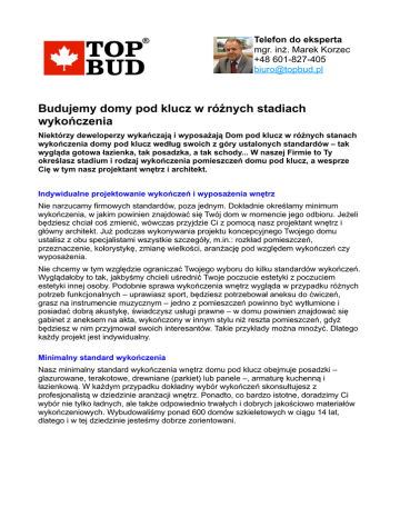 Telefon do eksperta mgr. inż. Marek Korzec +48 601-827-405 [email protected] Budujemy domy pod klucz w różnych stadiach wykończenia Niektórzy deweloperzy wykańczają i wyposażają Dom pod klucz w różnych stanach wykończenia domy pod klucz według swoich z góry ustalonych standardów – tak wygląda gotowa łazienka, tak posadzka, a tak schody... W naszej Firmie to Ty określasz stadium i rodzaj wykończenia pomieszczeń domu pod klucz, a wesprze Cię w tym nasz projektant wnętrz i architekt. Indywidualne projektowanie wykończeń i wyposażenia wnętrz Nie narzucamy firmowych standardów, poza jednym. Dokładnie określamy minimum wykończenia, w jakim powinien znajdować się Twój dom w momencie jego odbioru. Jeżeli będziesz chciał coś zmienić, wówczas przyjdzie Ci z pomocą nasz projektant wnętrz i główny architekt. Już podczas wykonywania projektu koncepcyjnego Twojego domu ustalisz z obu specjalistami wszystkie szczegóły, m.in.: rozkład pomieszczeń, przeznaczenie, kolorystykę, zmianę wielkości, aranżację pod względem wykończeń czy wyposażenia. Nie chcemy w tym względzie ograniczać Twojego wyboru do kilku standardów wykończeń. Wyglądałoby to tak, jakbyśmy chcieli uśrednić Twoje poczucie estetyki z poczuciem estetyki innej osoby. Podobnie sprawa wykończenia wnętrz wygląda w przypadku różnych potrzeb funkcjonalnych – uprawiasz sport, będziesz potrzebował aneksu do ćwiczeń, grasz na instrumencie muzycznym – jedno z pomieszczeń powinno być wytłumione i posiadać dobrą akustykę, świadczysz usługi prawne – w domu powinien znajdować się gabinet z aneksem na akta, wykończony w innym stylu niż reszta pomieszczeń, gdyż będziesz w nim przyjmował swoich interesantów. Takie przykłady można mnożyć. Dlatego każdy projekt jest indywidualny. Minimalny standard wykończenia Nasz minimalny standard wykończenia wnętrz domu pod klucz obejmuje posadzki – glazurowane, terakotowe, drewniane (parkiet) lub panele –, armaturę kuchenną i łazienkową. W każdym przypadku dokładny wybór wykończeń skonsultujesz z profesjonalistą w dziedzinie aranżacji wnętrz. Ponadto, co bardzo istotne, doradzimy Ci wybór nie tylko ładnych, ale także odpowiednio trwałych i dobrych jakościowo materiałów wykończeniowych. Wybudowaliśmy ponad 600 domów szkieletowych w ciągu 14 lat, dlatego i w tej dziedzinie jesteśmy dobrze zorientowani.