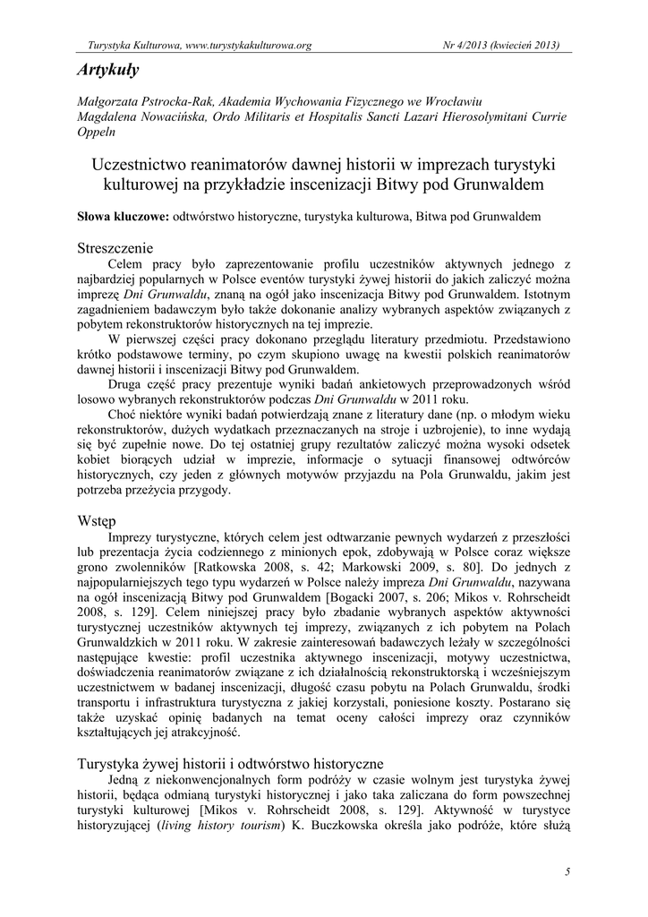 Turystyka Kulturowa, www.turystykakulturowa.org Nr 4/2013 (kwiecień 2013) Artykuły Małgorzata Pstrocka-Rak, Akademia Wychowania Fizycznego we Wrocławiu Magdalena Nowacińska, Ordo Militaris et Hospitalis Sancti Lazari Hierosolymitani Currie Oppeln Uczestnictwo reanimatorów dawnej historii w imprezach turystyki kulturowej na przykładzie inscenizacji Bitwy pod Grunwaldem Słowa kluczowe: odtwórstwo historyczne, turystyka kulturowa, Bitwa pod Grunwaldem Streszczenie Celem pracy było zaprezentowanie profilu uczestników aktywnych jednego z najbardziej popularnych w Polsce eventów turystyki żywej historii do jakich zaliczyć można imprezę Dni Grunwaldu, znaną na ogół jako inscenizacja Bitwy pod Grunwaldem. Istotnym zagadnieniem badawczym było także dokonanie analizy wybranych aspektów związanych z pobytem rekonstruktorów historycznych na tej imprezie. W pierwszej części pracy dokonano przeglądu literatury przedmiotu. Przedstawiono krótko podstawowe terminy, po czym skupiono uwagę na kwestii polskich reanimatorów dawnej historii i inscenizacji Bitwy pod Grunwaldem. Druga część pracy prezentuje wyniki badań ankietowych przeprowadzonych wśród losowo wybranych rekonstruktorów podczas Dni Grunwaldu w 2011 roku. Choć niektóre wyniki badań potwierdzają znane z literatury dane (np. o młodym wieku rekonstruktorów, dużych wydatkach przeznaczanych na stroje i uzbrojenie), to inne wydają się być zupełnie nowe. Do tej ostatniej grupy rezultatów zaliczyć można wysoki odsetek kobiet biorących udział w imprezie, informacje o sytuacji finansowej odtwórców historycznych, czy jeden z głównych motywów przyjazdu na Pola Grunwaldu, jakim jest potrzeba przeżycia przygody. Wstęp Imprezy turystyczne, których celem jest odtwarzanie pewnych wydarzeń z przeszłości lub prezentacja życia codziennego z minionych epok, zdobywają w Polsce coraz większe grono zwolenników [Ratkowska 2008, s. 42; Markowski 2009, s. 80]. Do jednych z najpopularniejszych tego typu wydarzeń w Polsce należy impreza Dni Grunwaldu, nazywana na ogół inscenizacją Bitwy pod Grunwaldem [Bogacki 2007, s. 206; Mikos v. Rohrscheidt 2008, s. 129]. Celem niniejszej pracy było zbadanie wybranych aspektów aktywności turystycznej uczestników aktywnych tej imprezy, związanych z ich pobytem na Polach Grunwaldzkich w 2011 roku. W zakresie zainteresowań badawczych leżały w szczególności następujące kwestie: profil uczestnika aktywnego inscenizacji, motywy uczestnictwa, doświadczenia reanimatorów związane z ich działalnością rekonstruktorską i wcześniejszym uczestnictwem w badanej inscenizacji, długość czasu pobytu na Polach Grunwaldu, środki transportu i infrastruktura turystyczna z jakiej korzystali, poniesione koszty. Postarano się także uzyskać opinię badanych na temat oceny całości imprezy oraz czynników kształtujących jej atrakcyjność. Turystyka żywej historii i odtwórstwo historyczne Jedną z niekonwencjonalnych form podróży w czasie wolnym jest turystyka żywej historii, będąca odmianą turystyki historycznej i jako taka zaliczana do form powszechnej turystyki kulturowej [Mikos v. Rohrscheidt 2008, s. 129]. Aktywność w turystyce historyzującej (living history tourism) K. Buczkowska określa jako podróże, które służą 5 Turystyka Kulturowa, www.turystykakulturowa.org Nr 4/2013 (kwiecień 2013) pogłębianiu kontaktu turysty z historią z różnych obszarów kulturowych i różnych okresów czasowych [Buczkowska 2008, s. 59]. A. Mikos v. Rohrscheidt [2008, ss. 129-130] podkreśla, że uczestnictwo w takich imprezach może mieć zarówno charakter bierny (widz), jak i aktywny (odtwórca). W ramach turystyki żywej historii funkcjonuje zjawisko odtwórstwa historycznego, zwanego w języku angielskim historical reenactment [Bogacki 2008c, s. 222], będące: „zbiorem działań polegających na wizualnej prezentacji różnego rodzaju dziedzin życia człowieka w przeszłości [...] przez osoby przebrane w stroje i posługujące się przedmiotami nawiązującymi (replikami lub rzadziej rekonstrukcjami) do wybranej epoki, będące świadomymi odtwórcami” [Bogacki 2010a, s. 16]. Zainteresowani turystyką żywej historii mogą odwiedzać pola bitew, często decydujących w przeszłości o losach wielu krajów, uczestniczyć w jarmarkach miejskich, festynach historycznych, prezentacjach codziennego życia, obrzędów i zwyczajów, czy inscenizacjach batalistycznych. Zarówno P.T. Kwiatkowski [2008, ss. 110-111], jak i M. Bogacki [2010a, s. 5] uważają, że pojęcie odtwórstwa jest bliskie, ale niejednoznaczne z pojęciem rekonstrukcji historycznej, która powinna być używana tylko w odniesieniu do osób, które charakteryzują się najwyższym poziomem wiedzy na temat wybranego fragmentu przeszłości i odtwarzają przeszłość najwierniej jak to możliwe. Jednakże nie wszyscy badacze problemu podchodzą do tych pojęć w tak rygorystyczny sposób i używają ich często zamiennie, np. A. Mikos v. Rohrscheidt [2008], K. Rojek [2009] czy E. Tomaszewska [2009]. Warto w tym miejscu wspomnieć, że wśród odtwórców historycznych krąży pojęcie „archeologia eksperymentalna”, która często mylnie pojmowana jest jednoznacznie z działaniami z zakresu odtwórstwa historycznego i rekonstrukcji historycznej. O ile odtwórstwo historyczne oraz działania rekonstrukcji artefaktów są ze sobą w pewnym stopniu spokrewnione, to archeologia eksperymentalna ma niewiele z nimi wspólnego. Archeologią eksperymentalną, zwaną też archeologią doświadczalną, zajmują się badacze, historycy, archeolodzy, czy przedstawiciele innych dyscyplin posługujący się wypracowanymi metodami naukowymi opartymi na różnych źródłach z przeszłości [Bogacki 2010b, ss. 165168]. Podobna rzecz ma miejsce z określeniem „rekreacja historyczna”, która występuje m.in. w nazwie największego forum odtwórców historycznych w Polsce „FREHA. Forum Rekreacji