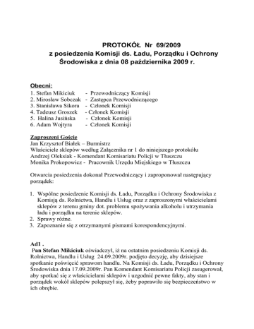 PROTOKÓŁ Nr 69/2009 z posiedzenia Komisji ds. Ładu, Porządku i Ochrony Środowiska z dnia 08 października 2009 r. Obecni: 1. Stefan Mikiciuk 2. Mirosław Sobczak 3. Stanisława Sikora 4. Tadeusz Groszek 5. Halina Jusińska 6. Adam Wojtyra - Przewodniczący Komisji - Zastępca Przewodniczącego - Członek Komisji - Członek Komisji - Członek Komisji - Członek Komisji Zaproszeni Goście Jan Krzysztof Białek – Burmistrz Właściciele sklepów według Załącznika nr 1 do niniejszego protokółu Andrzej Oleksiak - Komendant Komisariatu Policji w Tłuszczu Monika Prokopowicz - Pracownik Urzędu Miejskiego w Tłuszczu Otwarcia posiedzenia dokonał Przewodniczący i zaproponował następujący porządek: 1. Wspólne posiedzenie Komisji ds. Ładu, Porządku i Ochrony Środowiska z Komisją ds. Rolnictwa, Handlu i Usług oraz z zaproszonymi właścicielami sklepów z terenu gminy dot. problemu spożywania alkoholu i utrzymania ładu i porządku na terenie sklepów. 2. Sprawy różne. 3. Zapoznanie się z otrzymanymi pismami korespondencyjnymi. Ad1 . Pan Stefan Mikiciuk oświadczył, iż na ostatnim posiedzeniu Komisji ds. Rolnictwa, Handlu i Usług 24.09.2009r. podjęto decyzję, aby dzisiejsze spotkanie poświęcić sprawom handlu. Na Komisji ds. Ładu, Porządku i Ochrony Środowiska dnia 17.09.2009r. Pan Komendant Komisariatu Policji zasugerował, aby spotkać się z właścicielami sklepów i uzgodnić pewne fakty, aby stan i porządek wokół sklepów polepszył się, żeby poprawiło się bezpieczeństwo w ich obrębie. Pan Mikiciuk Stefan oddał głos Panu Komendantowi Andrzejowi Oleksiakowi. Pan Komendant pozwolił sobie zauważyć, iż organizacja tego spotkania to duże osiągnięcie. Można postawić wniosek, że Ci Państwo, którzy przybyli nie są adresatami policji. Pan Komendant poprosił, aby do prasy lokalnej wpłynął wniosek z pierwszego spotkania by nagłośnić całą sytuację. Dalej kontynuował, iż szeroko pojęty ład i porządek jest w interesie naszym wspólnym. Moją inicjatywą było to, że po osobistym rekonesansie w terenie zrobiłem listę sklepów, które zakłócają już wspomniany ład i porządek. Jest mi wstyd, gdy muszę interweniować lub pouczać starsze ode mnie osoby, jak trzeba się zachowywać. Jak Państwo uważacie,czy właściciel sklepu przed otwarciem powinien uprzątnąć, pozagrabiać teren wokół? Mówiąc bardzo dobitnie, są miejsca gdzie wstyd jest iść w „ogumionych” butach do kolan. Najbardziej niepokojące miejsca to m.in.: Centrum Tłuszcza ul. Warszawska sklep „Oleńka”, sklep P. Wierzby na Ołdakach, sklep przy rondzie w Miąsem? Chciałbym, żeby to się zmieniło, zaczynając od sprzątania, od tych najdrobniejszych szczegółów a kończąc na monitoringu. Nawiązując do wspomnianego monitoringu, chciałbym podkreślić, że działa to w dwie strony i dla bezpieczeństwa właściciela sklepów oraz dla samych klientów. Chciałbym Państwa zapewnić, że gdy zostanie podjęta decyzja o zainstalowaniu monitoringu, przyniesie to efekty. Komendant przytoczył pewien przykład dla zobrazowania przydatności kamer: dokonano kradzieży aut na pewnej posesji, która nie była ogrodzona, po zgłoszeniu na Komendę o zaistniałej sytuacji właściciel na drugi dzień podczas oględzin przez policję rozpoczął budowę ogrodzenia, bo zrozumiały jest fakt, że miejsce niezabezpieczone jest celem w pierwszej kolejności dla złodzieja. Przestępczość wzrasta, np. kradzież portfeli, torebek, dokumentów to nie przypadki. Monitoring byłby dla Państwa i państwa klientów bardzo wygodnym i korzystnym rozwiązaniem. Mógłby być wykorzystywany także podczas wyjaśniania spraw konfliktowych w czasie dochodzeń policyjnych. W gminie Tłuszcz tzw. „ściana wschodnia” dominują przestępstwa związane ze spożywaniem alkoholu. Należy zaprzestać sprzedaży alkoholu osobom nietrzeźwym oraz nieletnim, ze szczególnym uwzględnieniem sklepów położonych w pobliżu placówek oświatowych, ograniczając grupę docelową możemy zmniejszyć liczebność wypadków. Nagminnym i bardzo rażącym problemem jest sprzedaż alkoholu nieletnim. Właściciele sklepów, które znajdują się w sąsiedztwie szkół znają uczniów wiedzą, że są oni niepełnoletni, a mimo to sprzedają im papierosy i alkohol. W Tłuszczu pojawia się również problem osób żebrzących, trzeba starać się im pomóc. W takich przypadkach najlepiej poinformować policję lub opiekę społeczną, aby interweniowała. W sklepach powinny w widocznym miejscu wisieć tabliczki o zakazie sprzedaży wyrobów alkoholowych i tytoniowych młodzieży i osobom nietrzeźwym, są to wymogi formalne, które trzeba przestrzegać. 2 Pani Hanna Kurek odnoszę się do tego, co powiedział Pan Komendant nie tylko jako przewodnicząca Komisji ds. Rolnictwa, Handlu i Usług, ale również jako właściciel sklepu z 18 letnim stażem, chcę zaznaczyć, że nie sprzedaję nieletnim alkoholu, ale jeżeli przychodzi dorosła osoba i kupuje alkohol lub papierosy dla nieletniego to nie mam prawa mu zabronić zakupu. Niestety dzięki „życzliwym dorosłym” młodzież ma dostęp do tych wyrobów. Staram się utrzymać ład i porządek i zdaje sobie sprawę z tego, że sprzedając wszystko z kaucją i zabraniając spożycia alkoholu w obrębie sklepu mam mniejszy zbyt, ale gdyby przedsiębiorcy sprzedawali z kaucją wyroby alkoholowe i przestrzegali przepisów również w związku ze sprzedażą wyrobów tytoniowych to problem byłby na mniejszą skale rozpowszechniony. Pan Stefan Mikiciuk, stwierdził z własnych obserwacji, iż właściciele sklepów, które zlokalizowane są na terenach wiejskich, znają swoich klientów, gdyż często są oni mieszkańcami tych miejscowości, a mimo to sprzedają alkohol bez ograniczeń, często do momentu skrajnego upojenia alkoholowego przez klienta. Z okien niektórych budynków szkół widać obręb sklepu, na którym tułają 